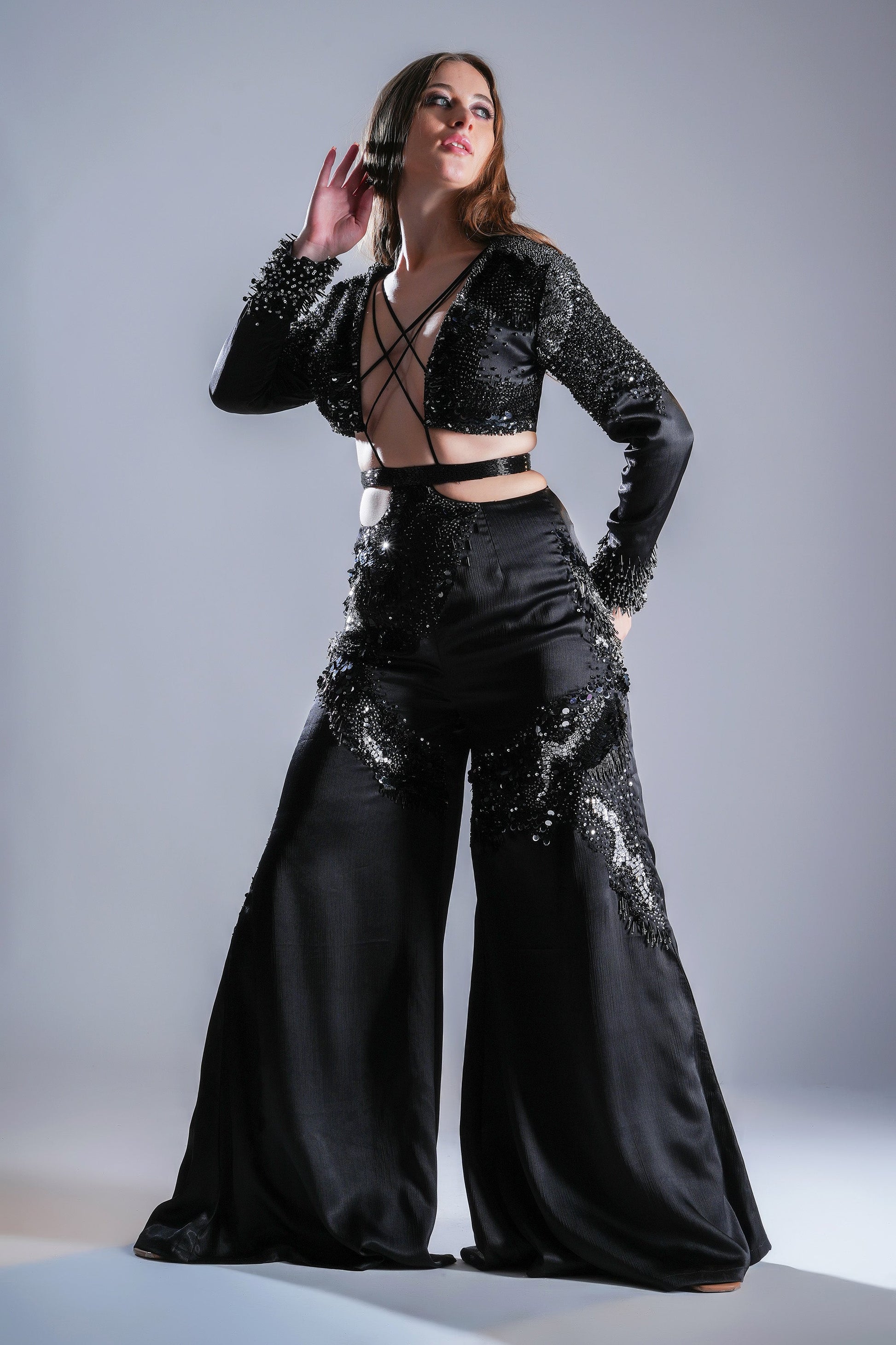 A black jumpsuit featuring an intricate strap design and wide-leg pants with glistening glass beads and intricate sequins embellishment. The jumpsuit is bold yet delicate making it a sophisticated and thought-provoking statement piece.