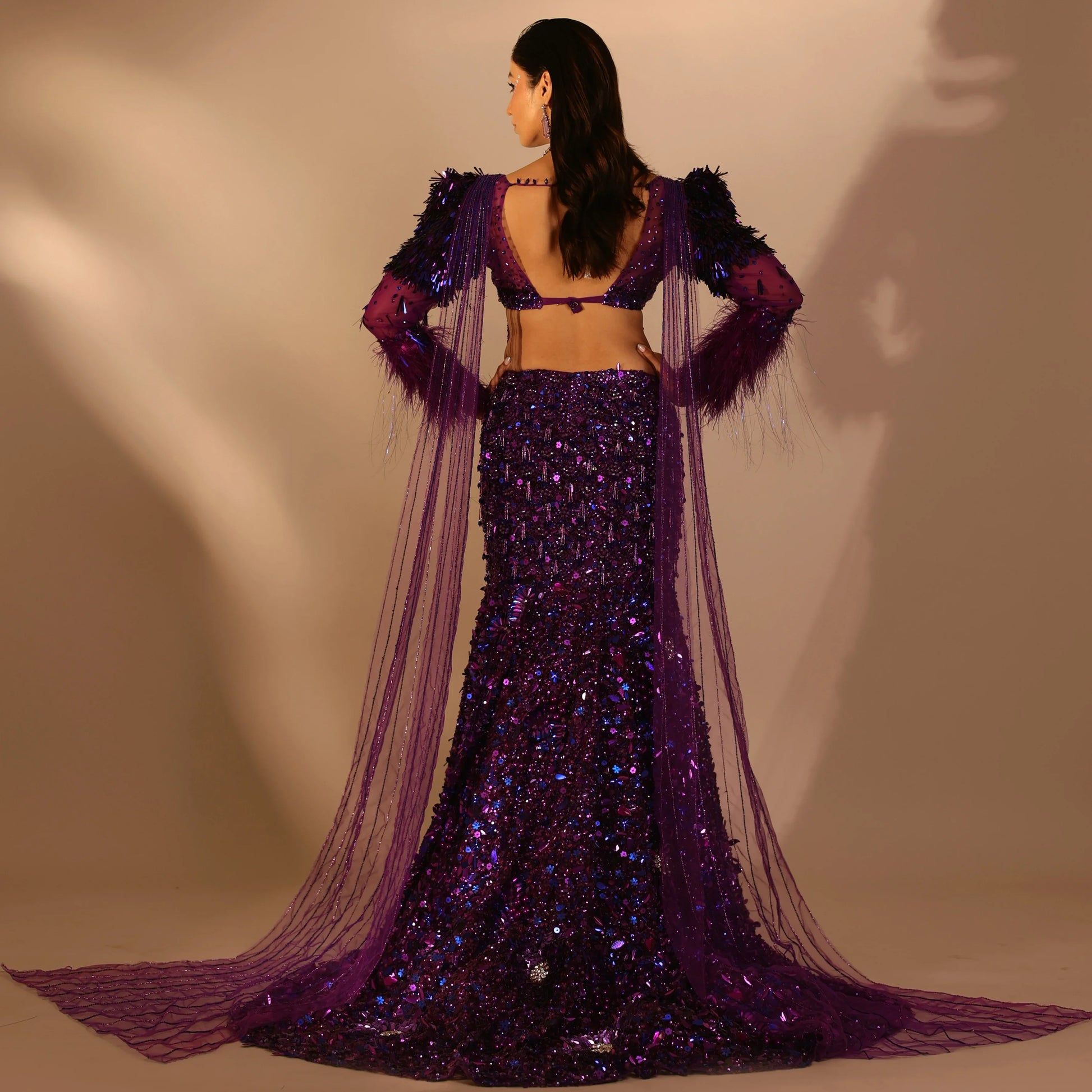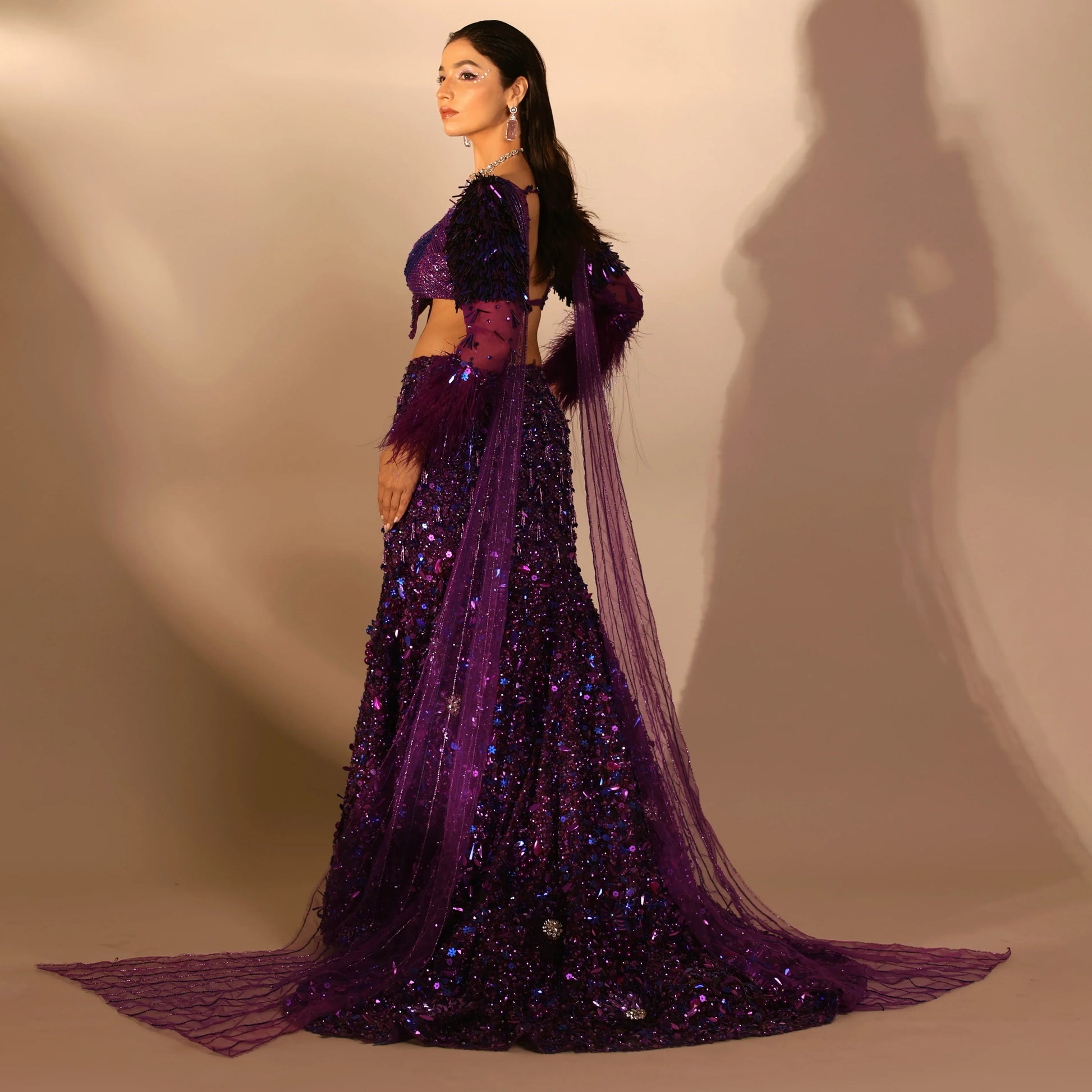 Featuring Heavily hand embroidered monotone trail fish cut Lehenga. Paired with embroidered blouse with attached net cape