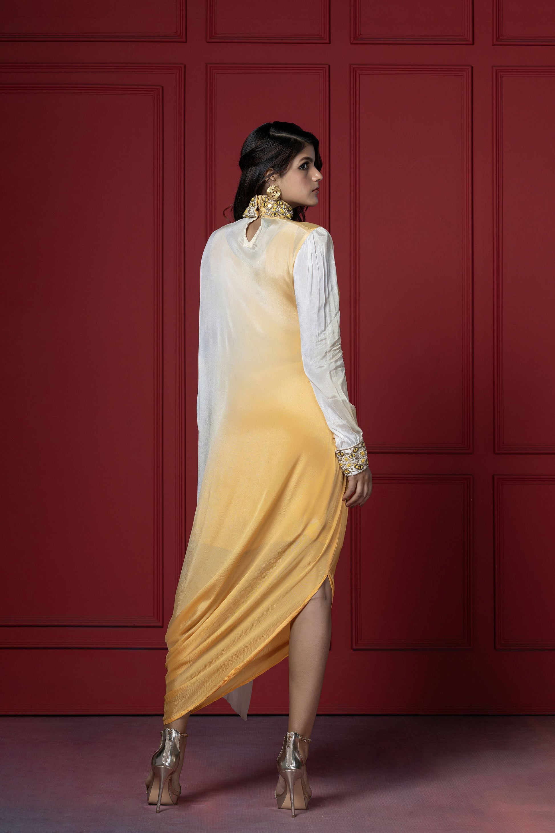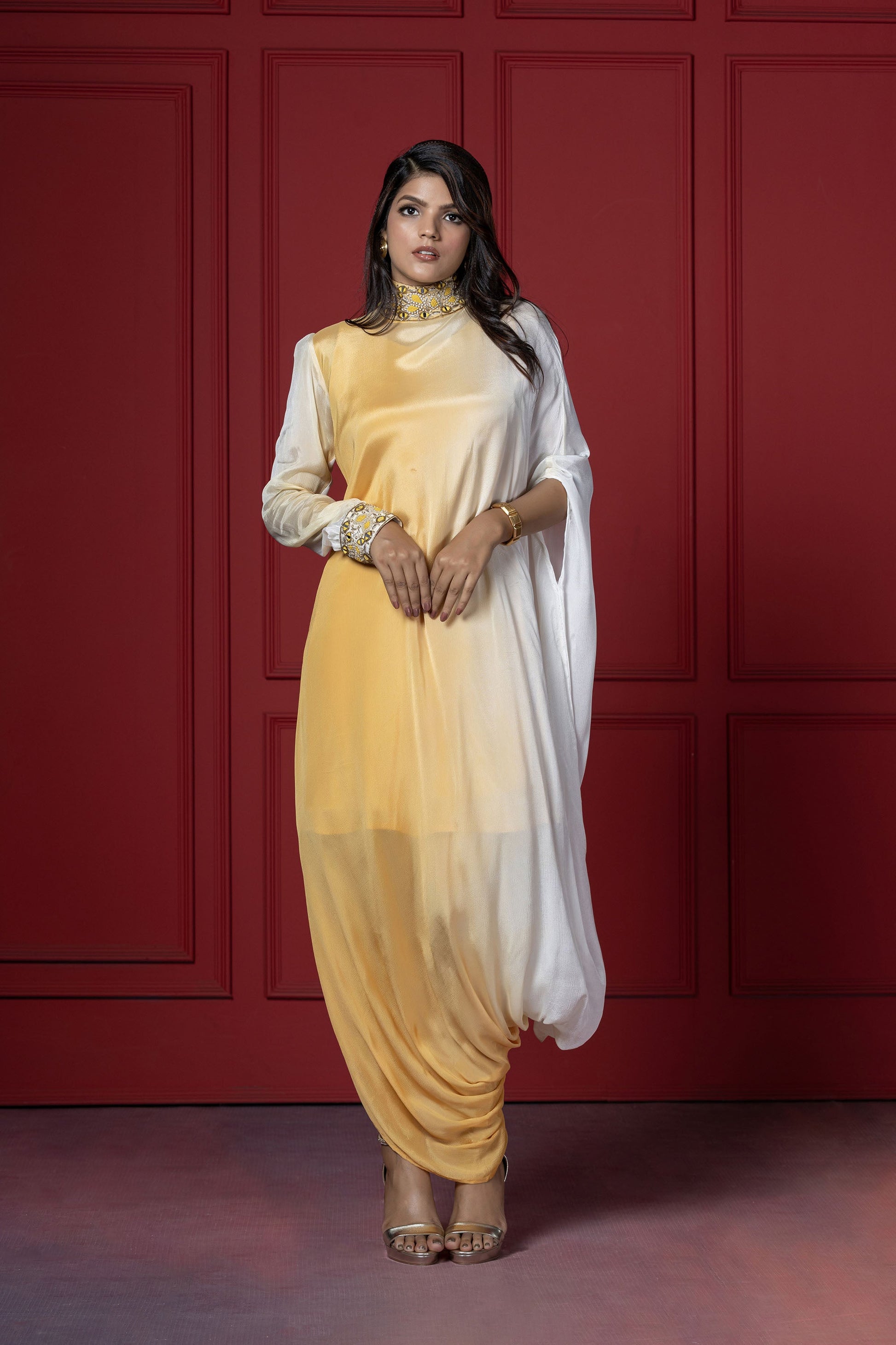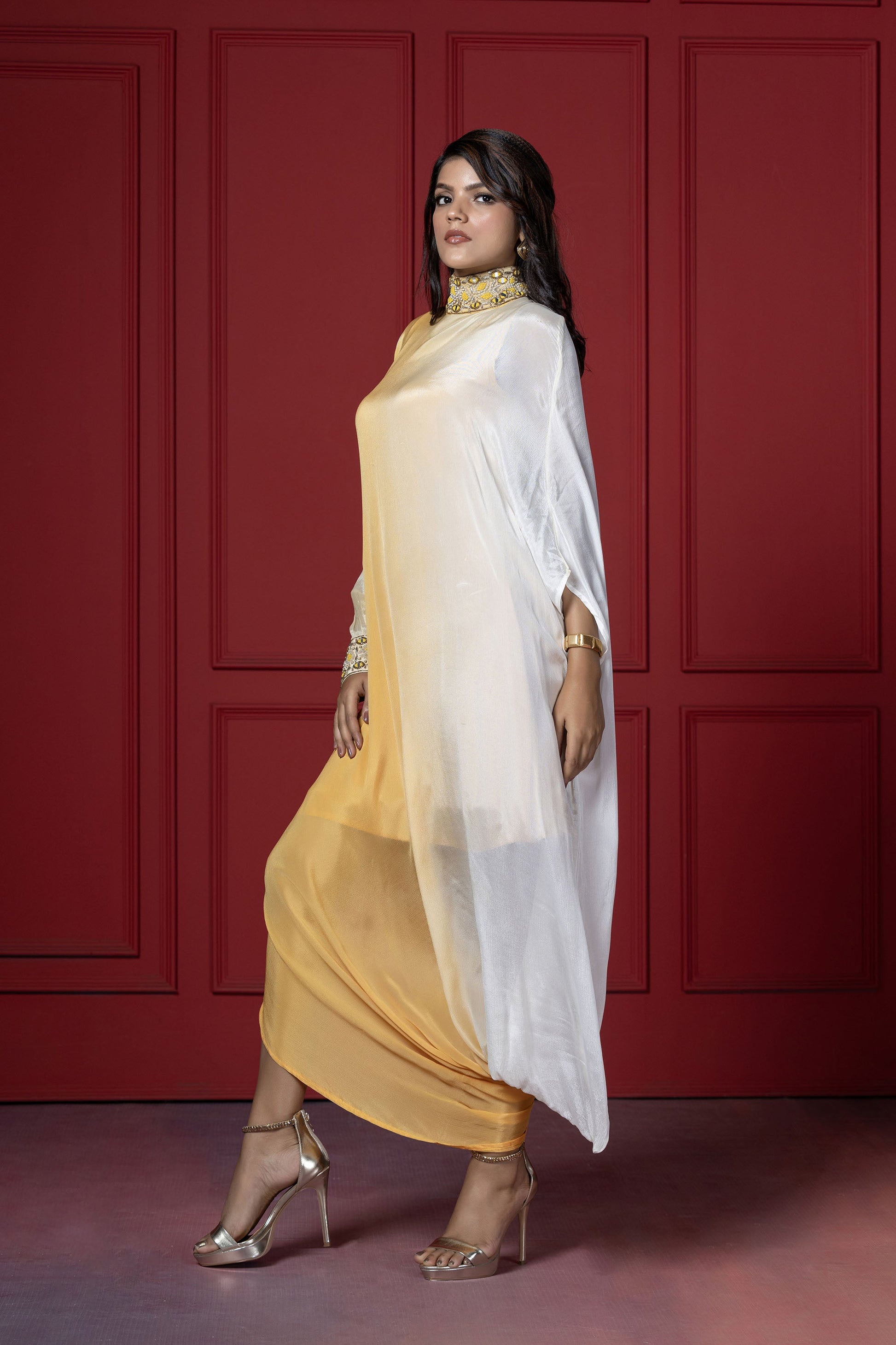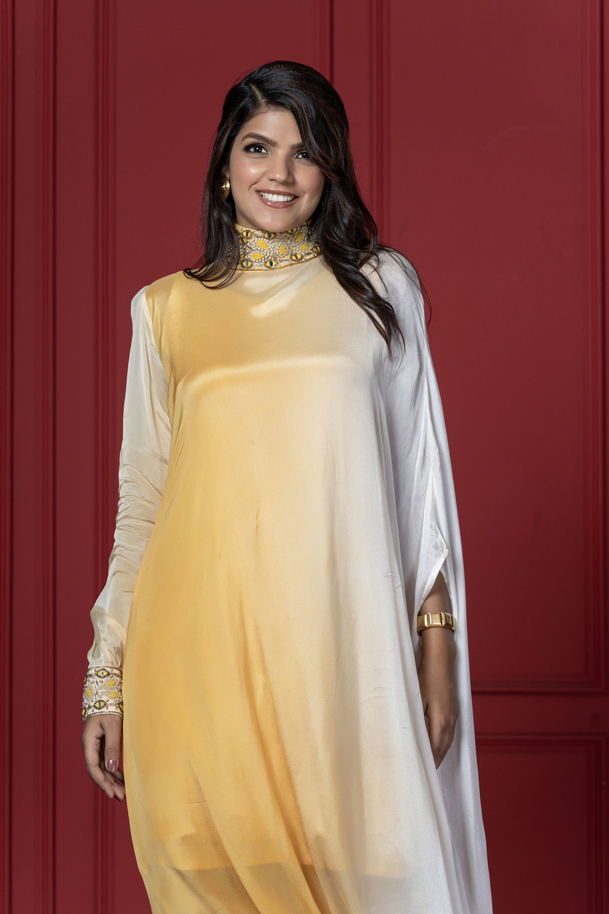 The vibrant color transition from left to right is remarkable creating a stunning visual effect. The kaftaan has sheer quality adding an ethereal touch with mirror and thread work