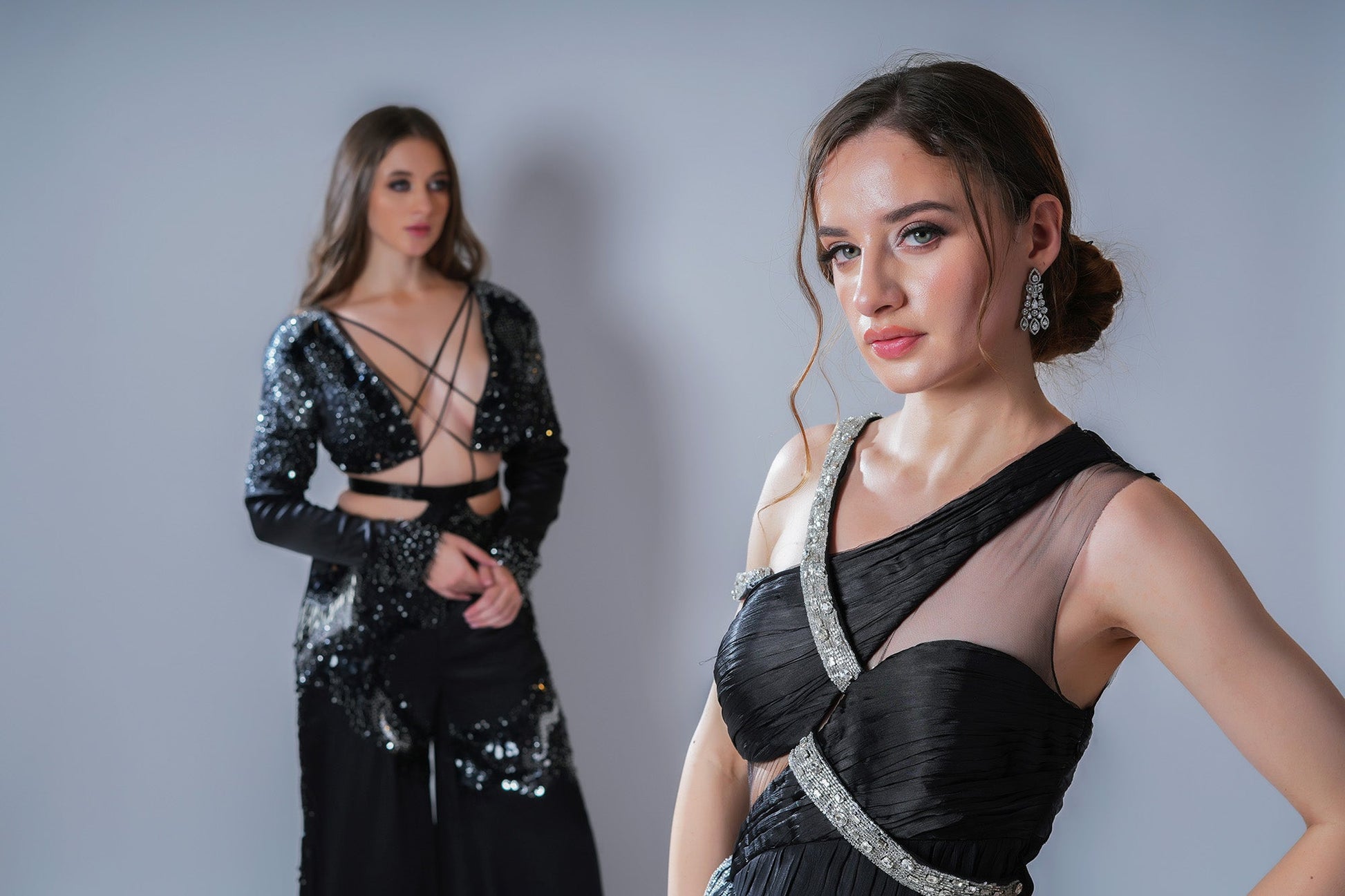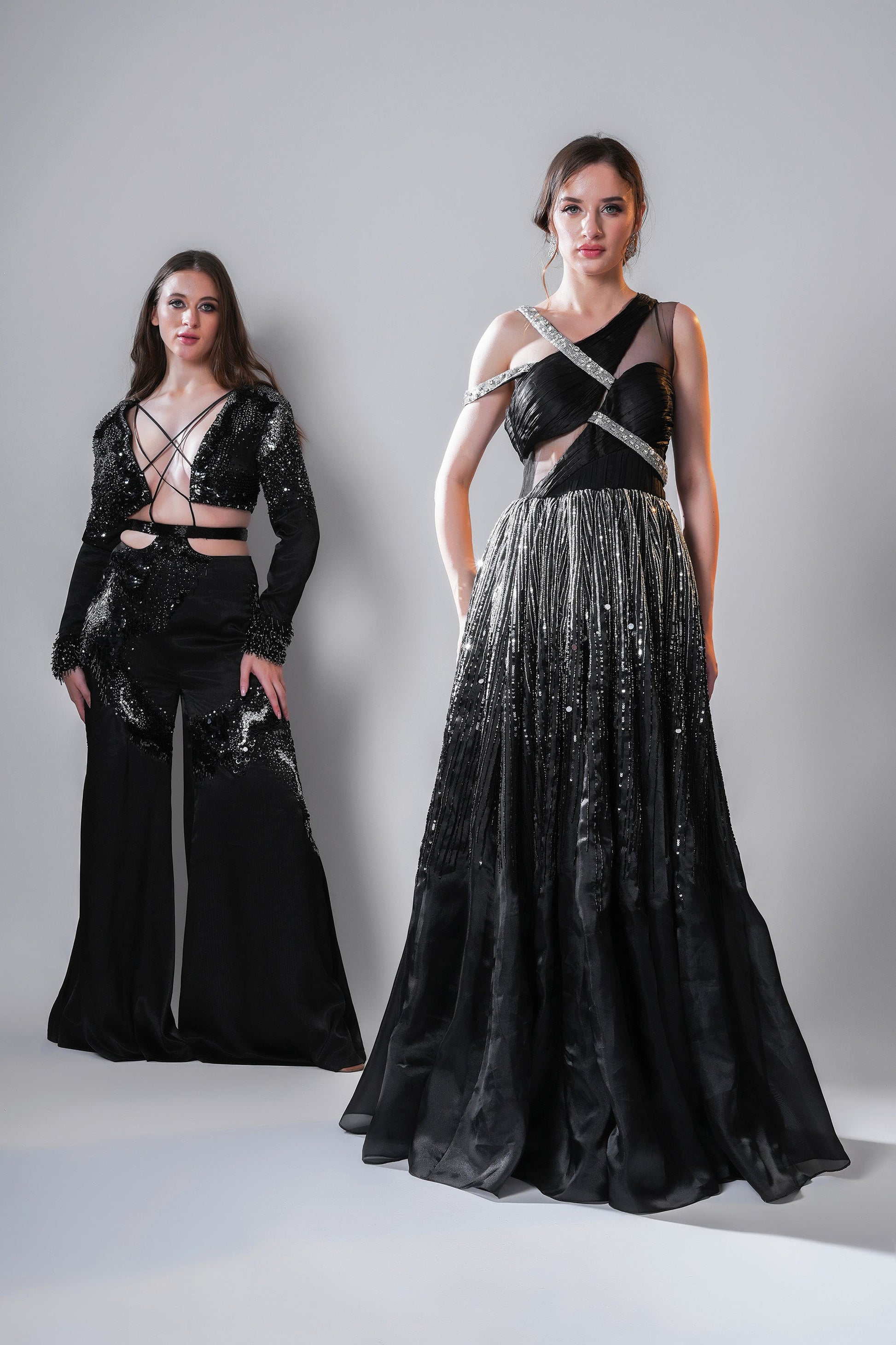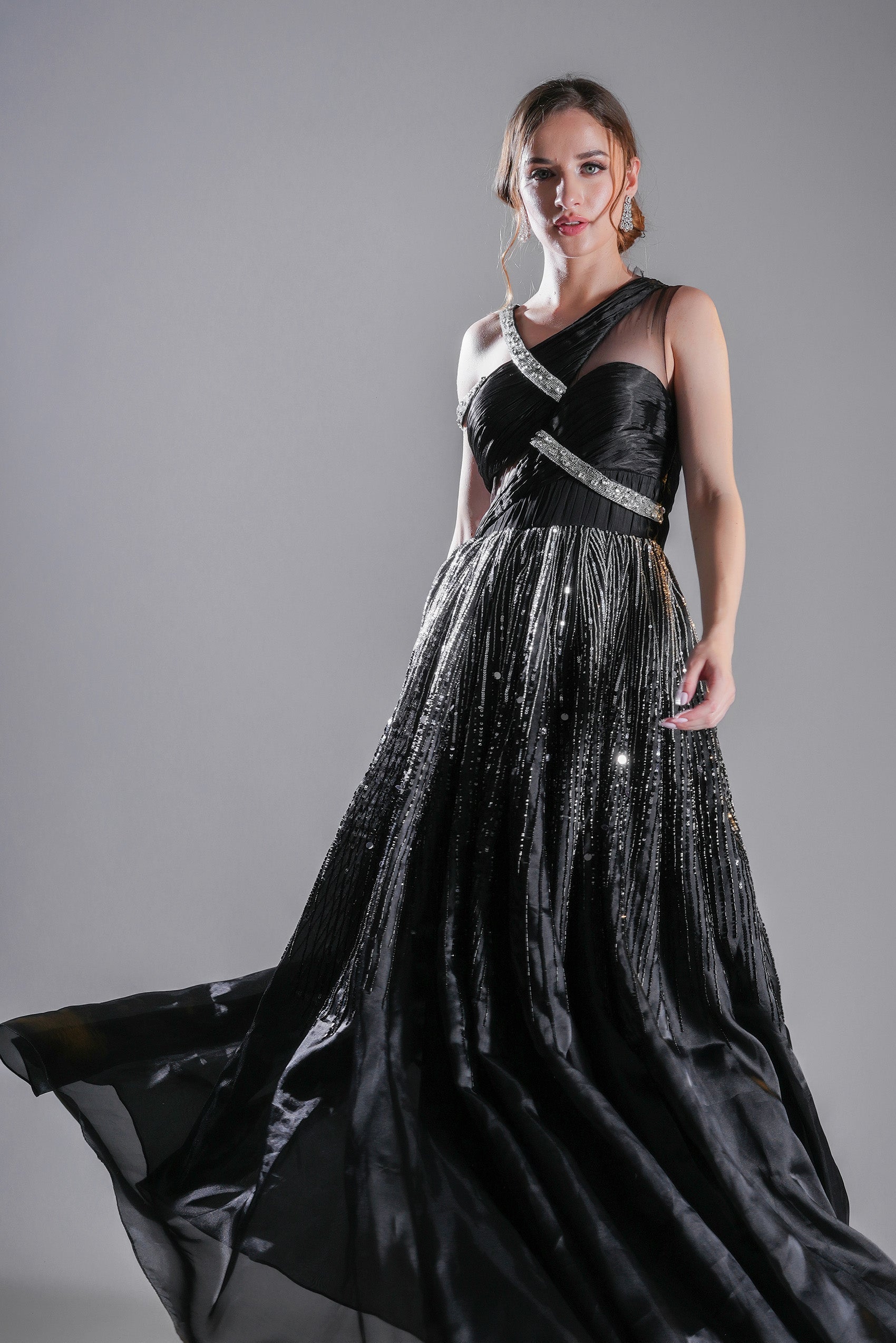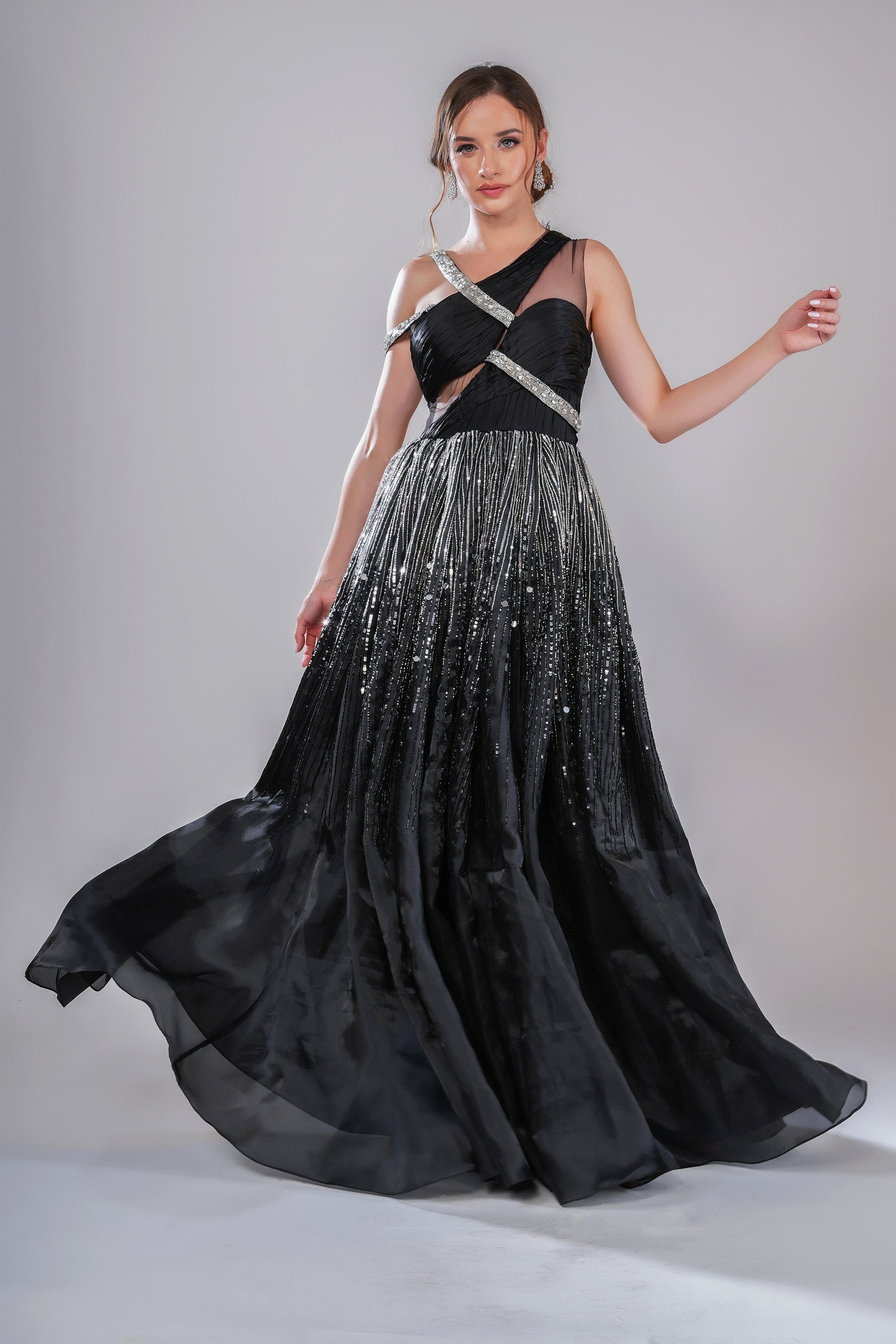 A black gown featuring an asymmetrical neckline with interwoven straps and a voluminous pleated skirt. The ombre effect from shimmering silver to deep black is filled with glistening beads and sequins, making it a thought-provoking statement piece.