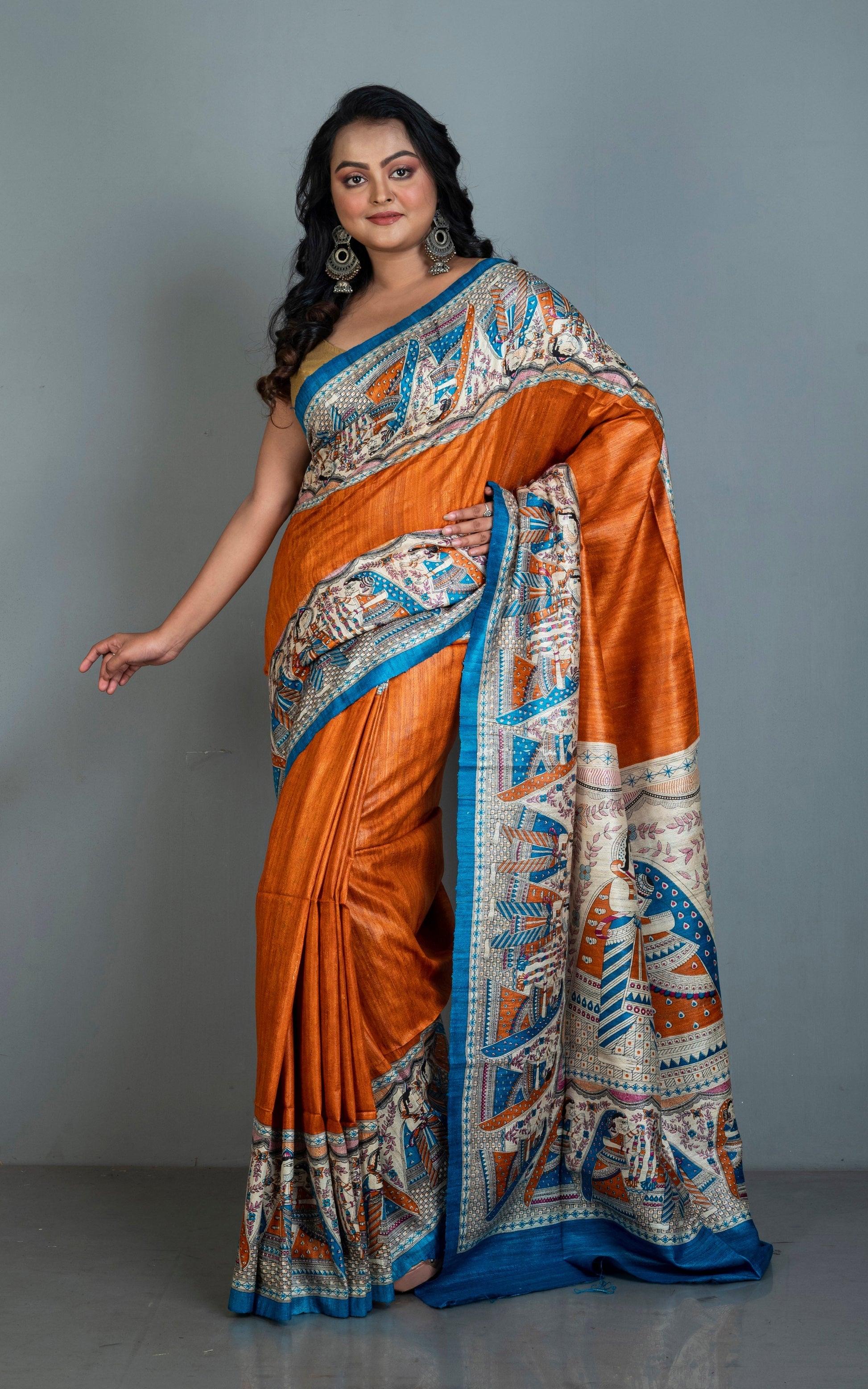 Traditional Tussar Gicha Kalamkari Saree in Rusty Orange, Blue, Hot Pink, Beige and Black