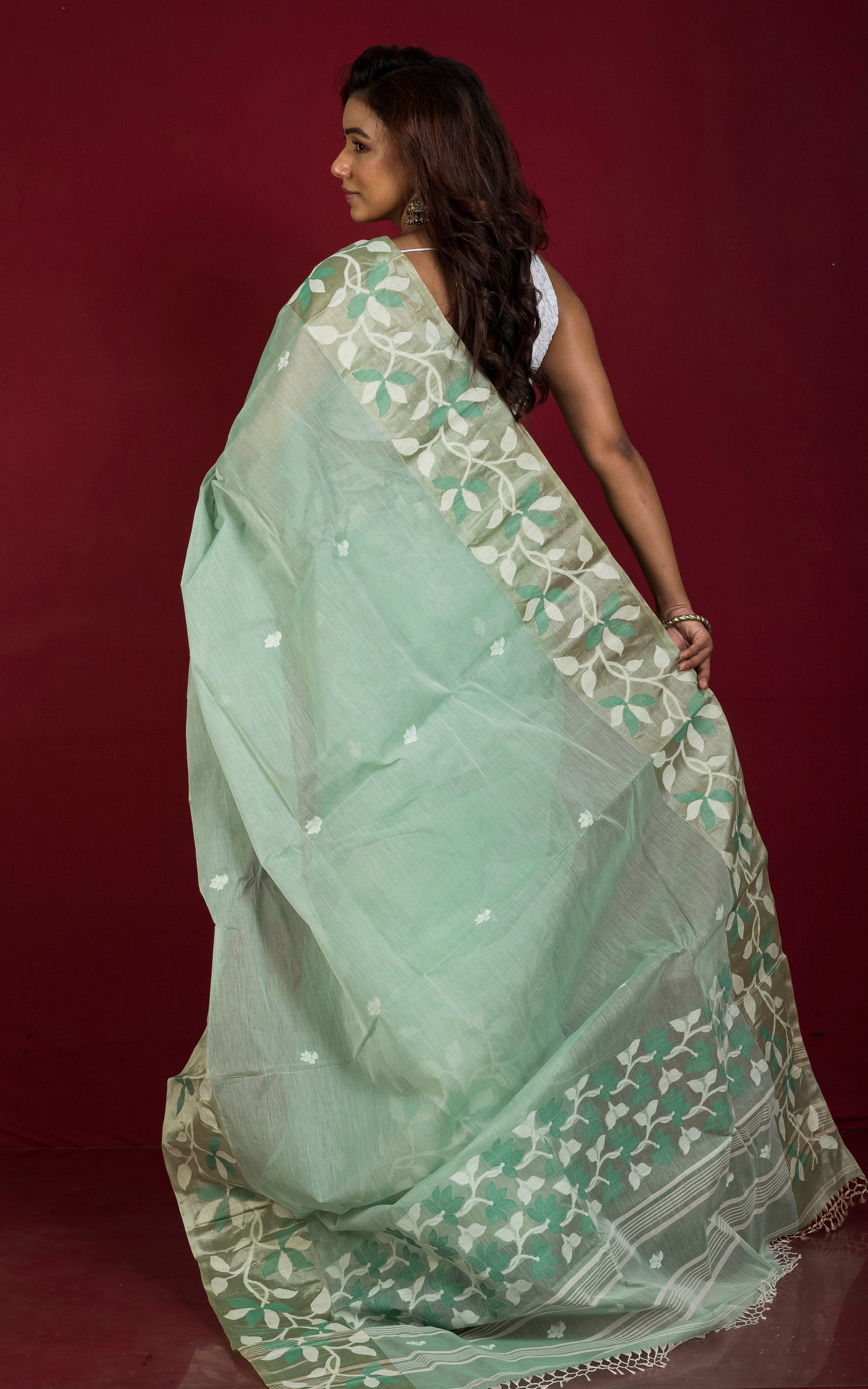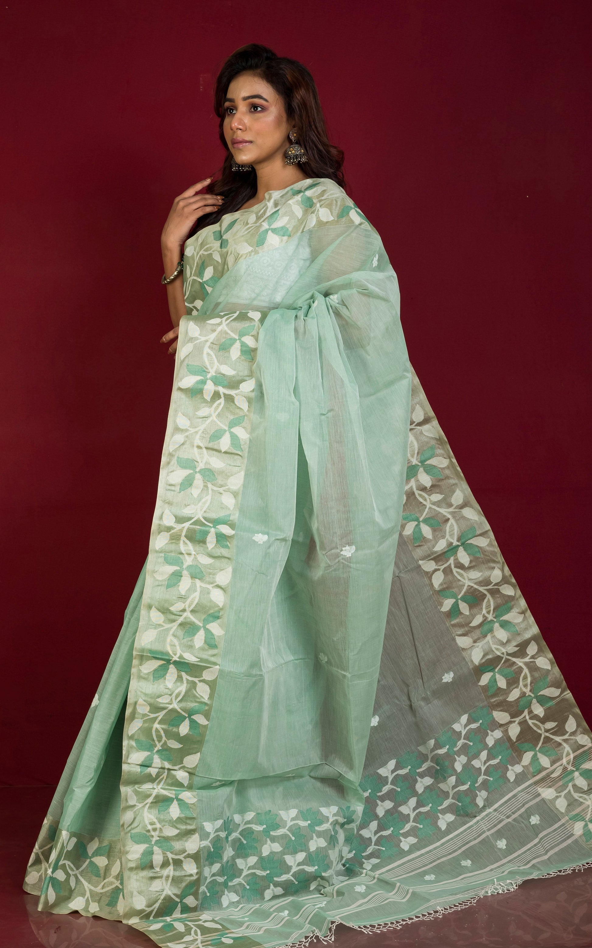 Tussar Silk Hand Woven Lotus Nakshi Border Cotton Dhakai Jamdani Saree in Sea green, Off White and Golden Beige