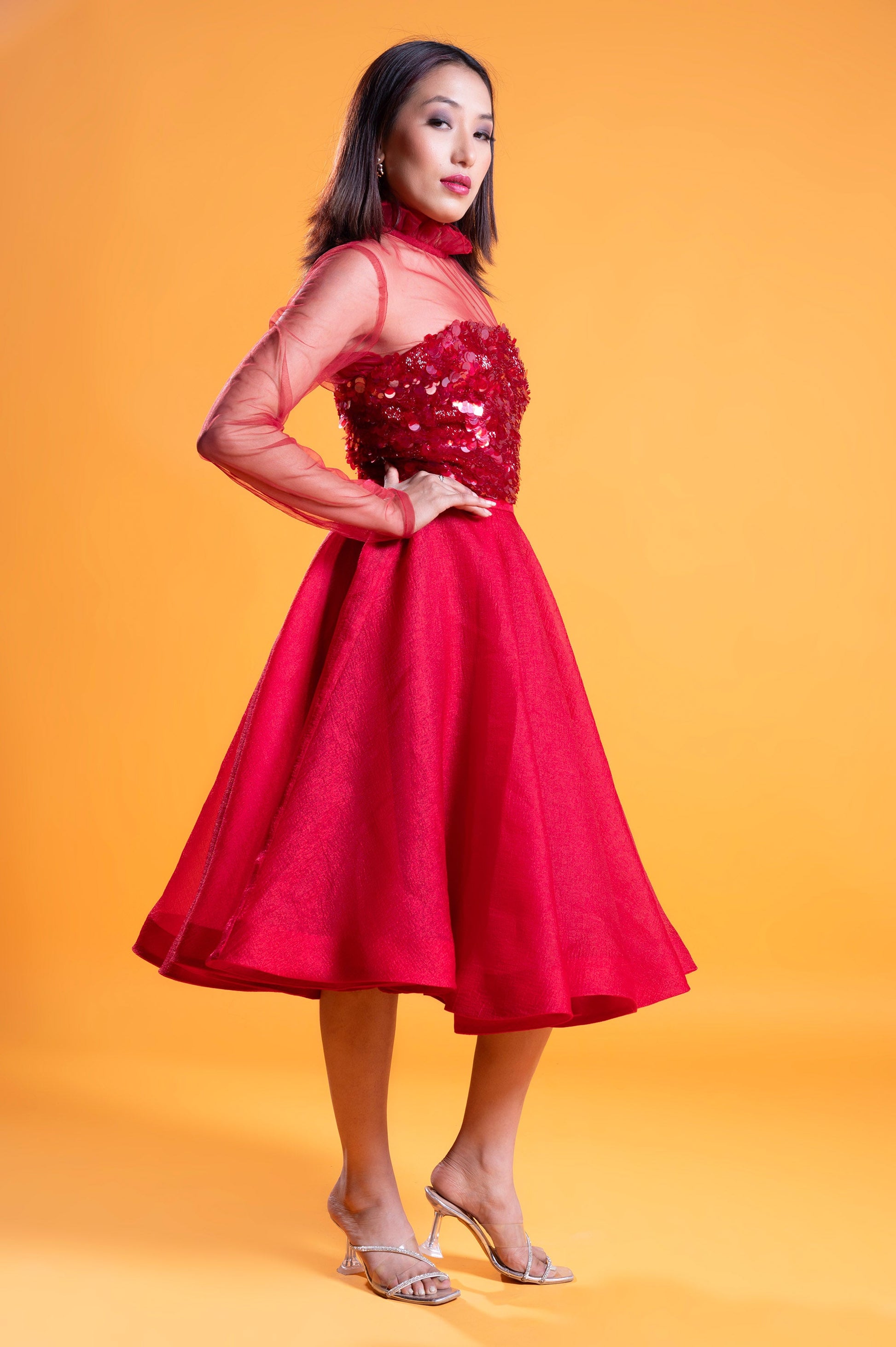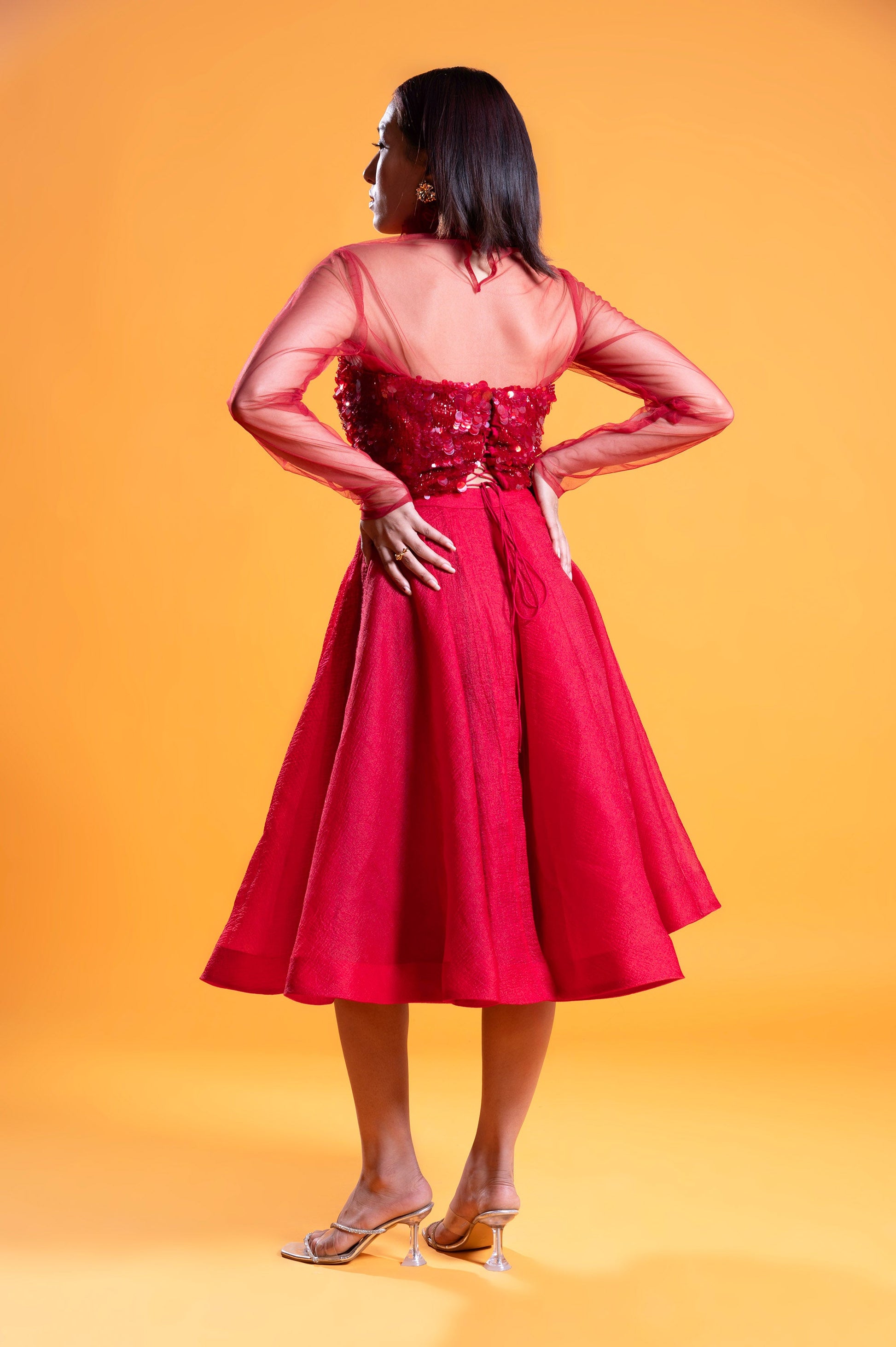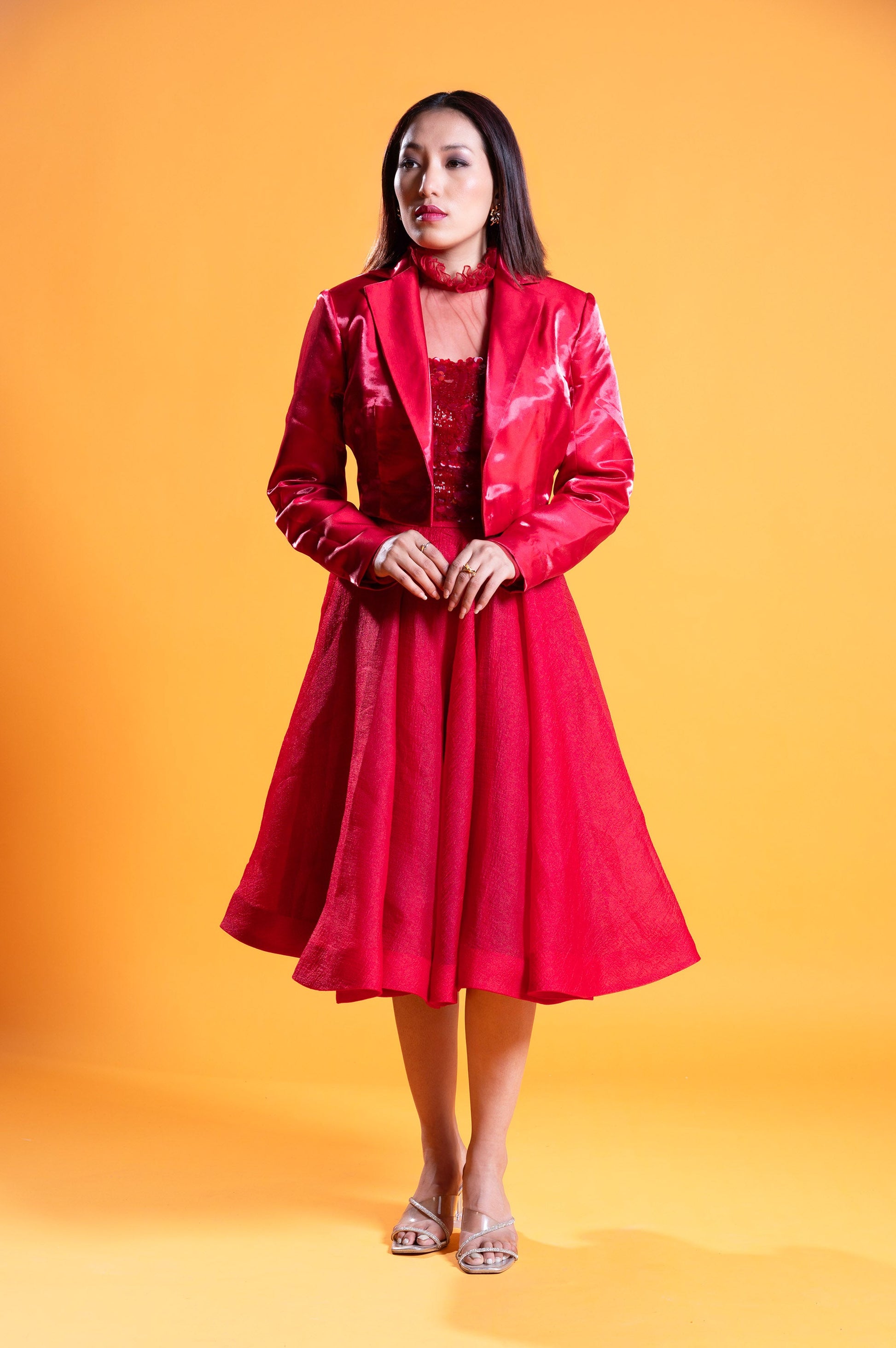 A bold red three-piece ensemble featuring a structured satin jacket, a embroidered coet, and a voluminous midi skirt.