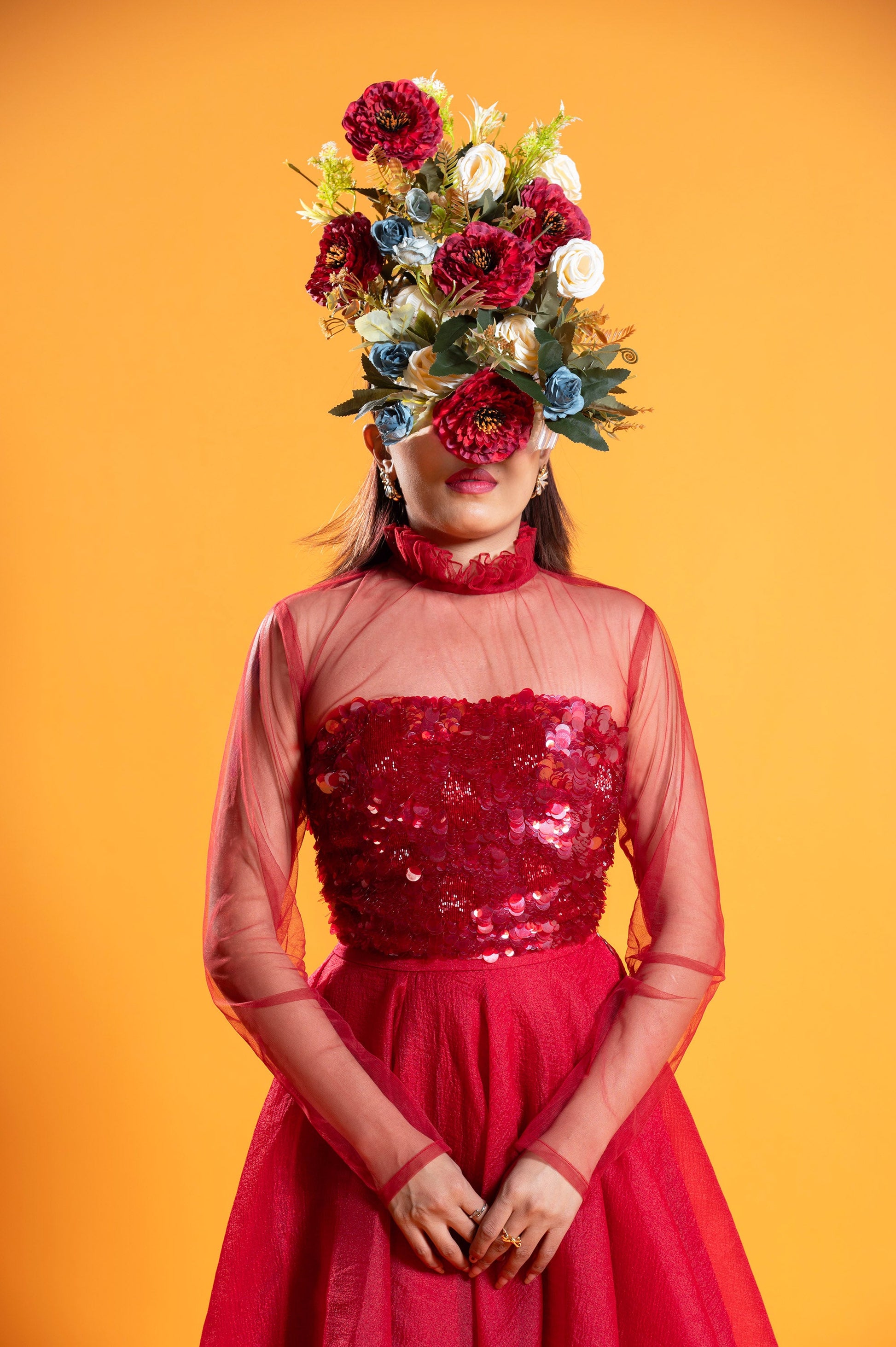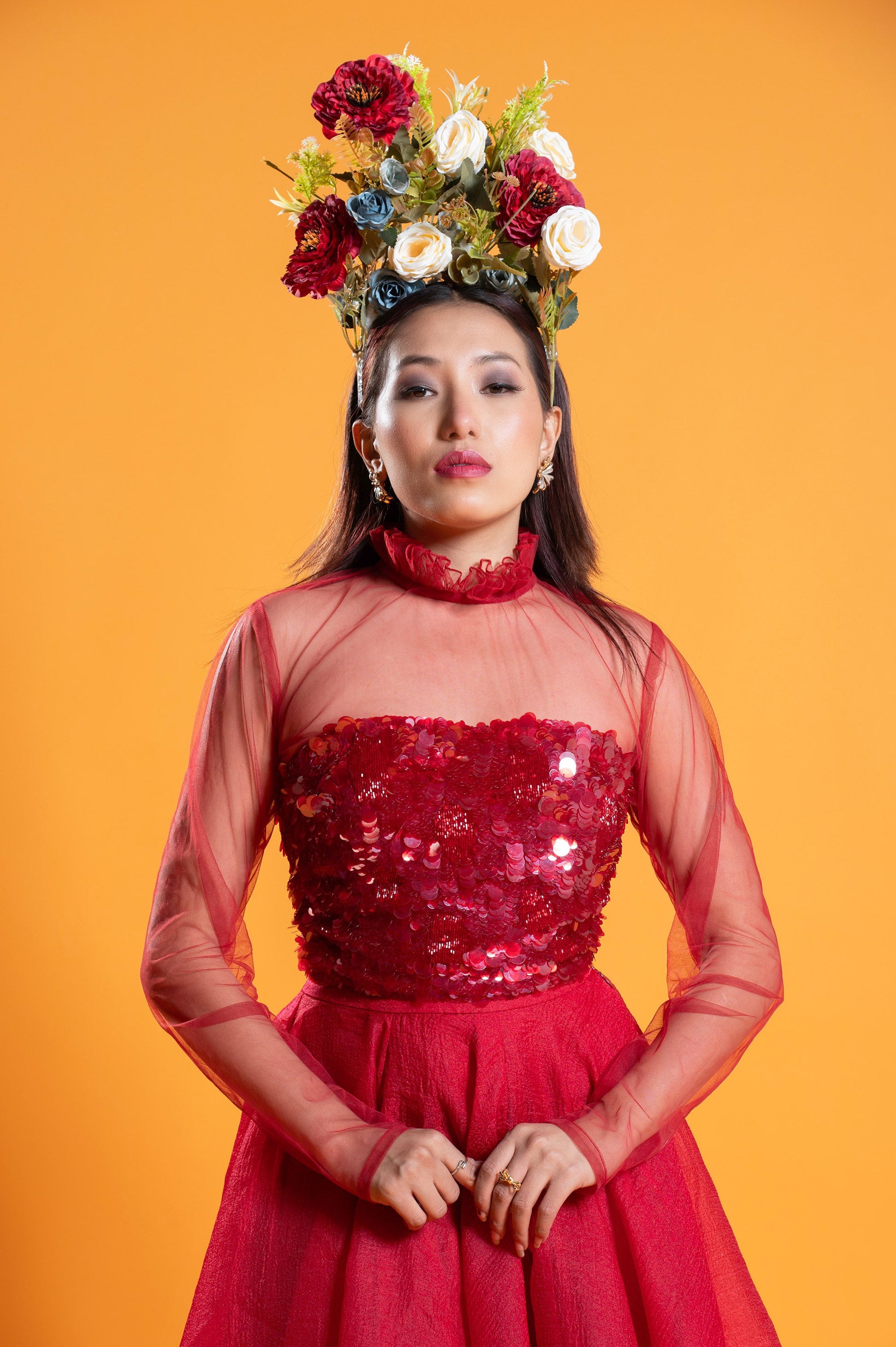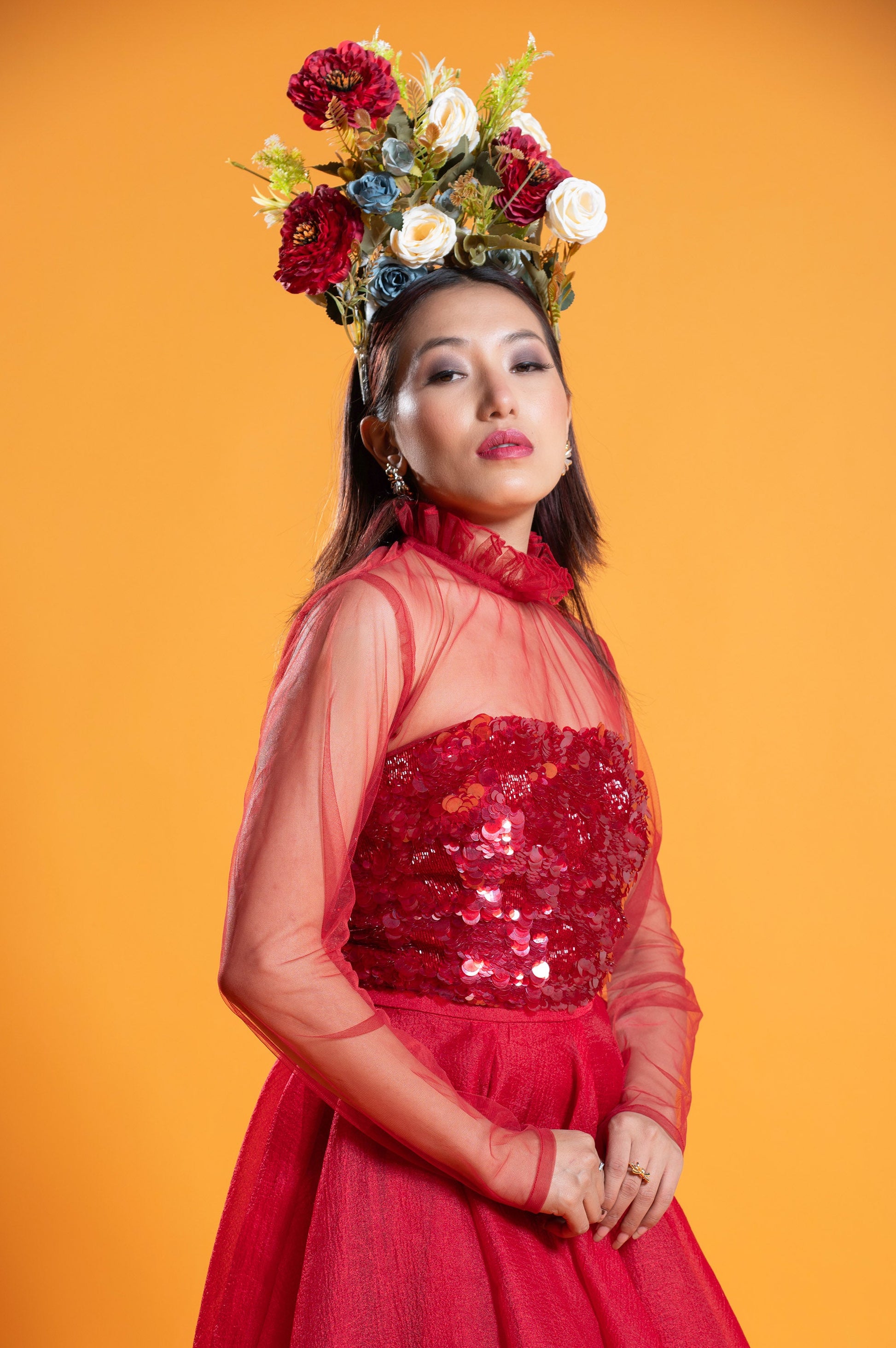 A bold red three-piece ensemble featuring a structured satin jacket, a embroidered coet, and a voluminous midi skirt.