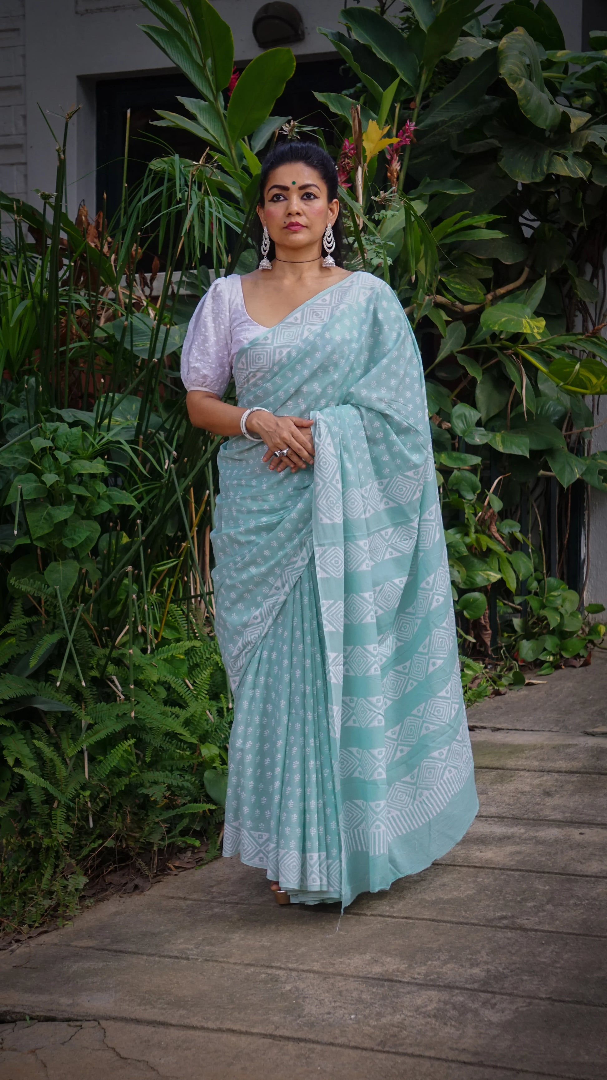 Whispering Dream Saree - Handblock Print Natural Dyed - Mint Mulmul Cotton Saree