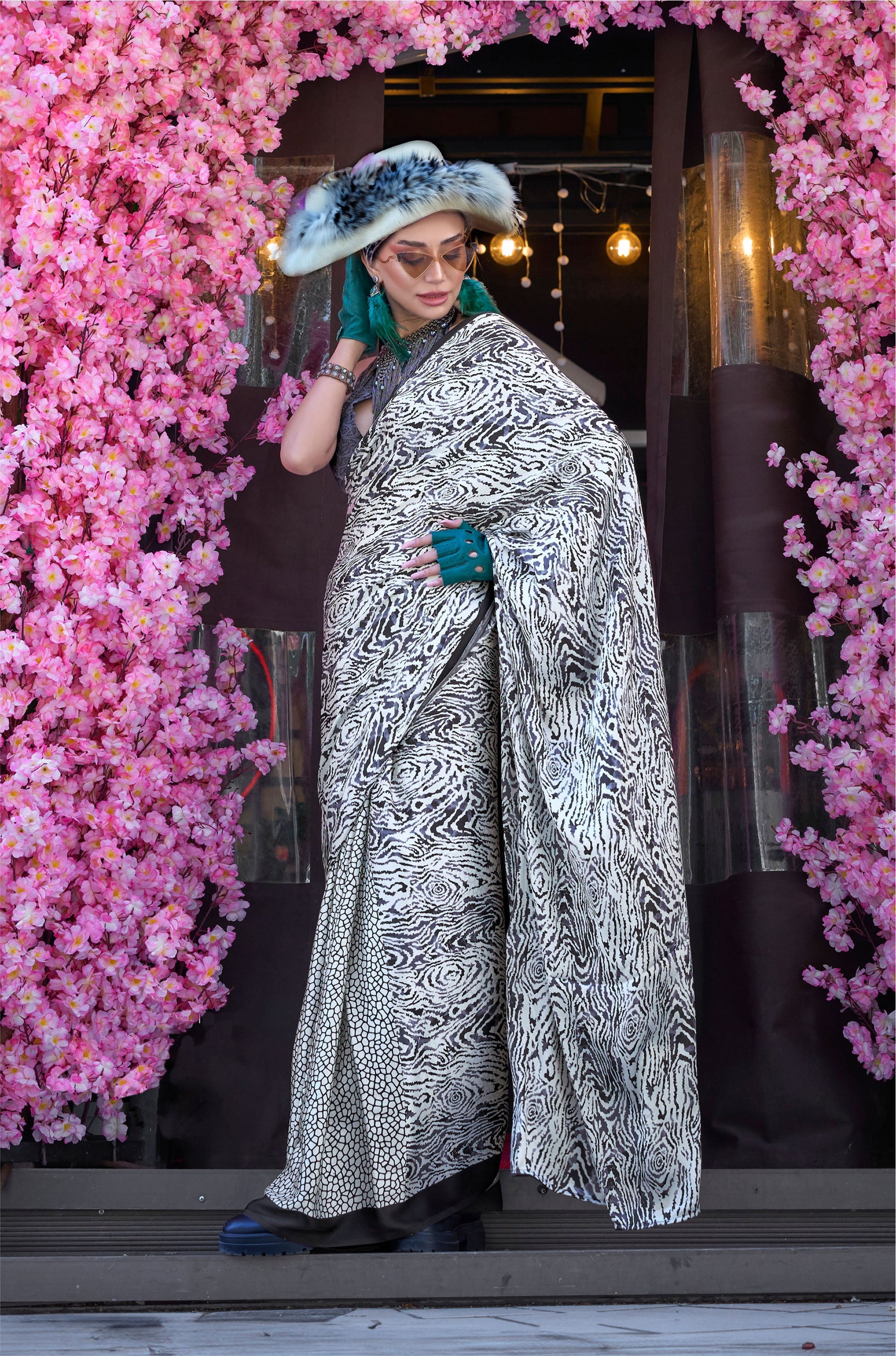 White and black Abstract Kazule Contemporary Satin Crepe Saree