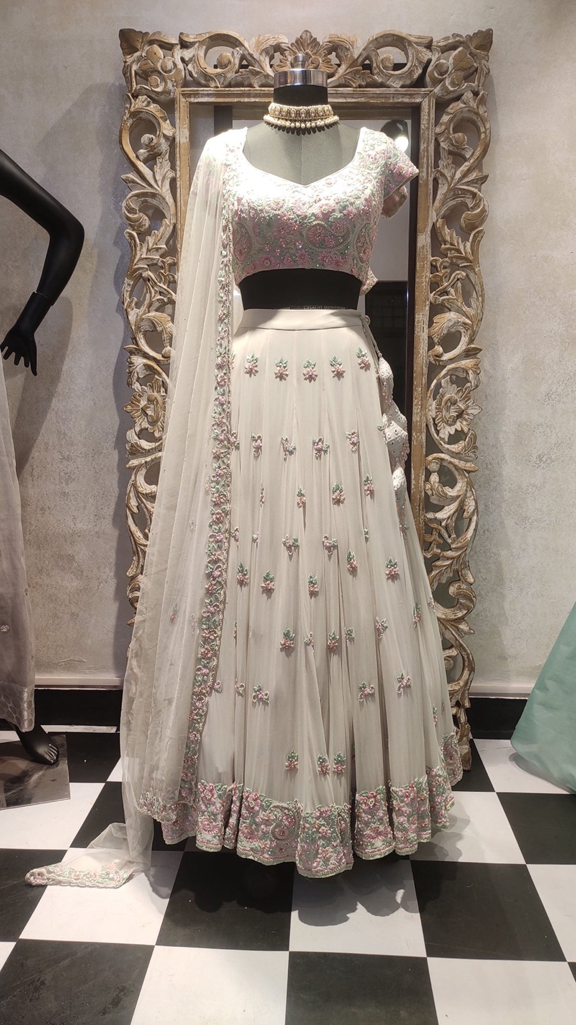 A chic white georgette lehenga adorned with delicate pink floral embroidery, exuding elegance and versatility, ideal for both weddings and sophisticated cocktail events.