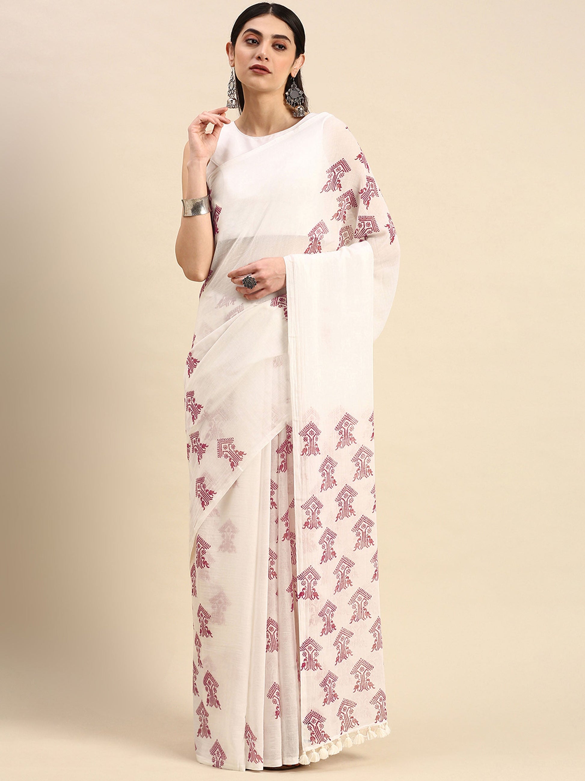 This white block printed mulmul cotton saree is delicate and and divinely soft on touch with red gos motifs on it.
