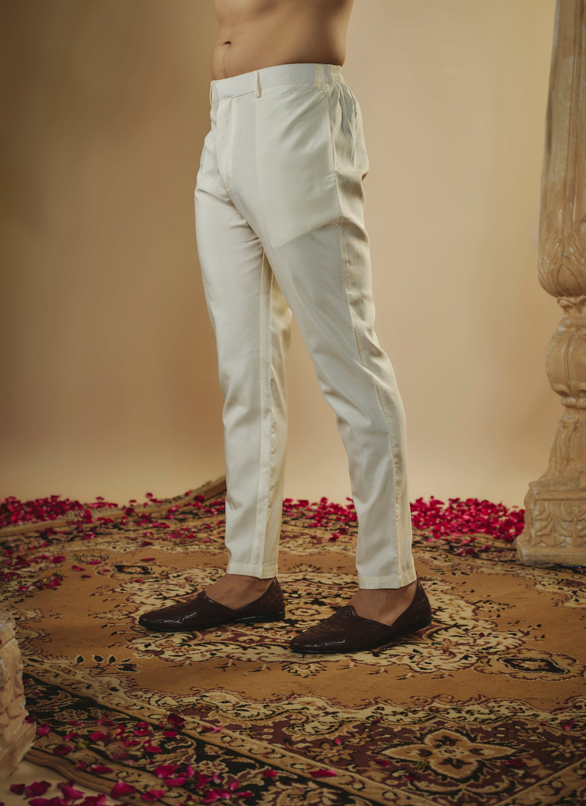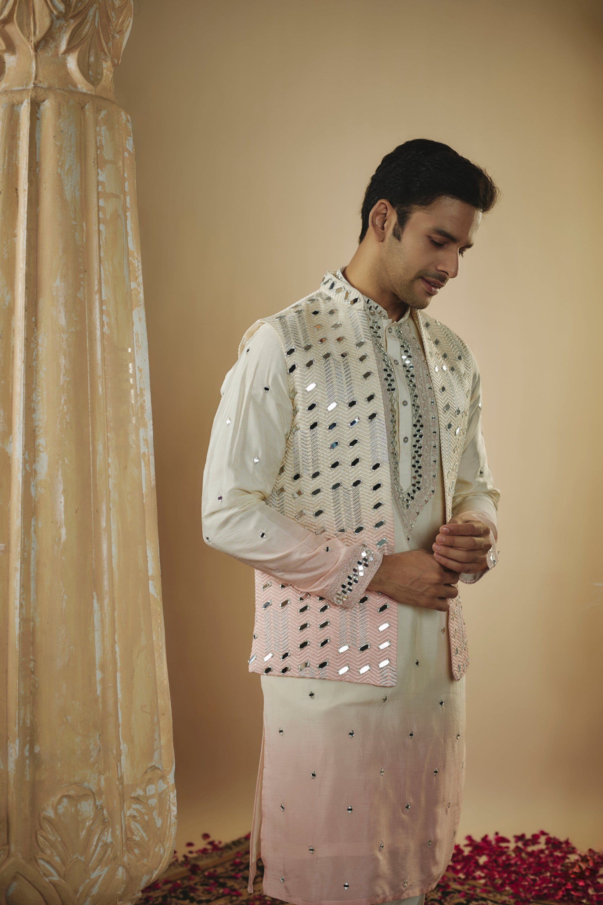 White pink ombre art silk mirror work kurta with with lucknowi jacket and pants.