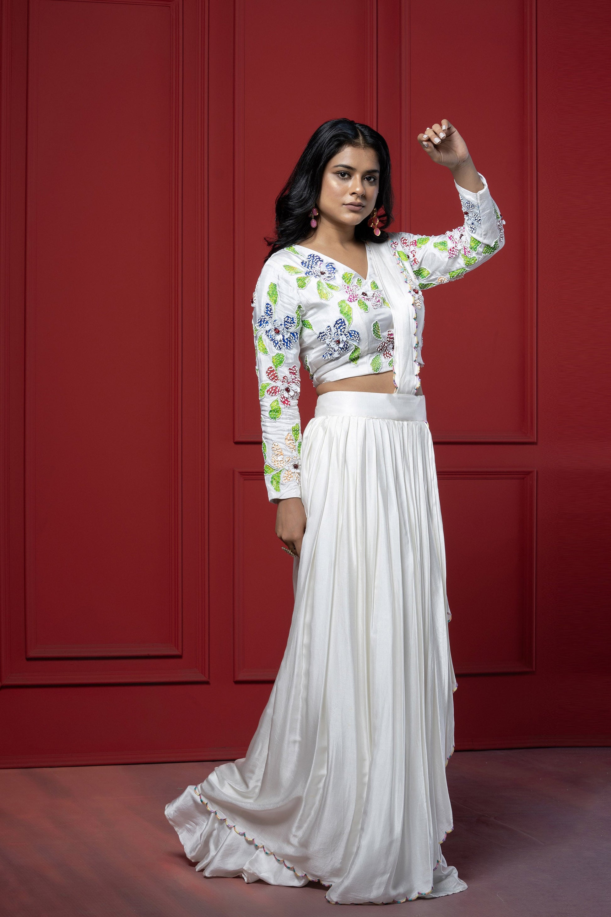 Hand painted blouse with added handwork highlight over the paint for added grace with a plain saree that has multi-coloured scales all over