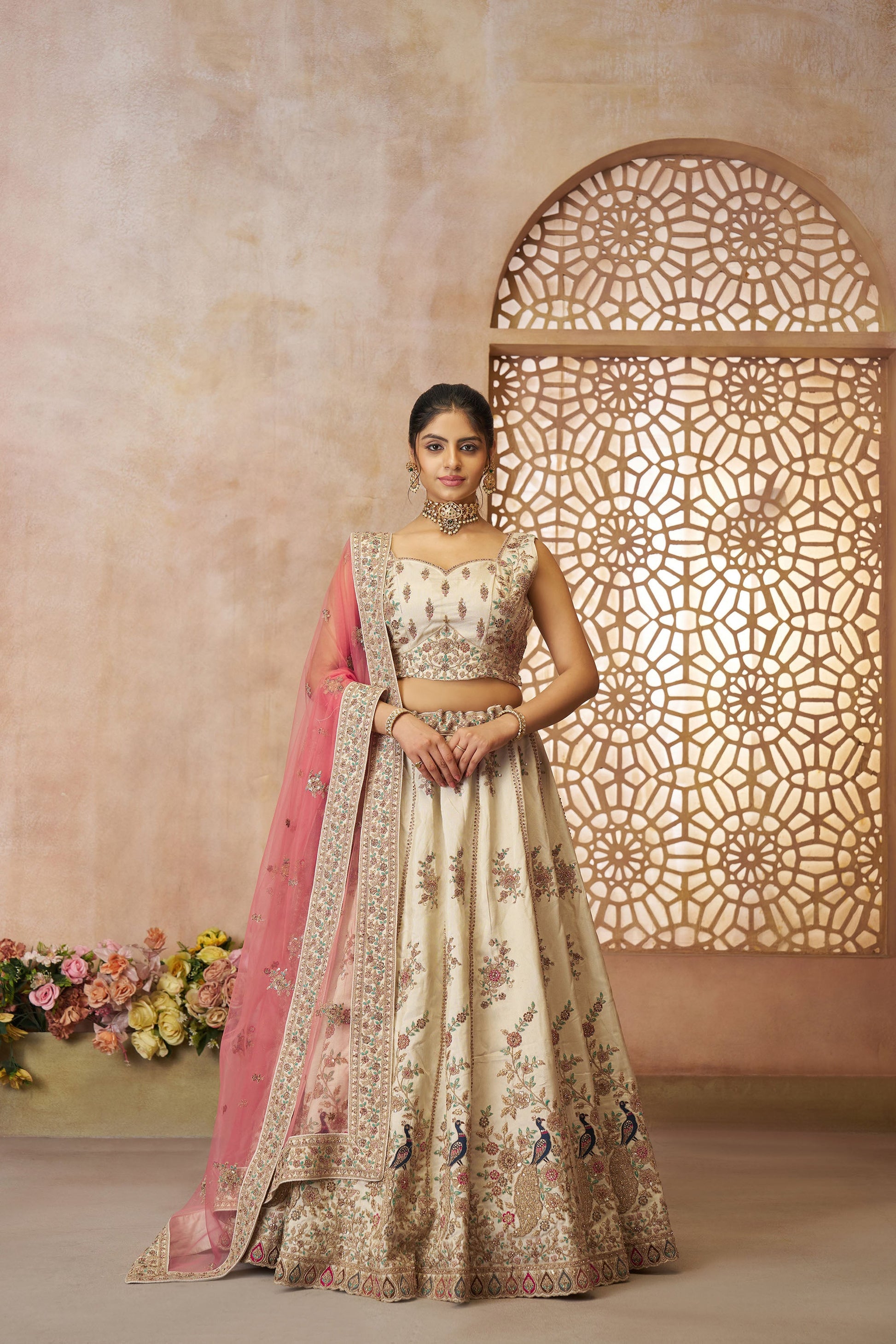 Grace any occasion draped in glamour with this beautiful Beige Extravaganza Lehenga. The rich zari silk fabric lends an air of regality, while the skirt-top-dupatta combination ensures you have all elements of traditional elegance wrapped up in one phenomenal ensemble. Perfect for all grand celebrations.
