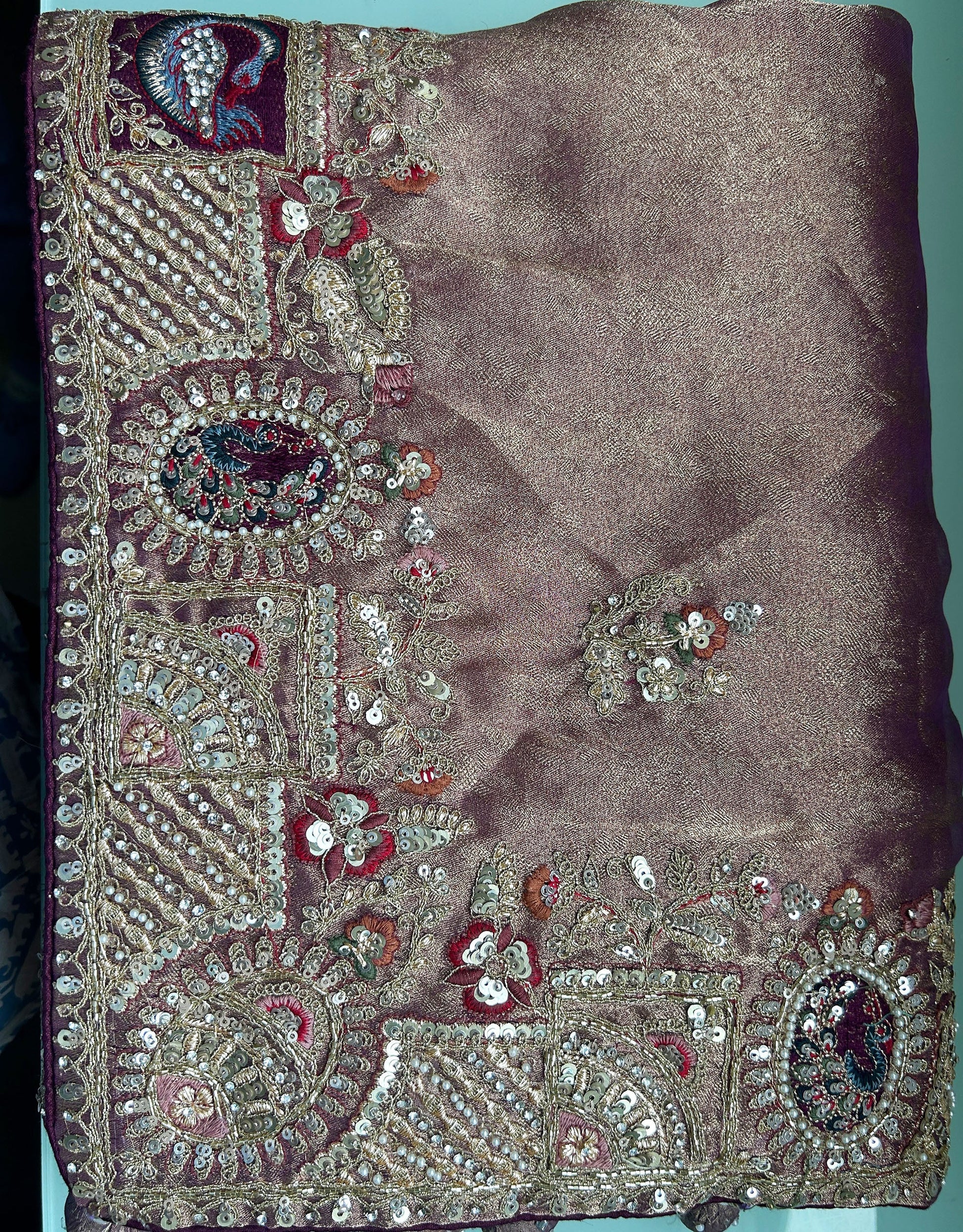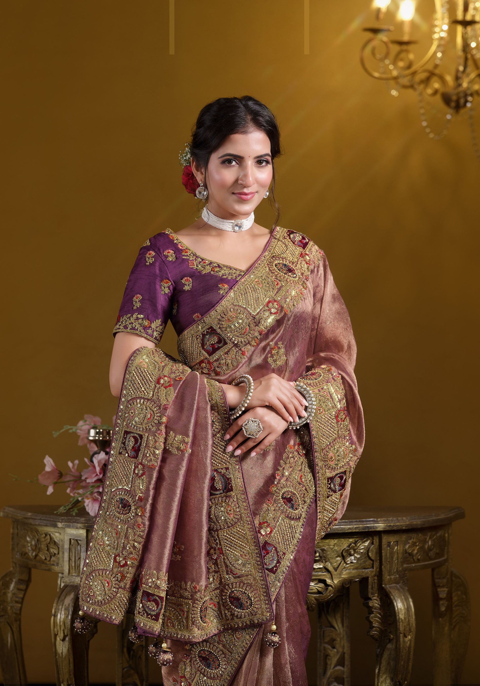 Wine and Gold Zari Organza Silk Khatli work Saree