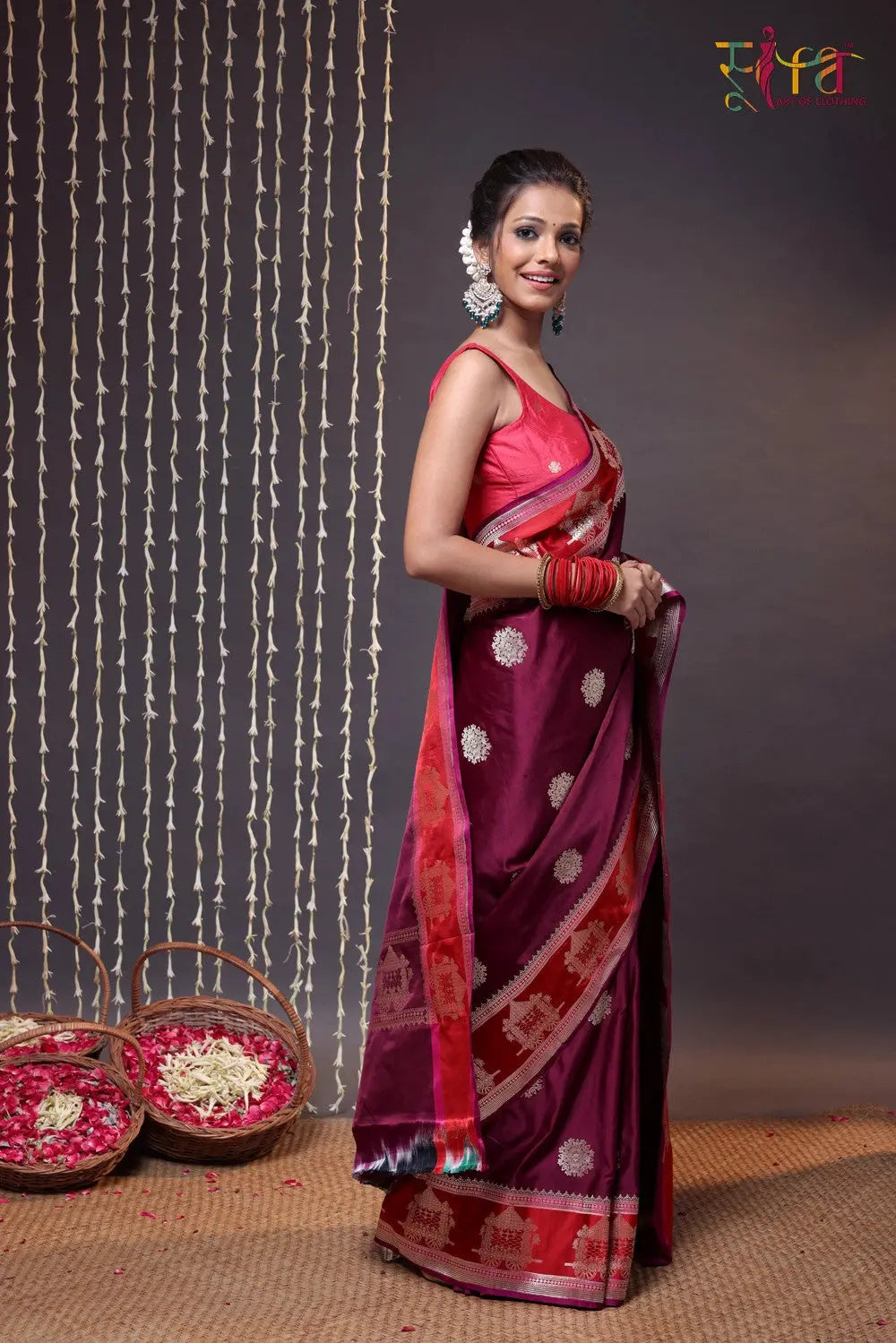 Elevate celebrations with our Wine and Red Pure Silk Banarasi Saree. Its rich Wine body adorned with shimmering zari motifs exudes opulence. The red border features intricate palki motifs, a homage to Indian grandeur. Meticulously handwoven, this masterpiece reflects the essence of Banarasi tradition and artistry. Whether for brides or enthusiasts of fine textiles, this saree ensures all eyes are on you at any wedding occasion. It's more than clothing; it's a testament to cultural heritage and craftsmanship, seamlessly blending tradition and elegance