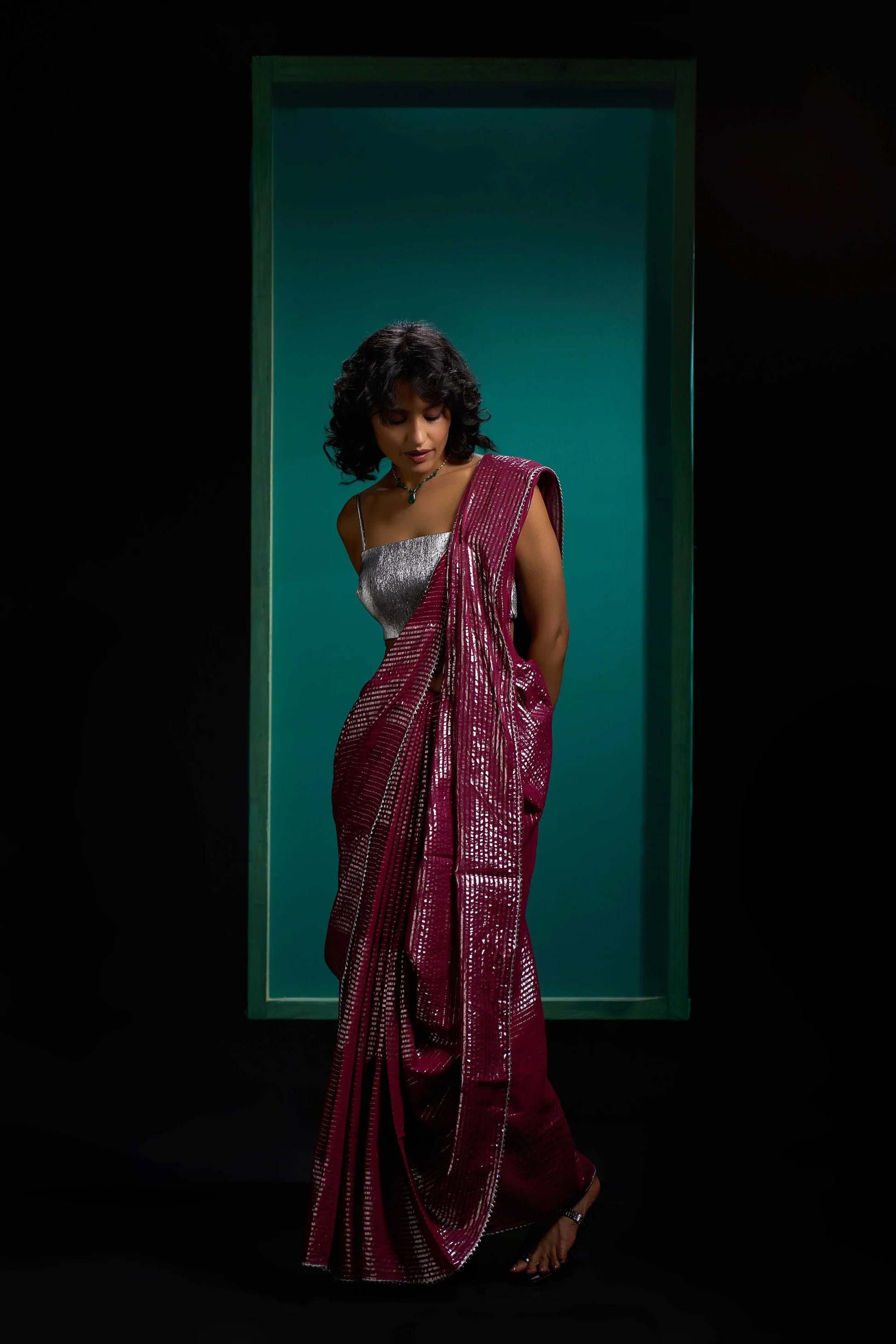 Wine Shine saree is in cotton fabric with silver lurex stripes. Cotton sarees has a strong presence in the modern wardrobe. The incredible softness and lightness of cotton combined with its strength and versatility makes it one of the most beautiful choice. The fabric is soft and easy to drape.