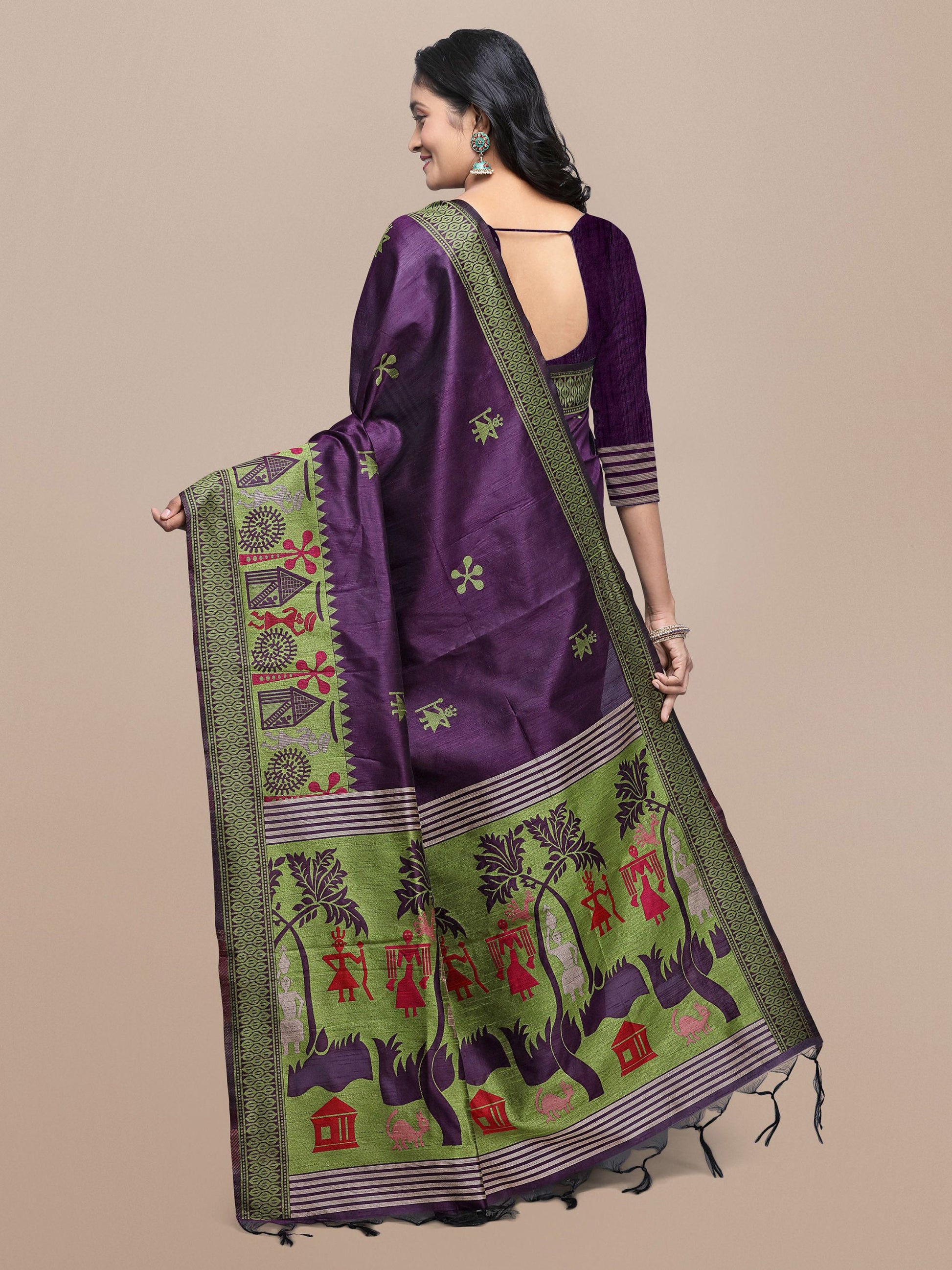 Wine Handloom Kalamkari woven Raw Silk saree