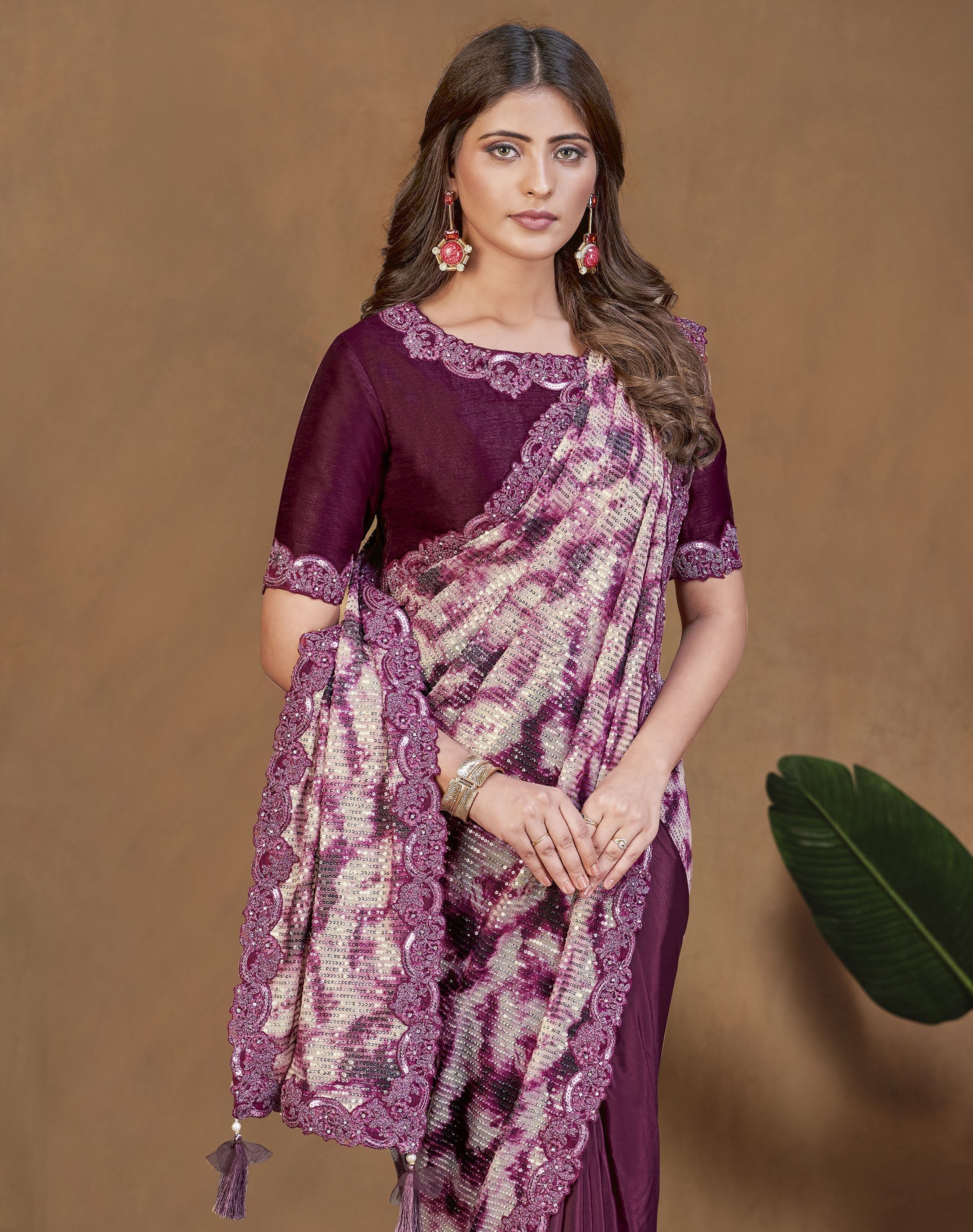 Wine Satin Crepe Silk Readymade Digital Printed Saree