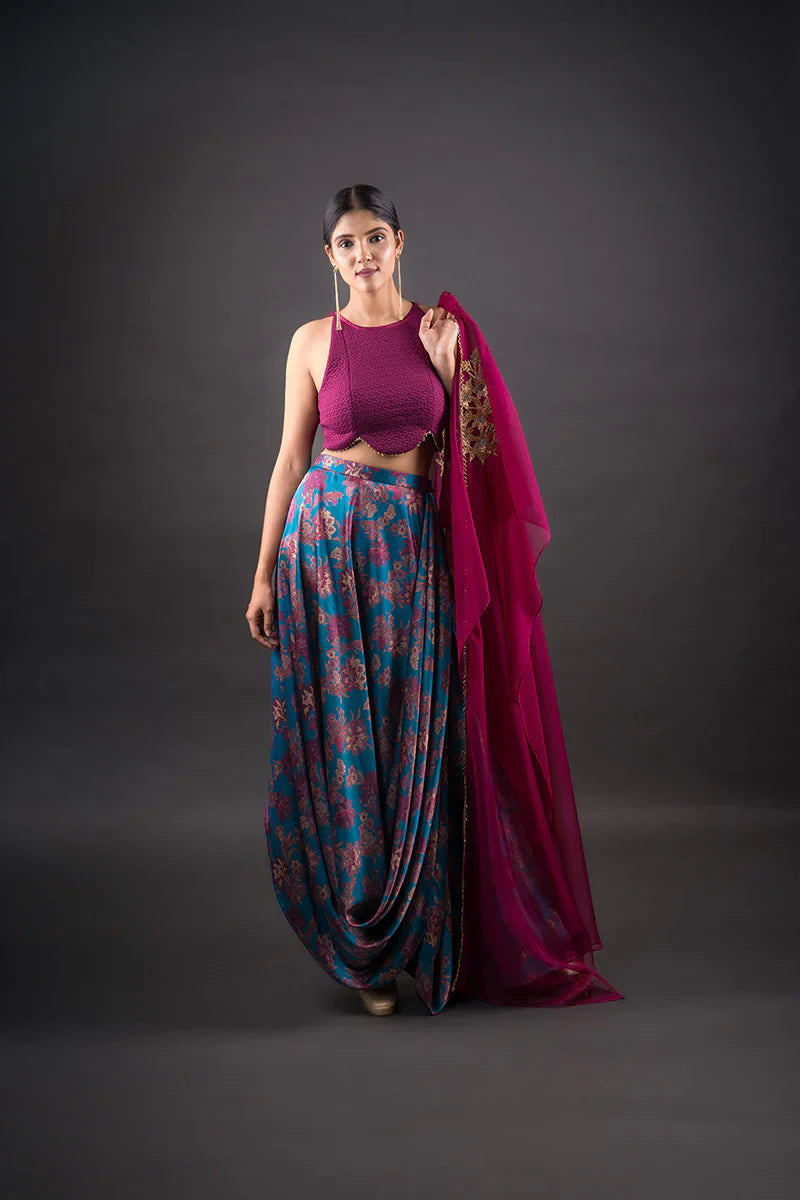Wine Scalloped Edge Quilted Crop-Top with Draped Floral Skirt