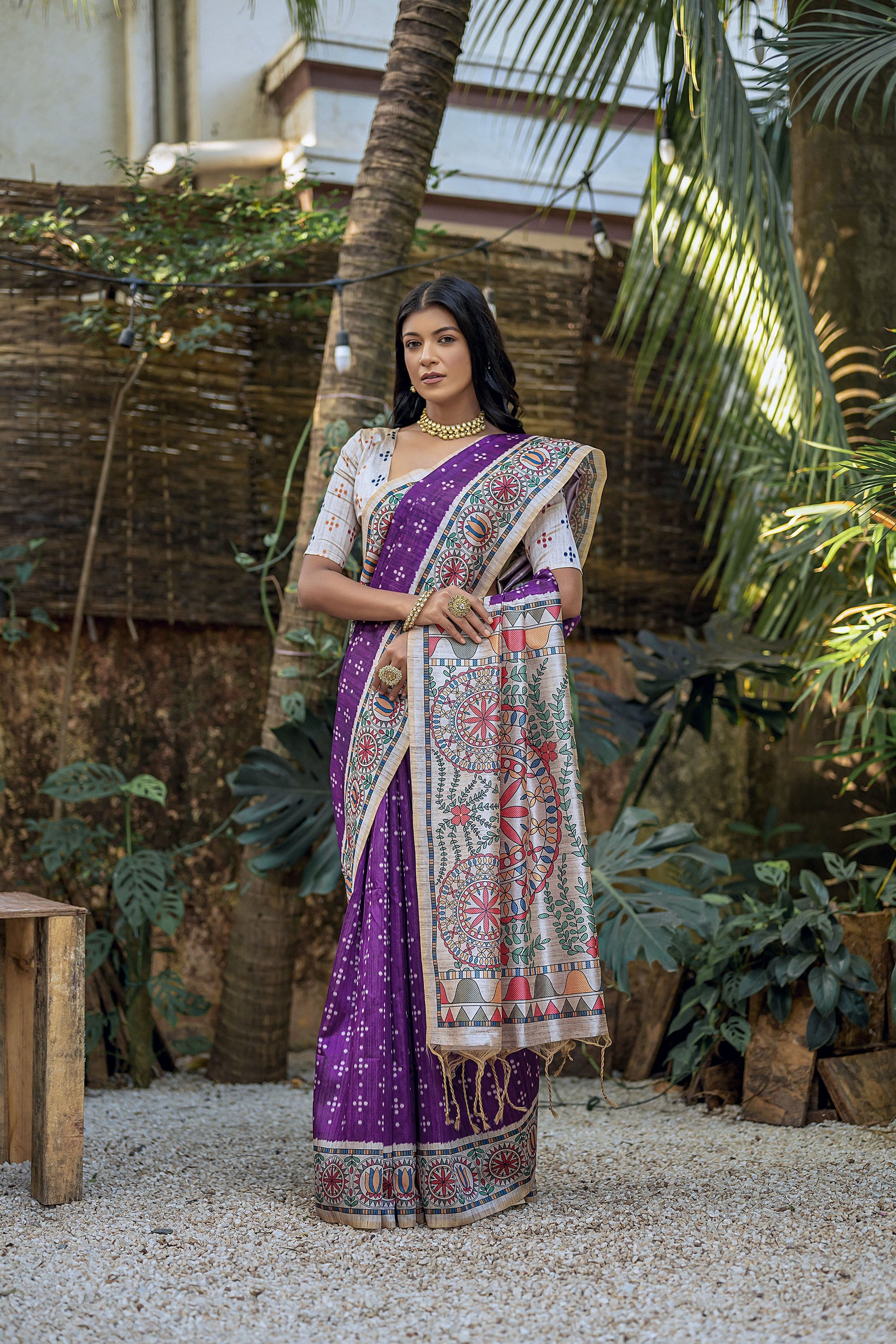 Wine Yogita Madhubani Soft Tussar Silk Zari Saree