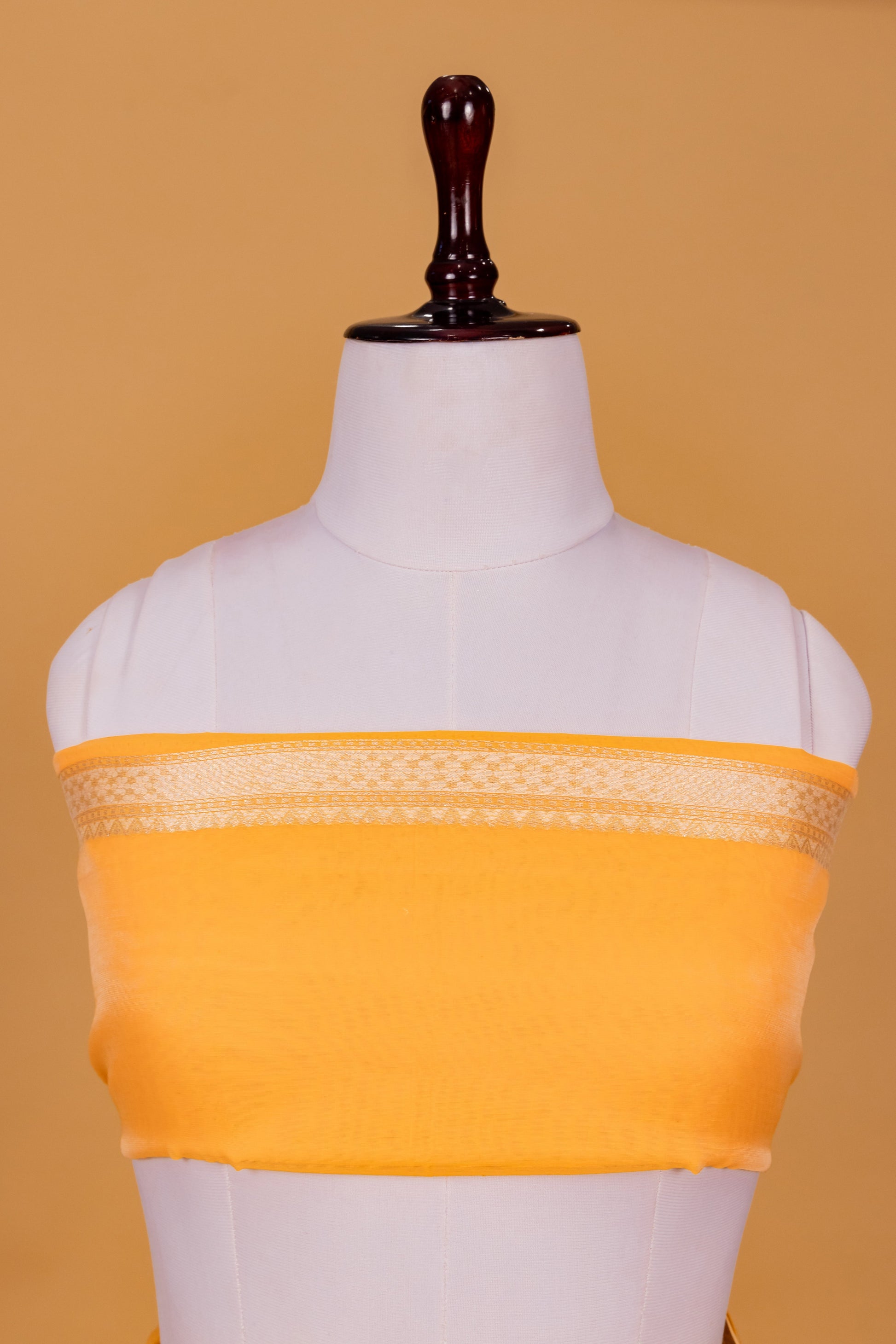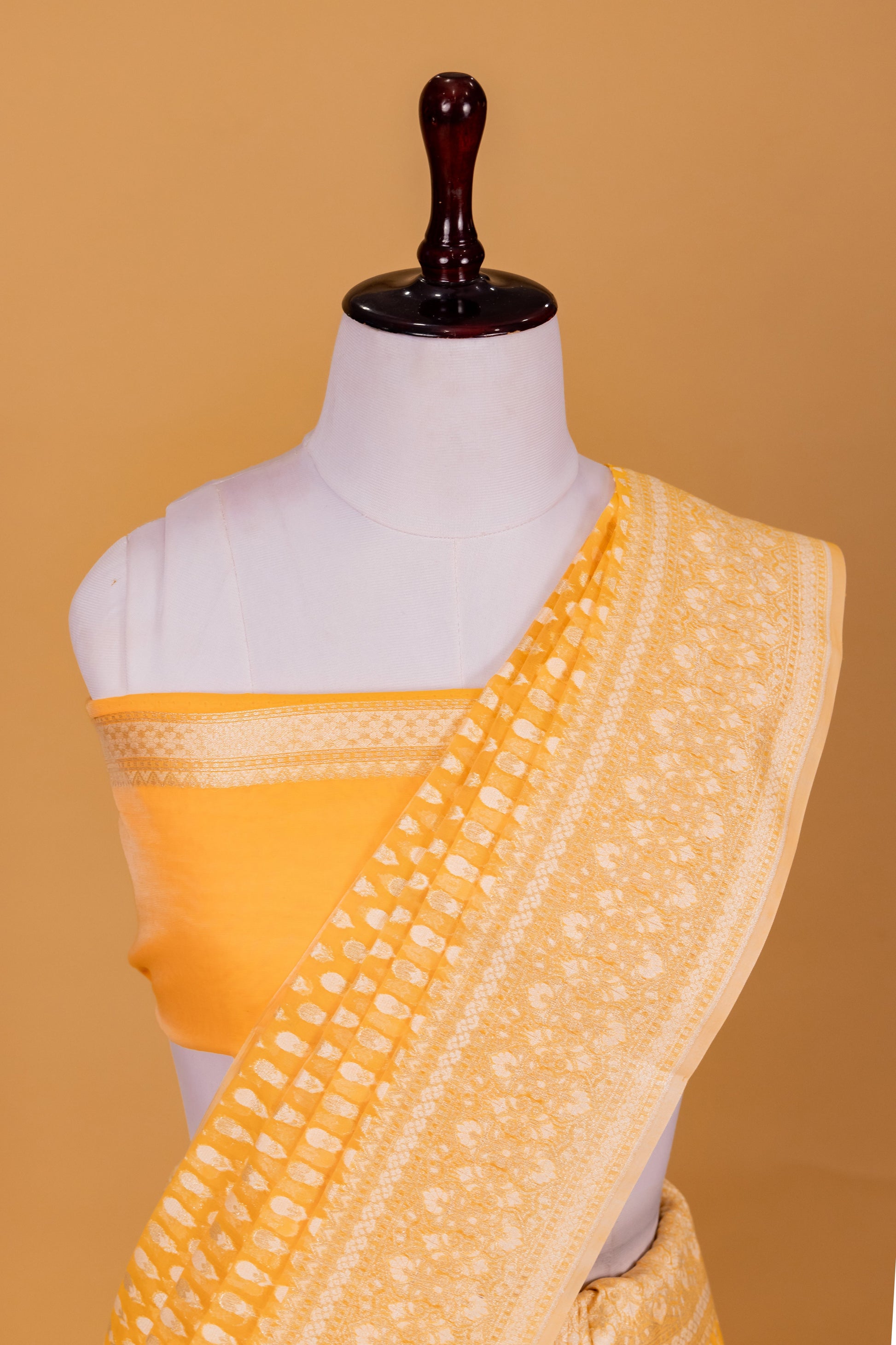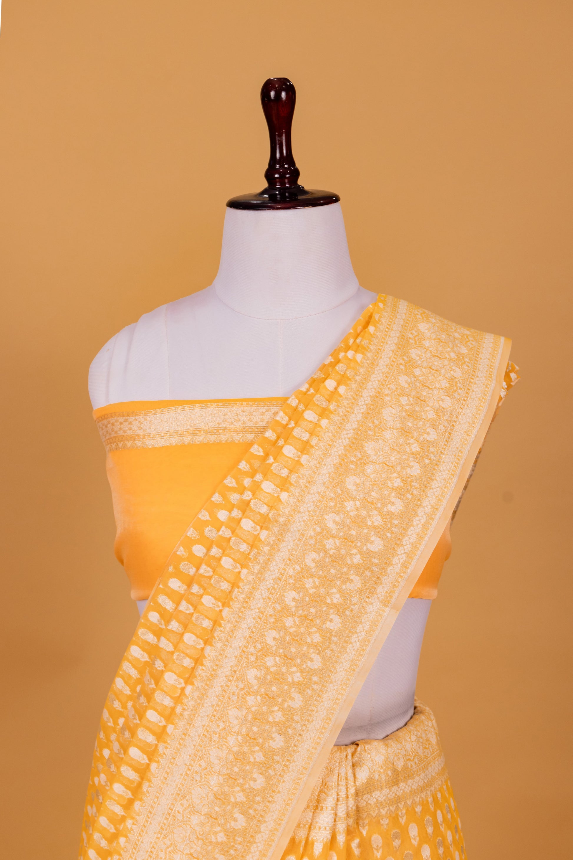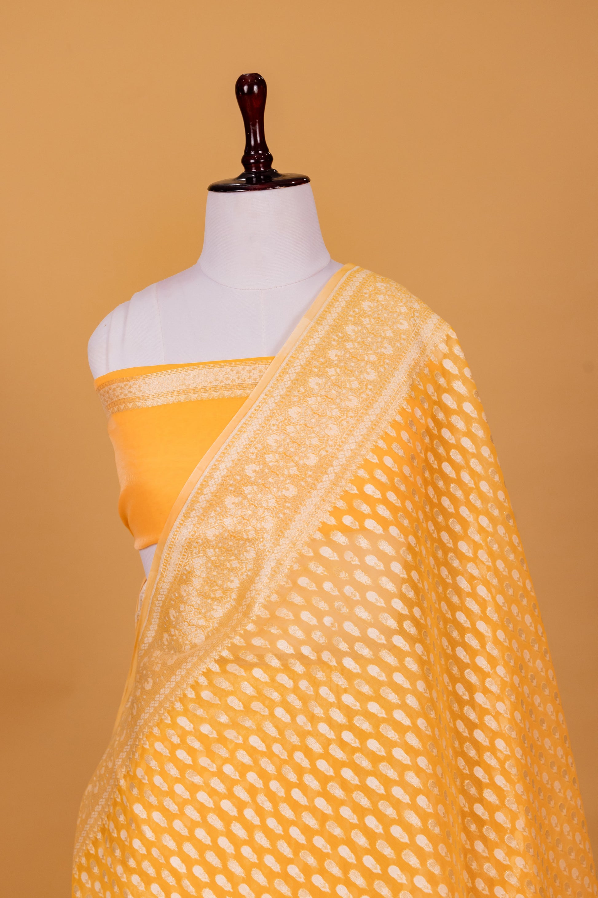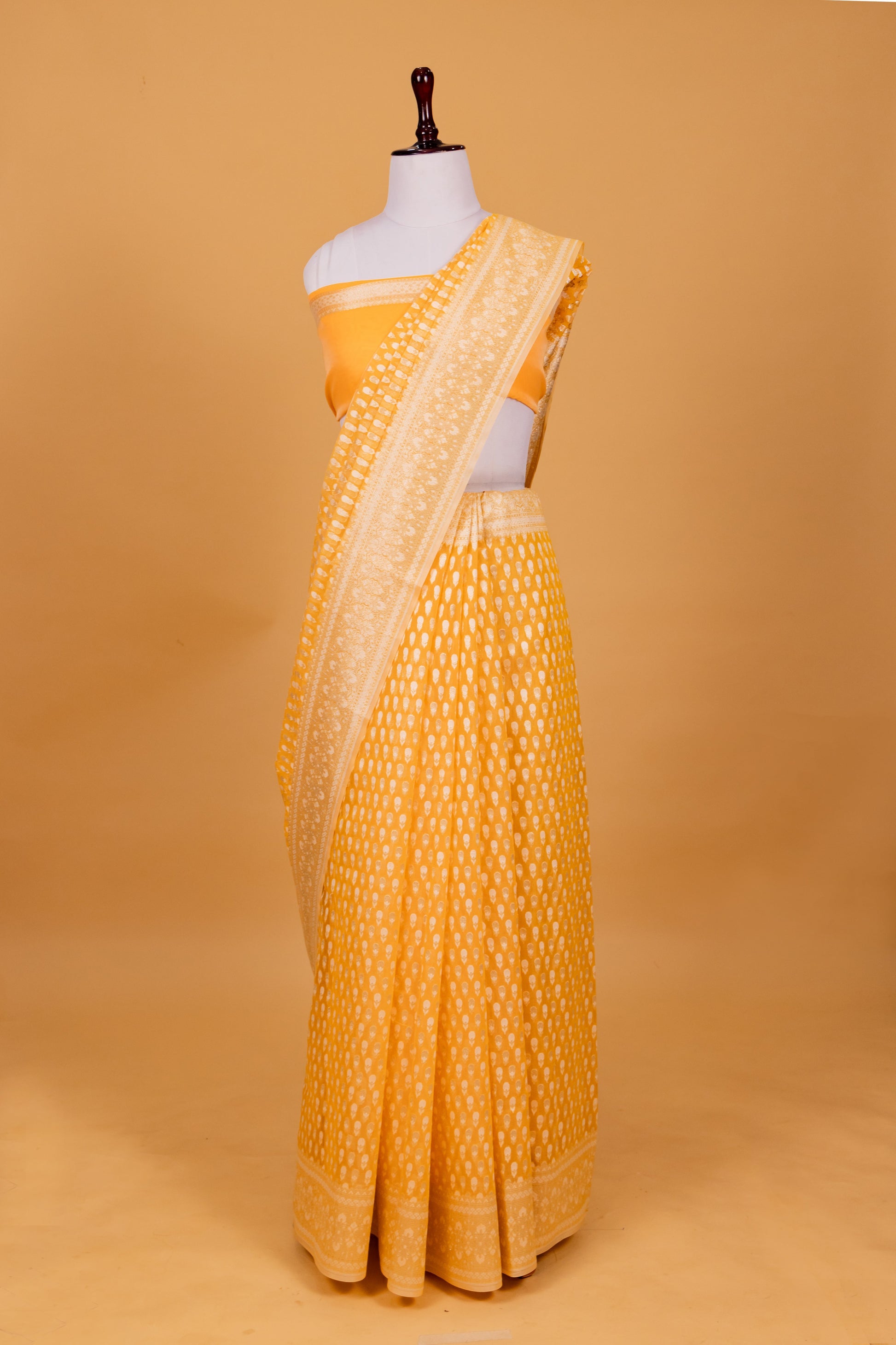 Description: This yellow saree is beautifully woven from Banarasi cotton and has an amazing booti design with delicate cutwork. Its elegant and comfortable design makes it ideal for all-day wear thanks to its sturdy yet lightweight fabric. With this lovely saree, you may dress up your traditional clothing.