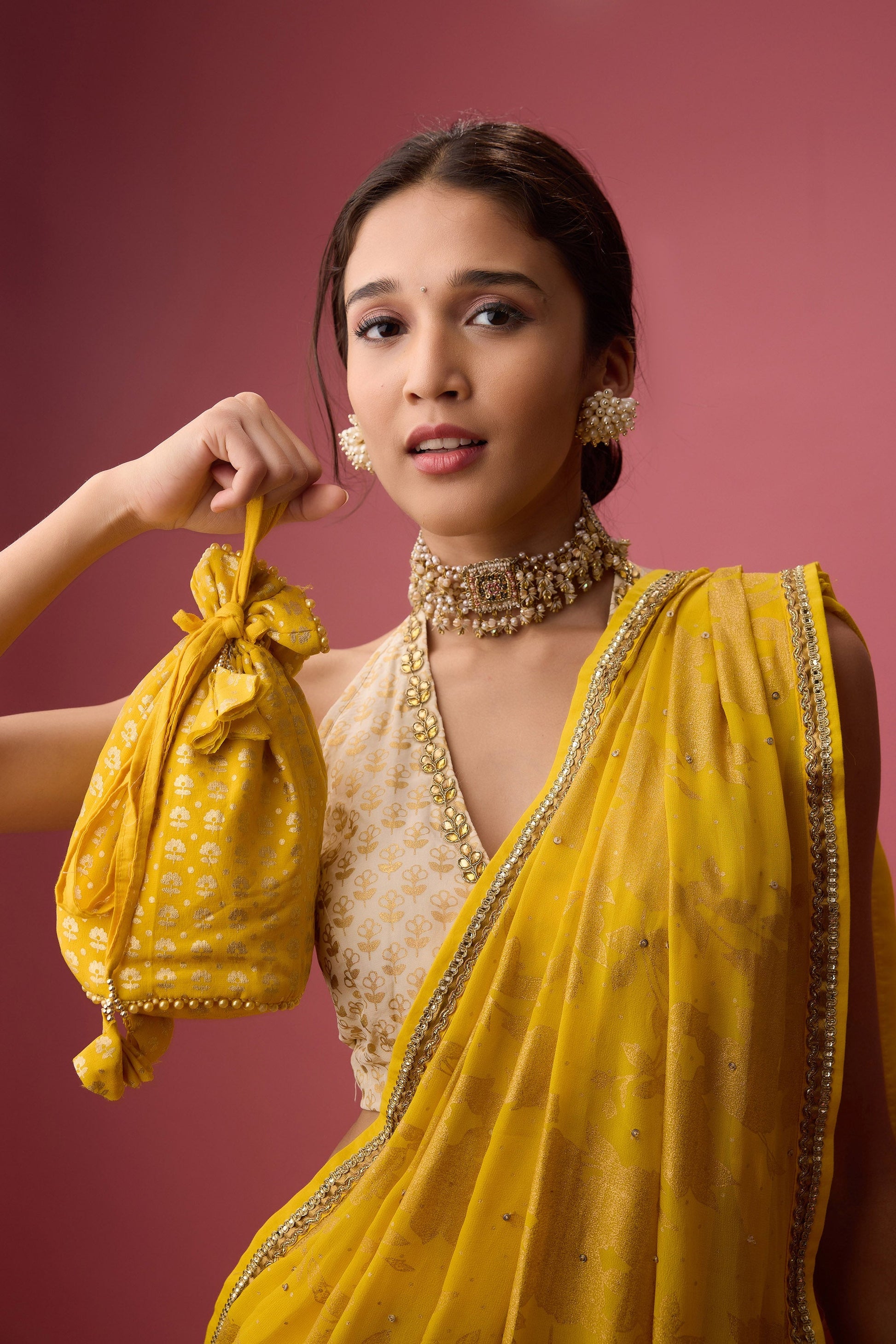 Ghee colour crepe foil printed dhoti with halter neck embroidered blouse with yellow Badal Sitara foil printed drape saree and handmade latkans.