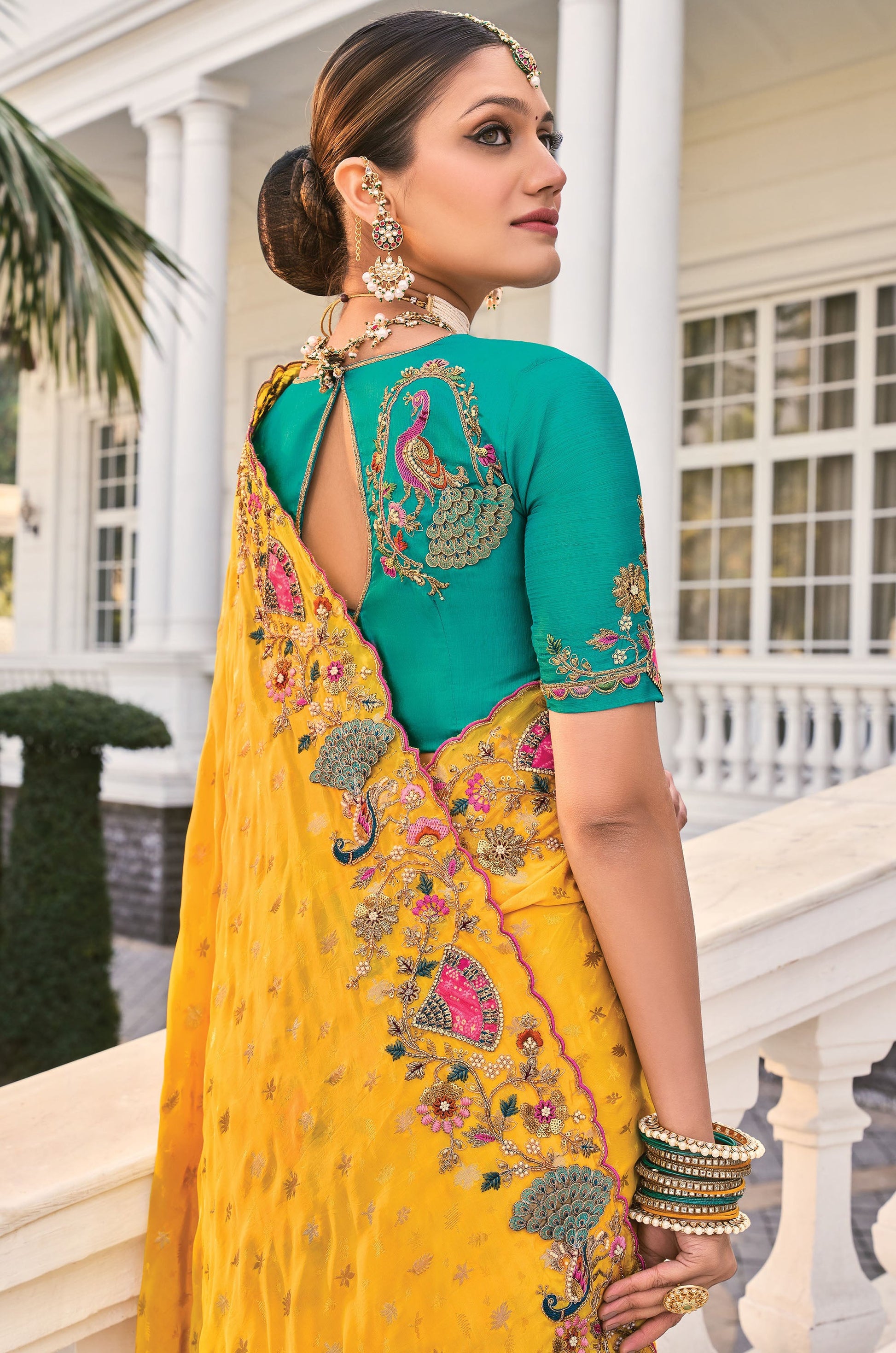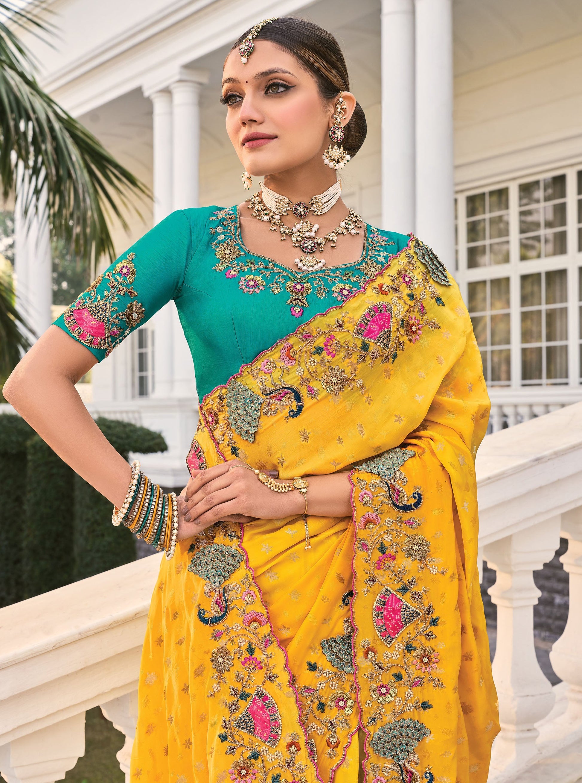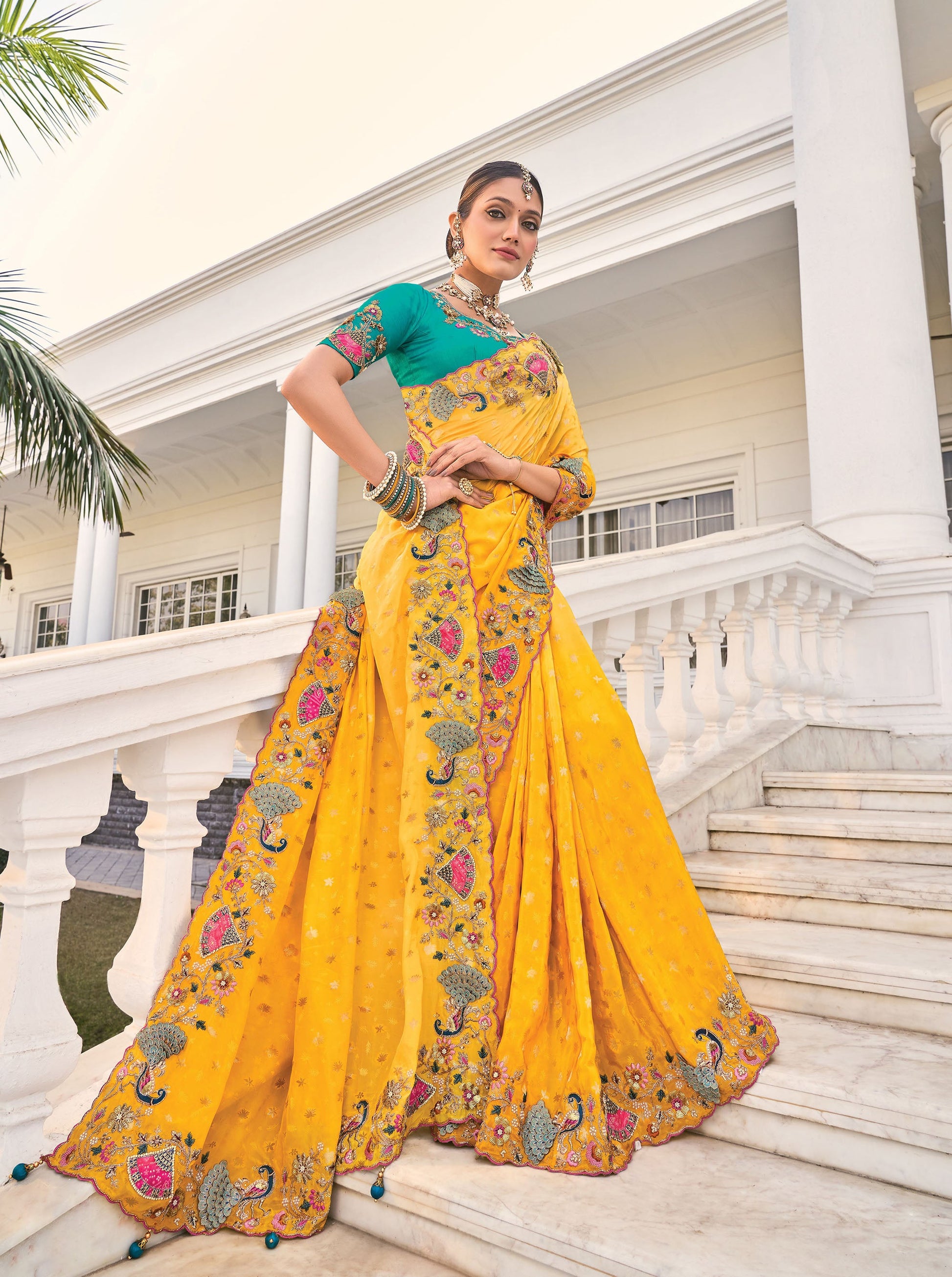 Yellow Crepe Jacquard Cutdana Work Haldi Saree