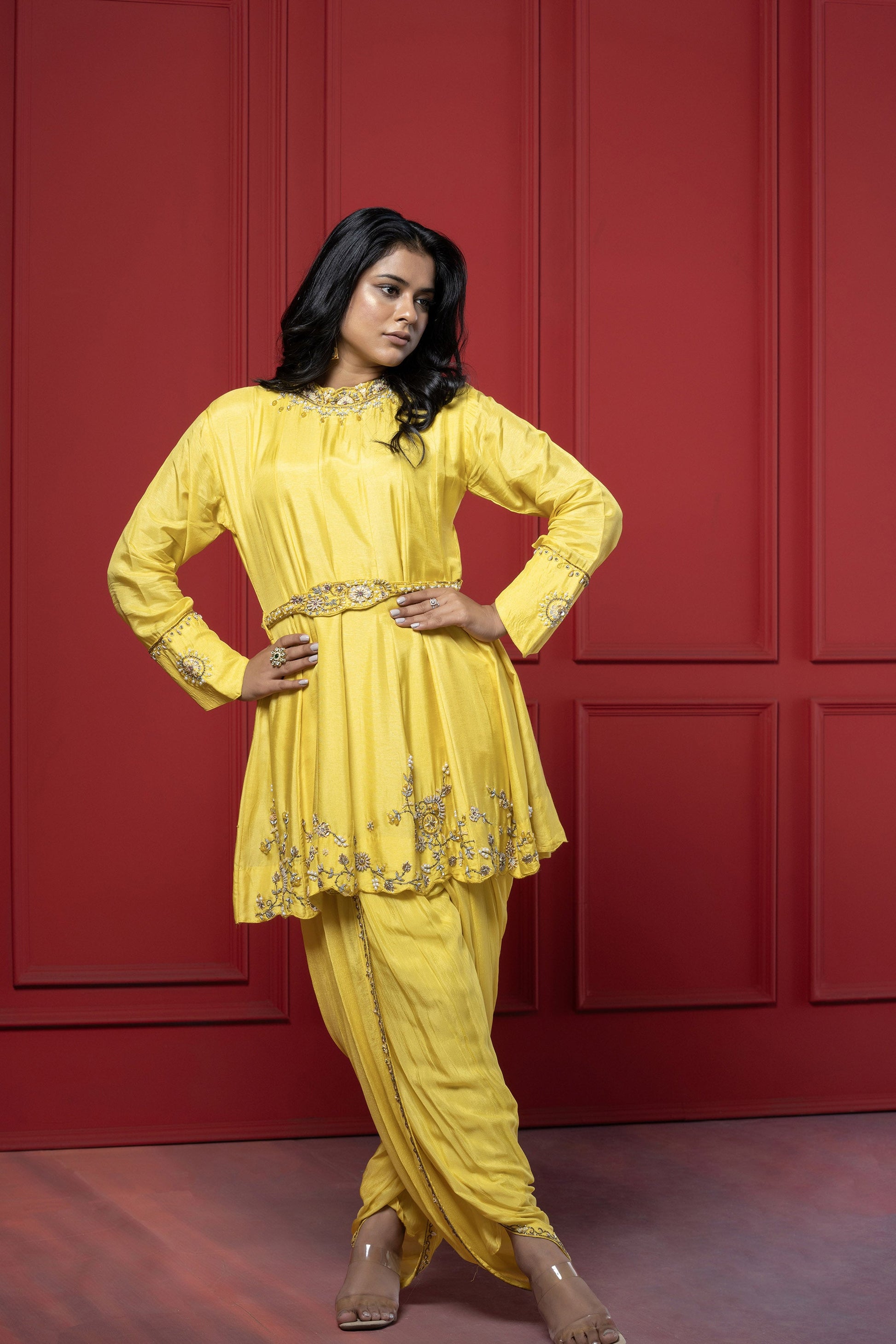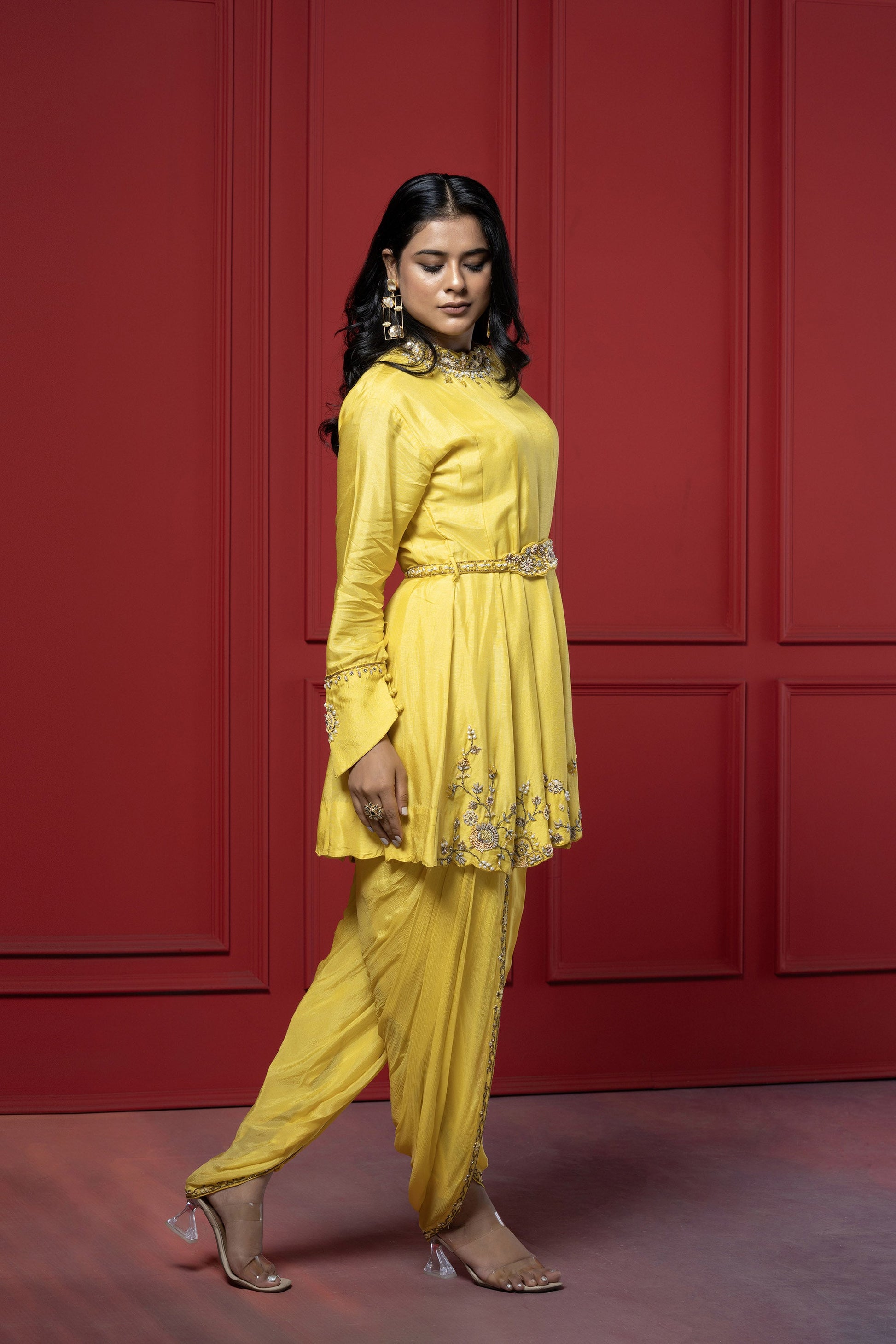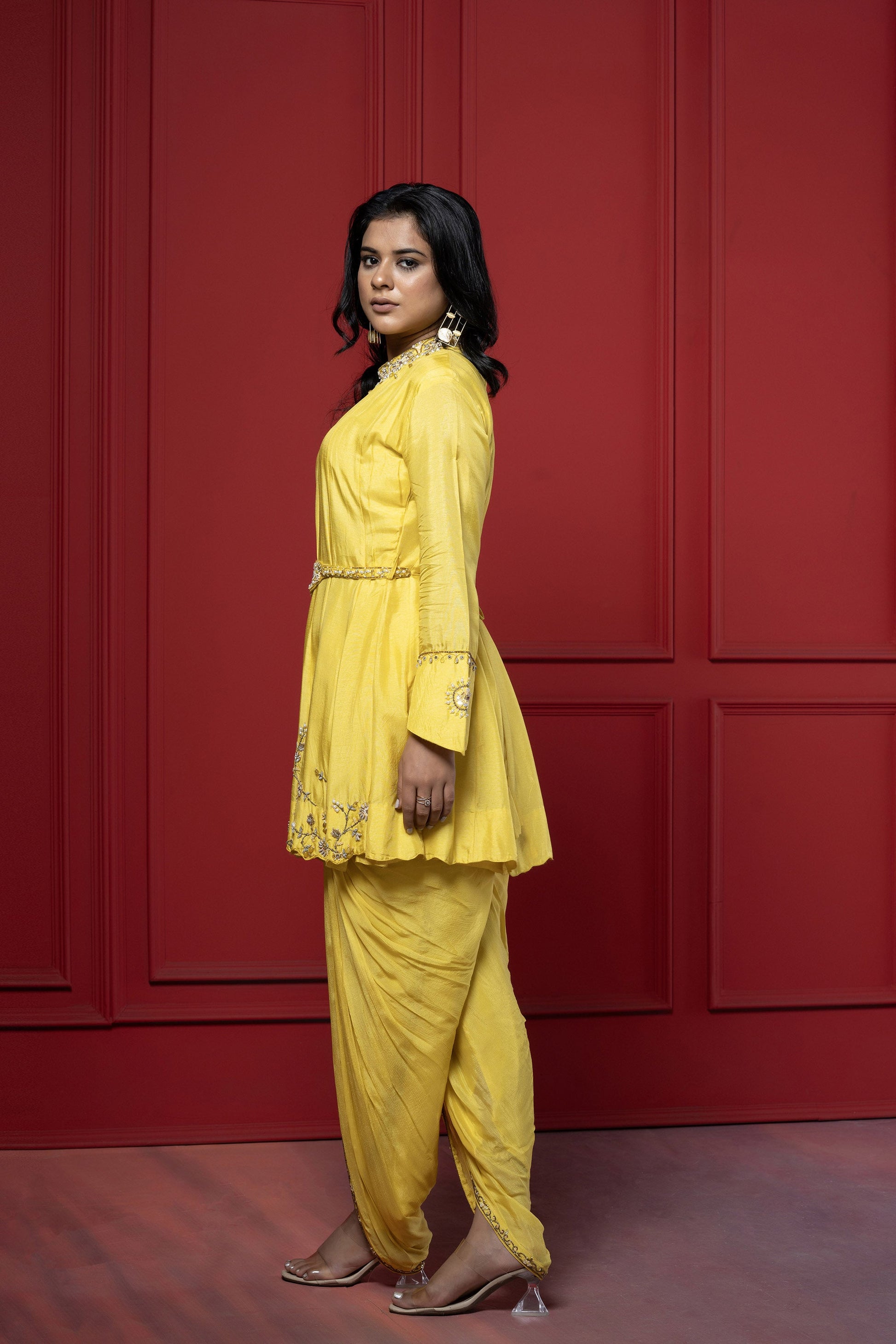 Yellow Dola Silk 3-Piece Peplum Dhoti Set