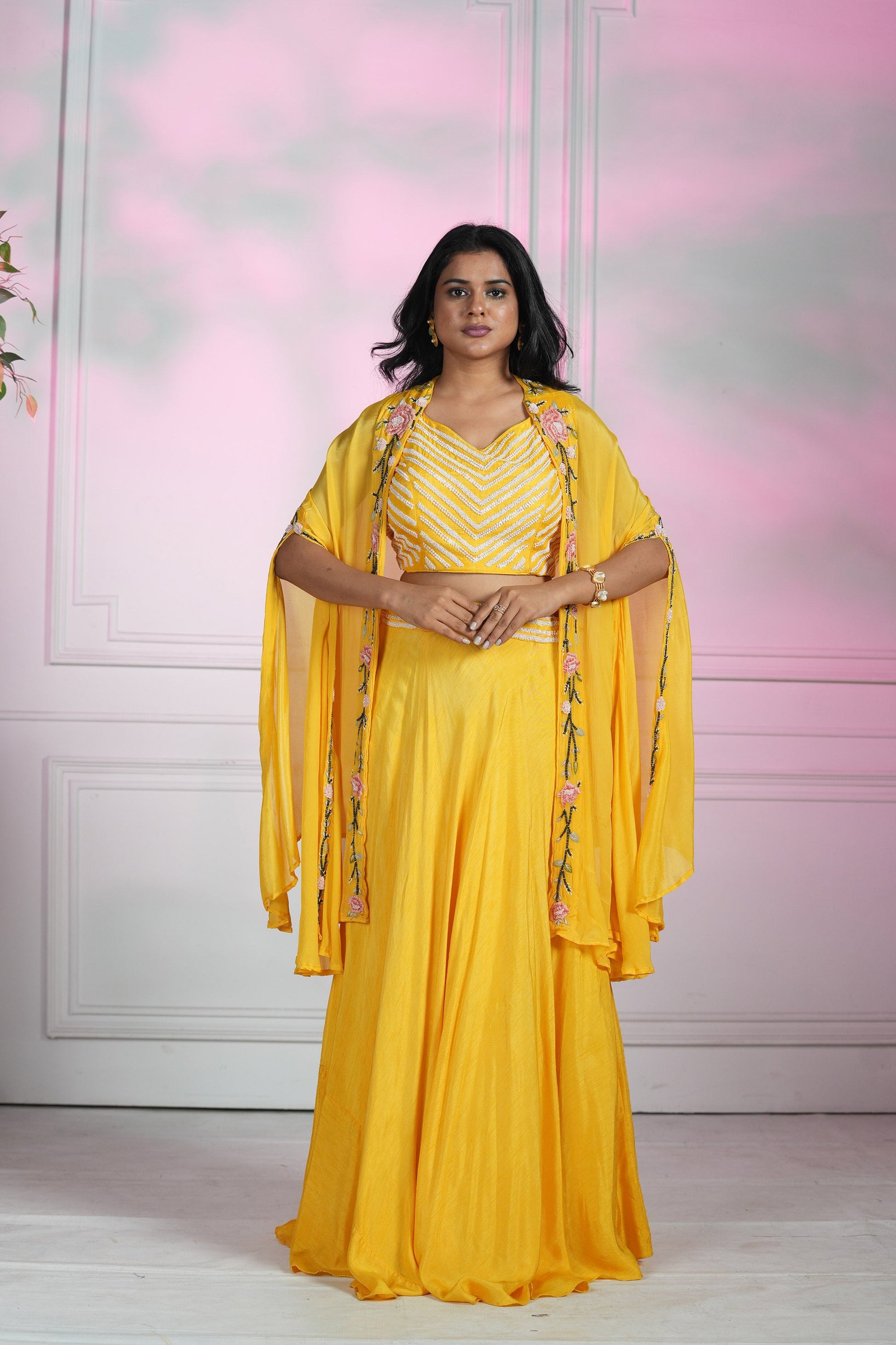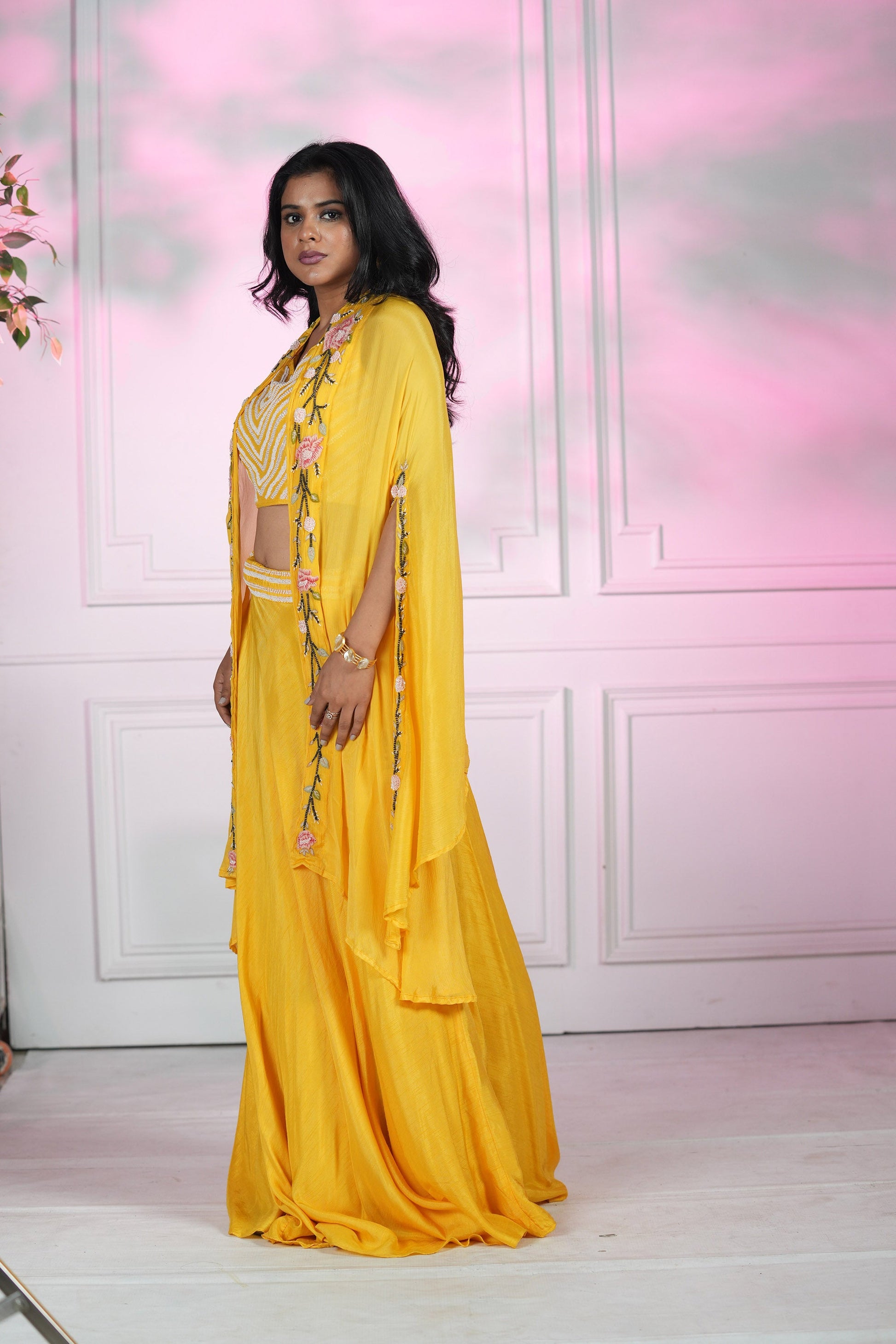 Embroidered Spaghetti & Cape with intricate embroidery pattern & embellished handwork with skirt & embroidered waist belt