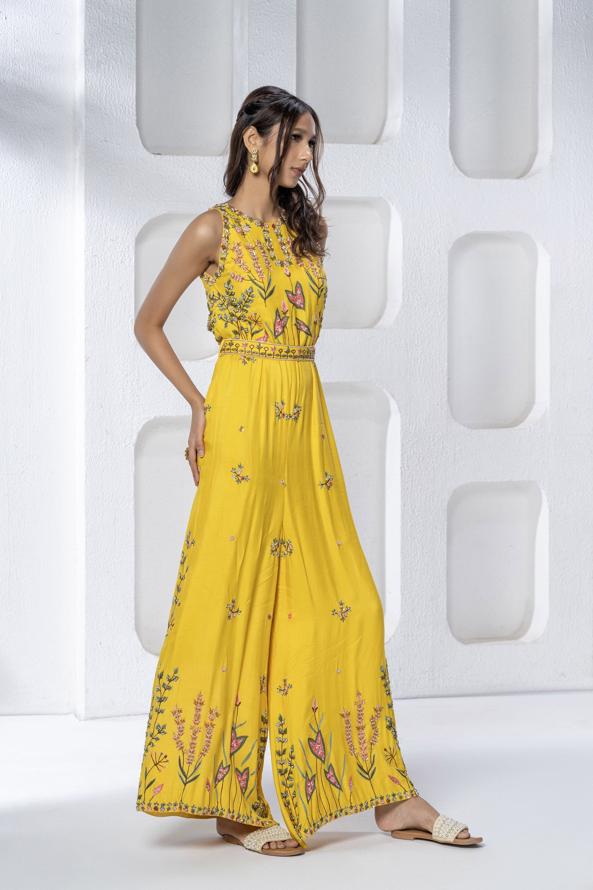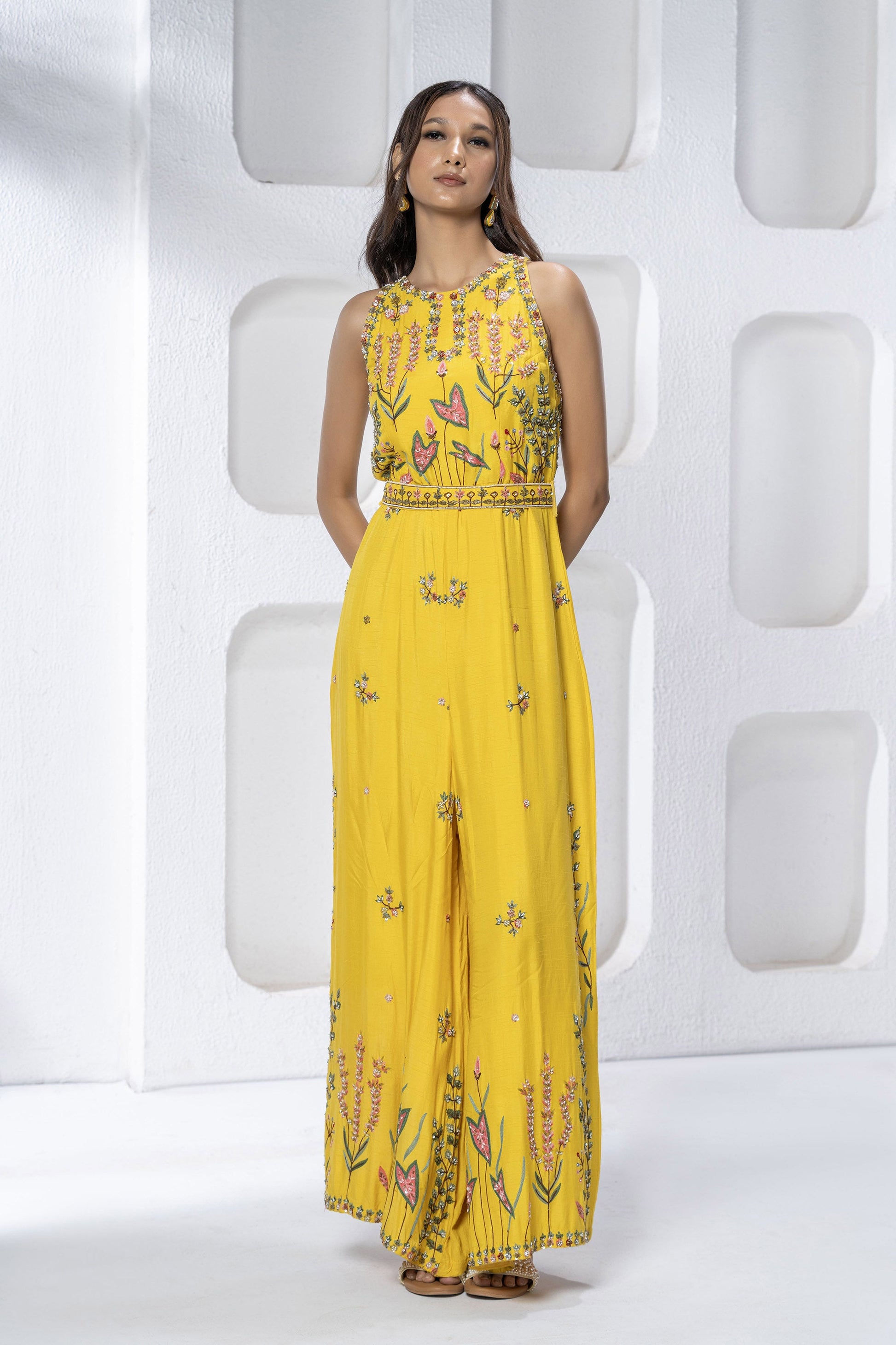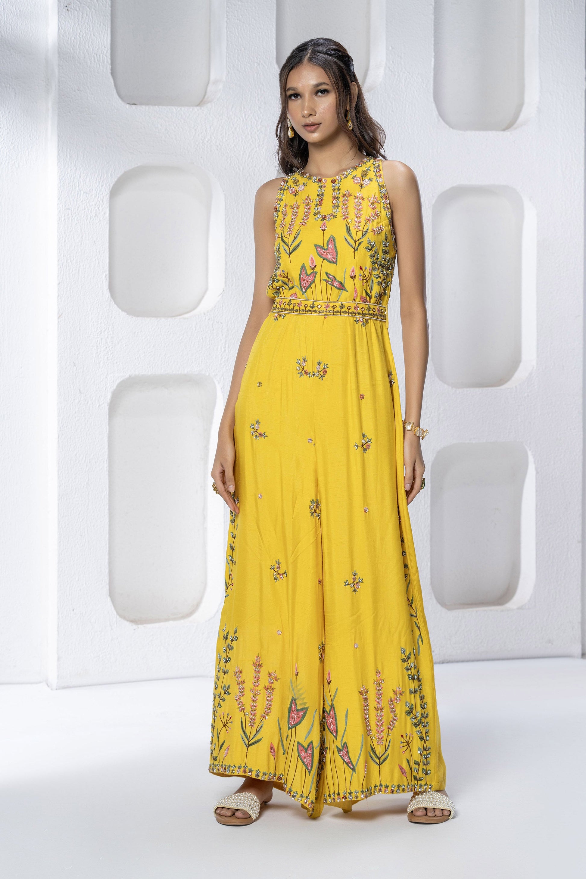 Embroidered Jumpsuit with can can for added flare & a waist belt for detail & motifs all over the bottom with heavy border