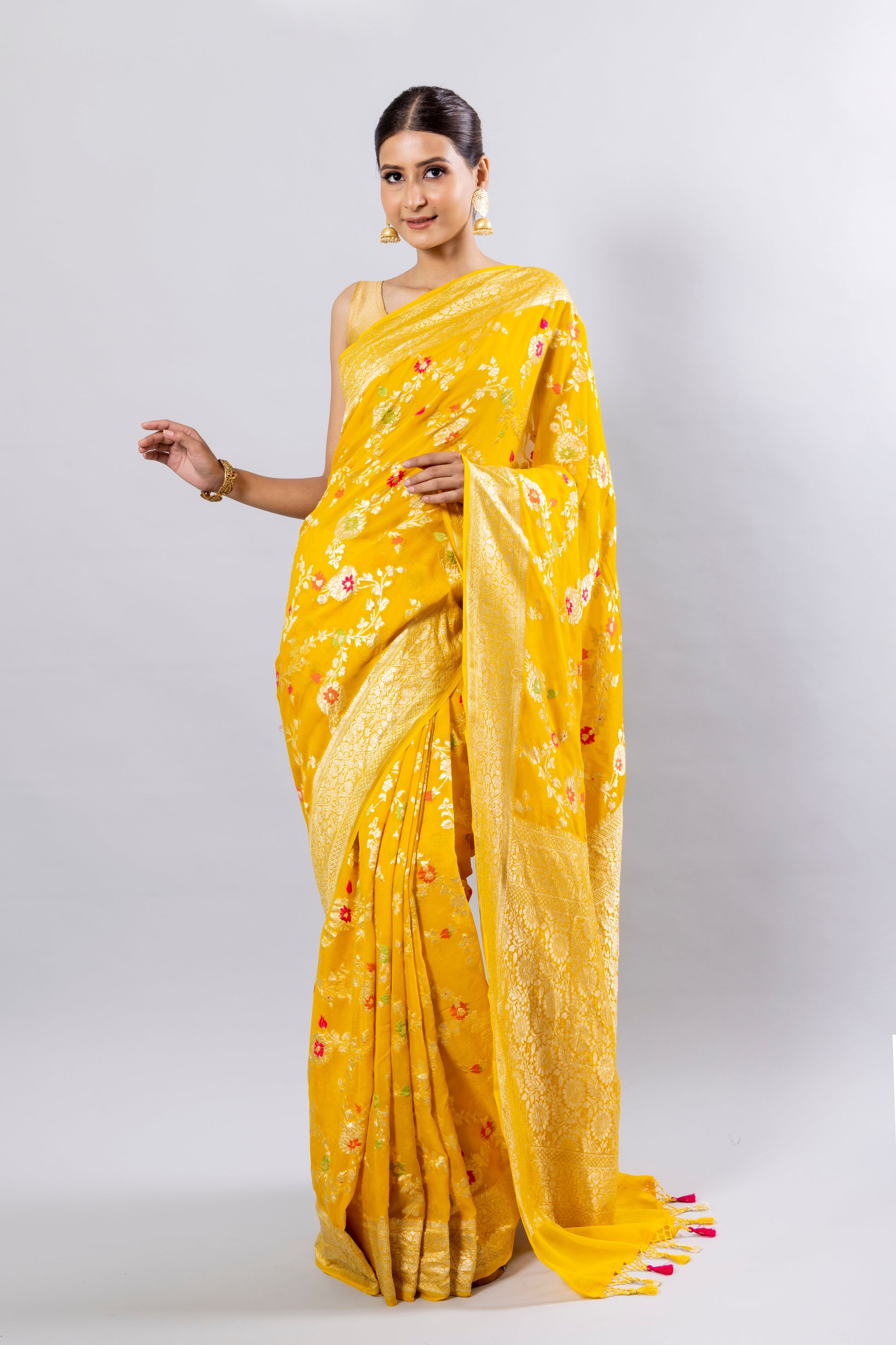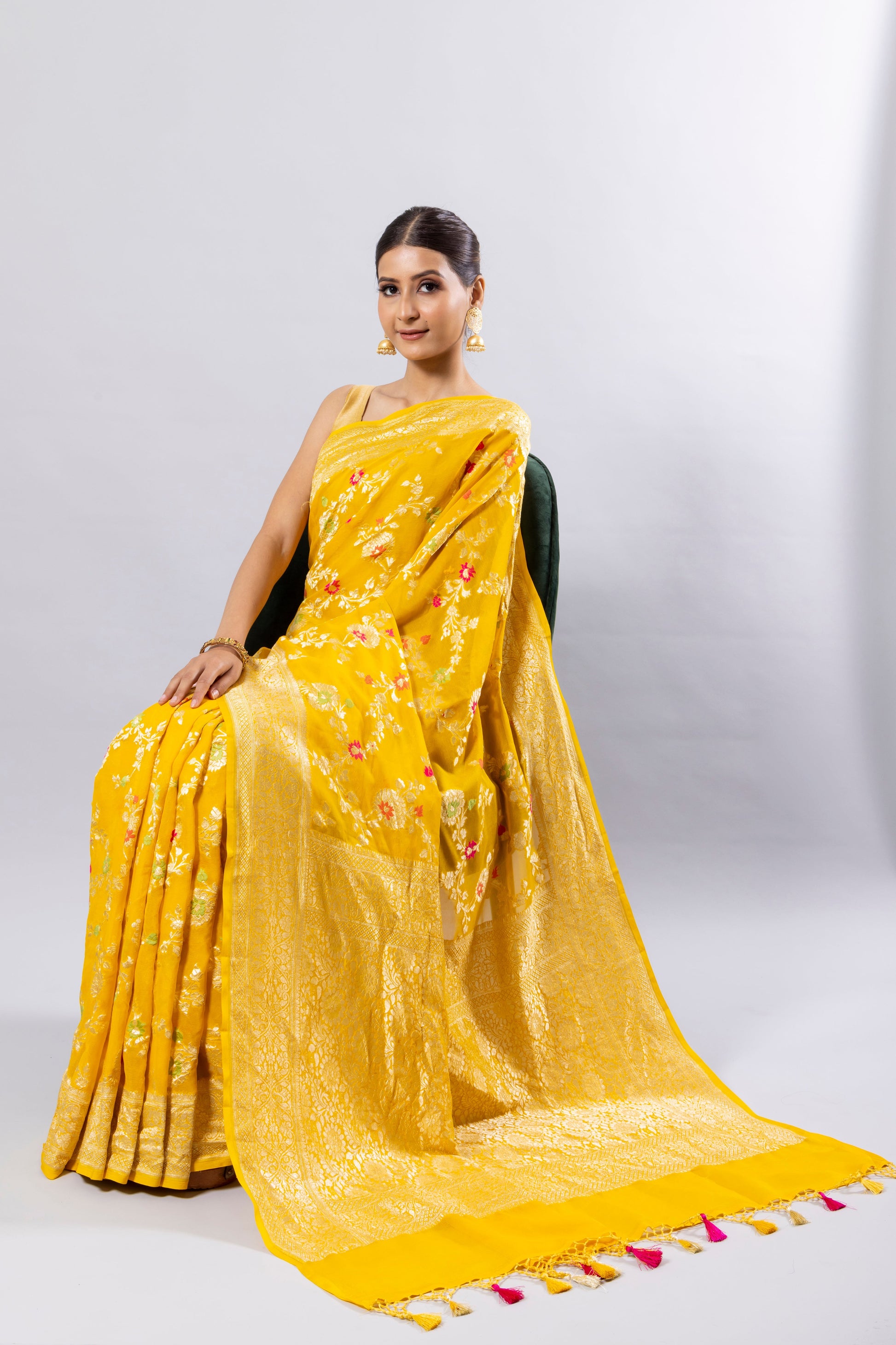 Product Description: The Yellow Georgette Khaddi Pure Silk Saree is a radiant piece that showcases the artistry of handloom Banarasi weaving. It features a captivating Jaal design with multi-color meena work, complemented by a resplendent gold zari border and aachal. This saree is a celebration of the enduring traditions of Banaras and represents the charm of sustainable and elegant fashion.