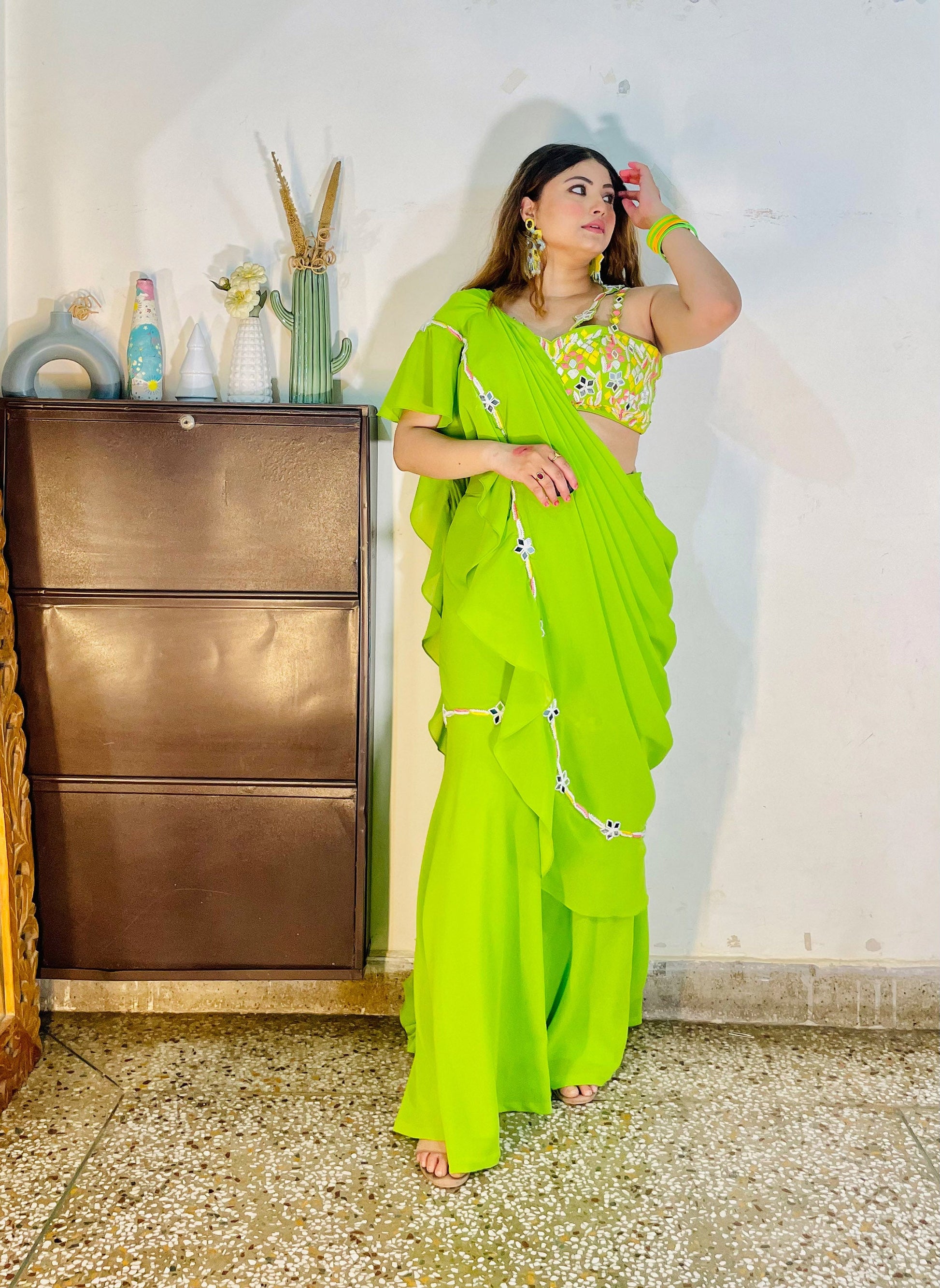This set includes gharara with embroidered blouse and drape frill dupatta.Gharara has attached drape dupatta detailed with hand embroidery pink ,white and yellow thread work with shiny mirror work ,blouse has back opening .