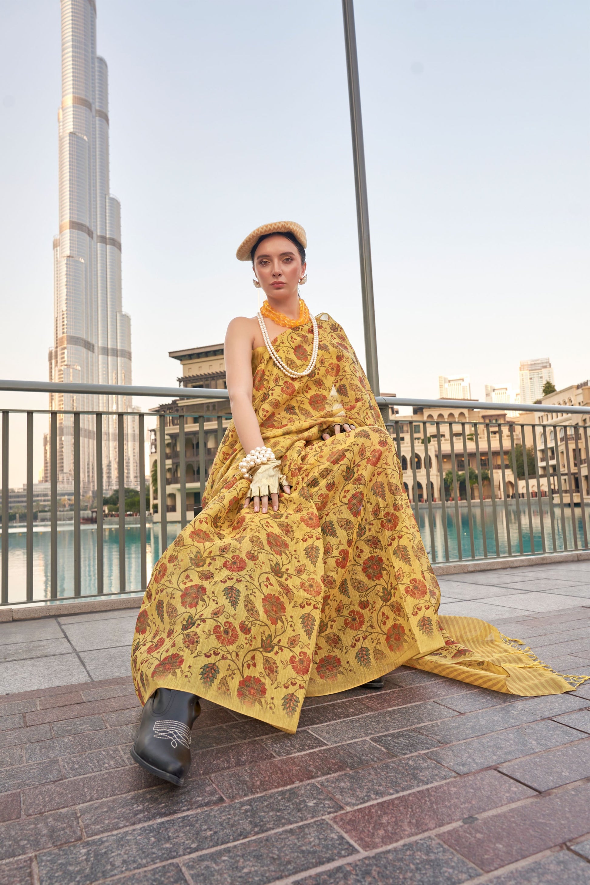 Yellow Keeyah Printed Handloom Zari Tissue Saree
