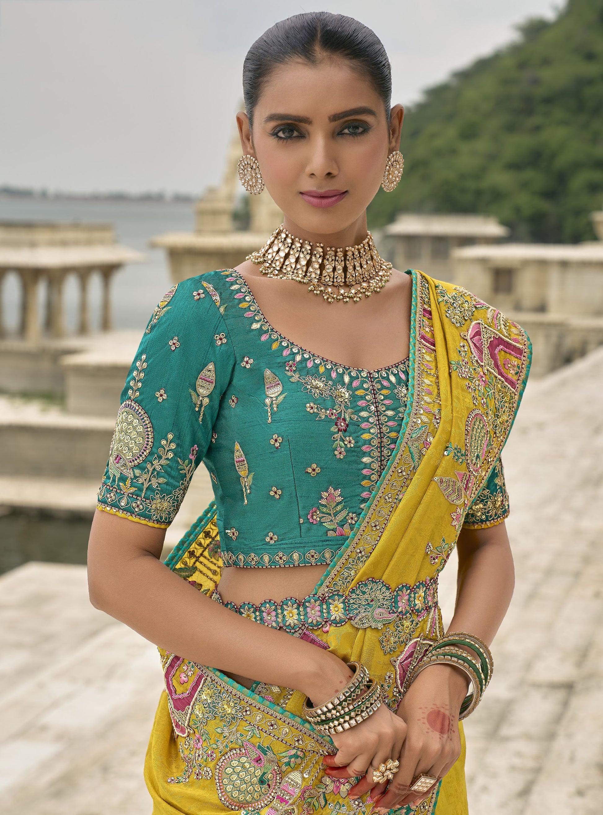 Are you seeking something exclusive? We've got what you require! This Yellow Pure Viscose Jacquard Khatli, Zari Embroidered Haldi Saree with its gorgeous Zari embroidery and bright yellow color is the perfect option for those seeking to make an impact. You will certainly be the center of attention in this Saree if you wear it to a wedding reception, an engagement party, or a sangeet. Pictured here is a bridesmaid wearing the Yellow Pure Viscose Jacquard Khatli, Zari Embroidered Haldi Saree, which you can purchase today!