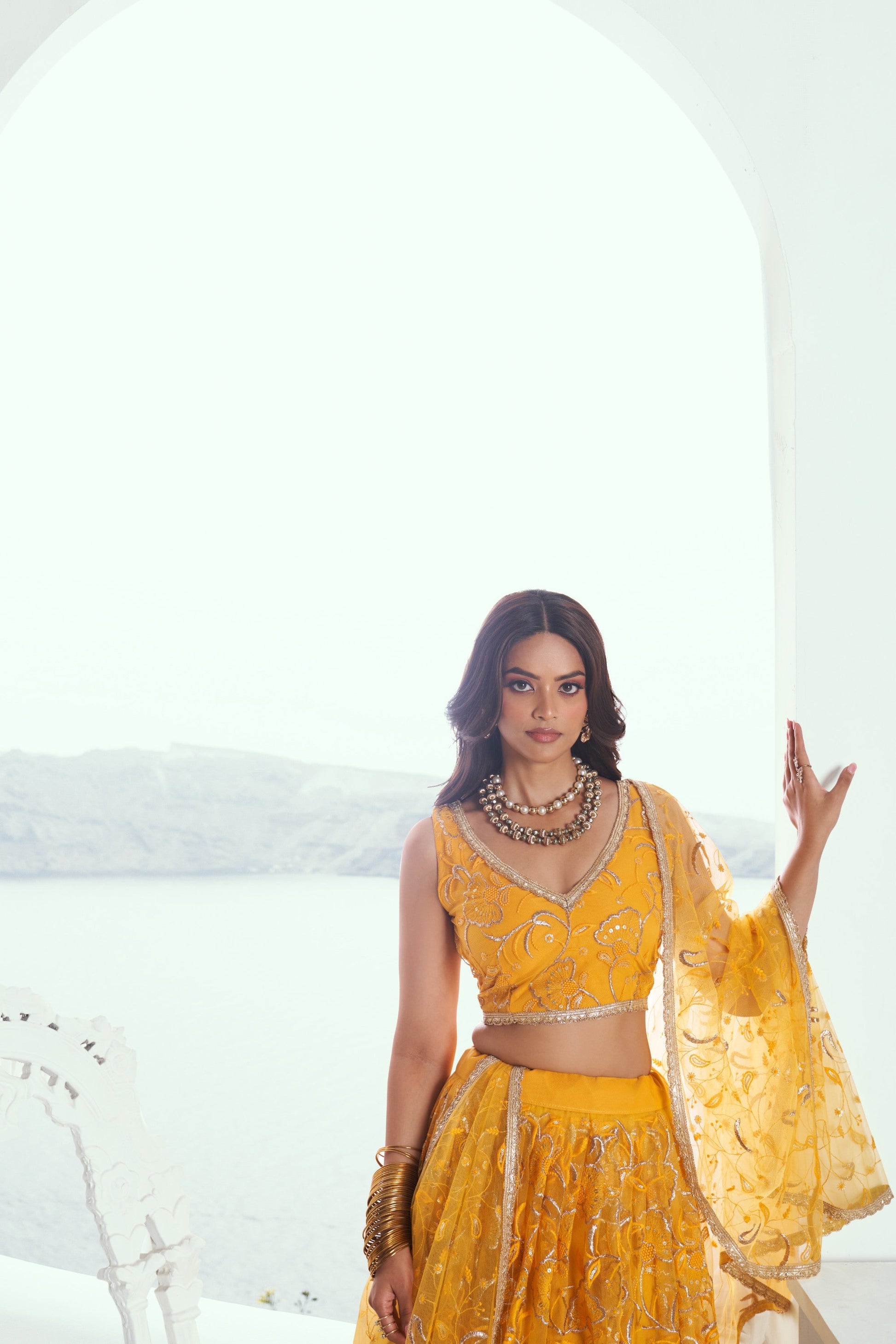 Yellow Sequins Embroidery Butterfly Net Haldi Lehenga