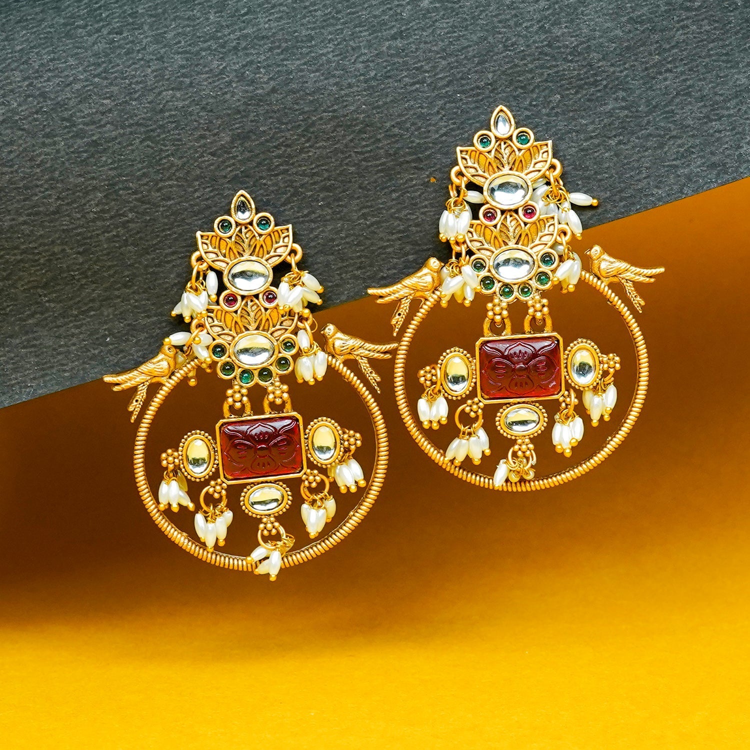 These 18K gold-plated drop earrings feature white Kundan stones, carved red center, bird motifs, floral patterns, and pearl danglers—perfect for festive occasions, weddings, and statement ethnic styling.