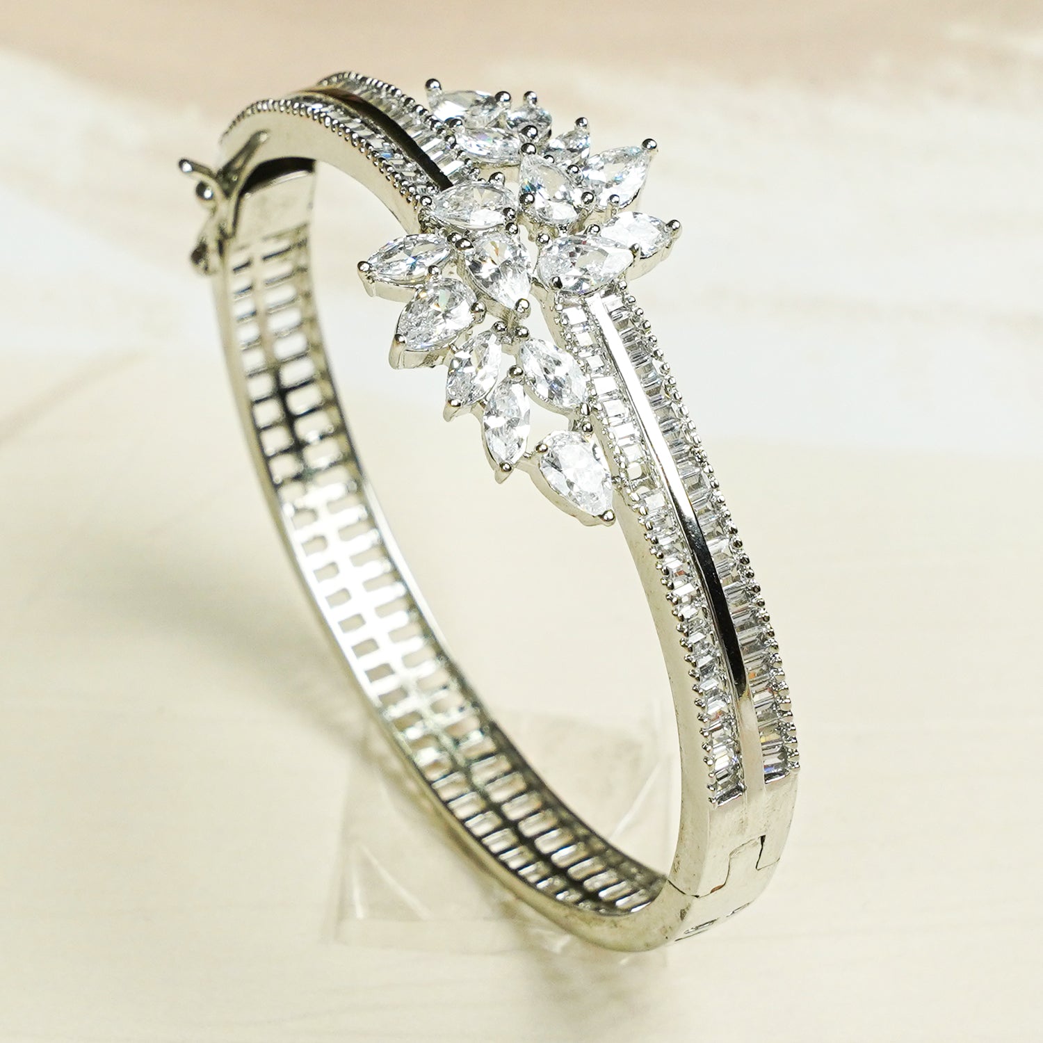 This Zevar Club 22K gold-plated openable bracelet features a blooming floral cluster of pear-cut and marquise AAA CZs, paired with sleek baguette-lined dual bands. A radiant handcrafted piece for women & girls—perfect for luxe parties look and special occasions.
