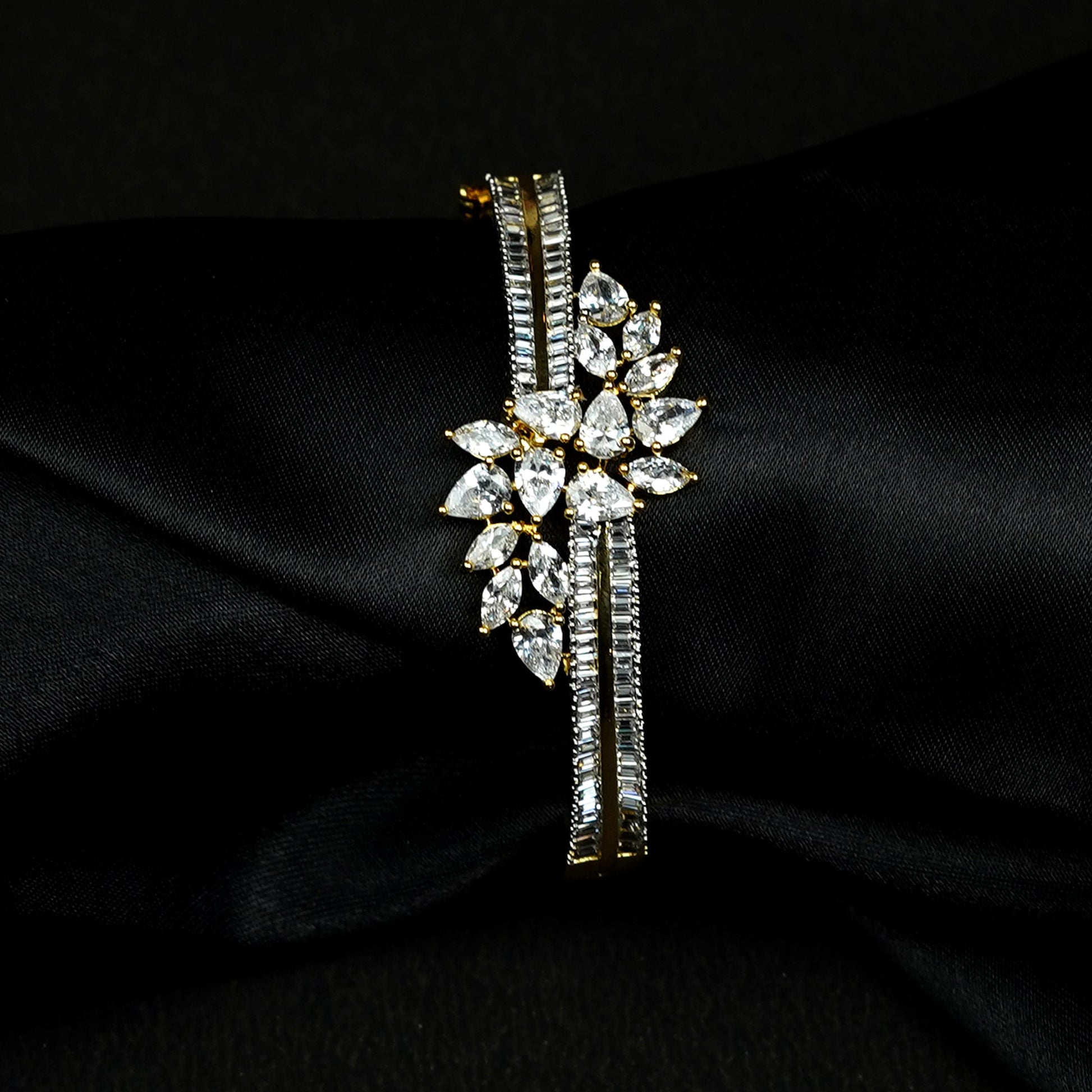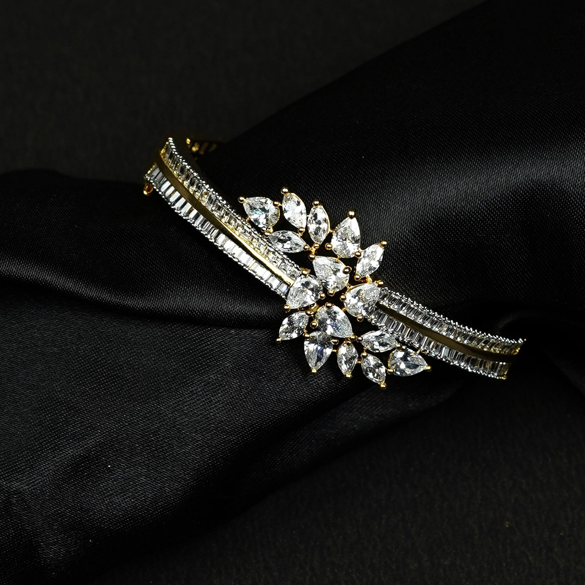 Zevar Club 22K Gold-Plated Floral Cluster Handcrafted AAA CZ Studded Baguette-Lined Openable Bracelet