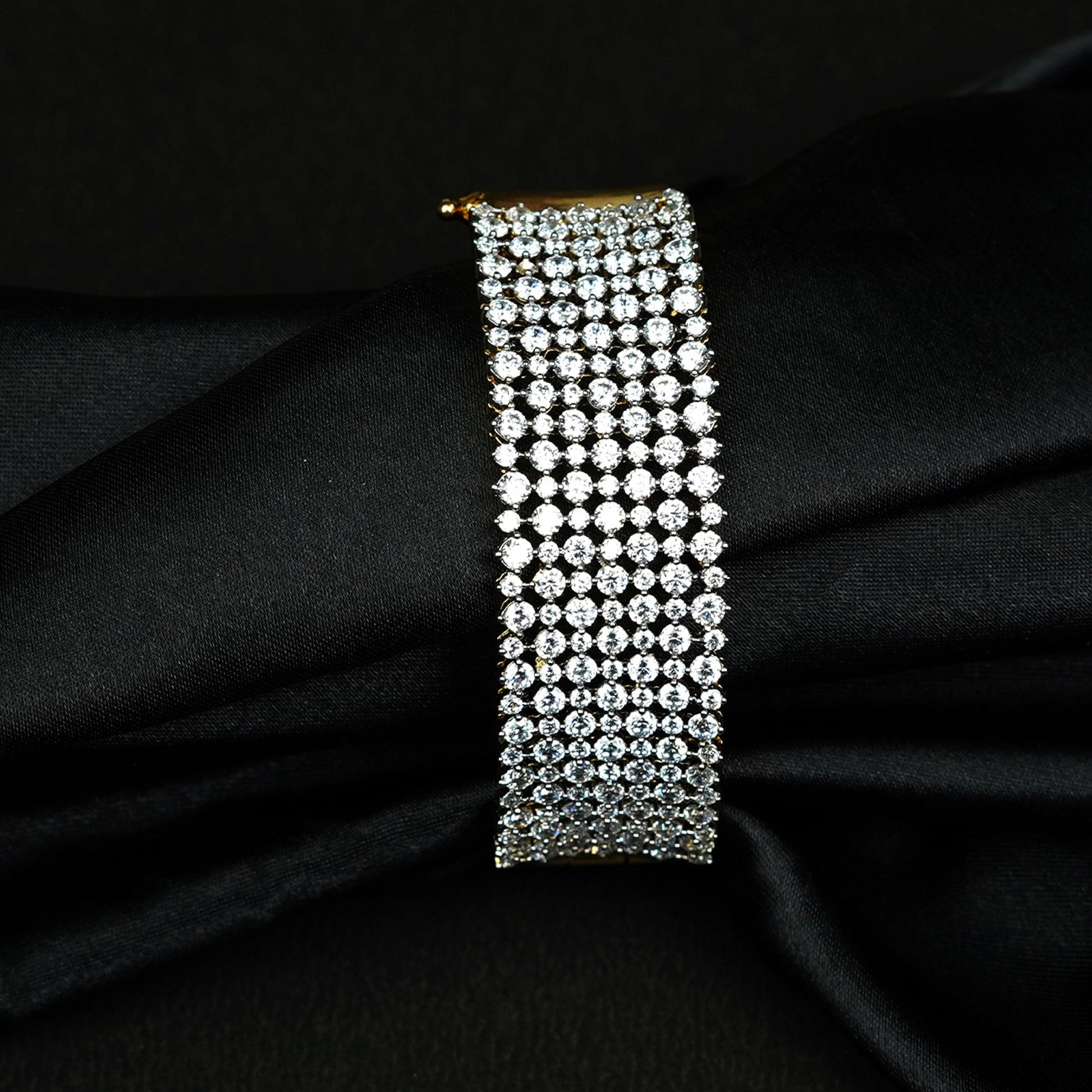 This Zevar Club statement bracelet is a true celebration of brilliance—featuring 22K gold plating and rows of handset AAA Cubic Zirconia for a radiant, bold look. A handcrafted luxury piece for women & girls—perfect for luxe parties look and special occasions.