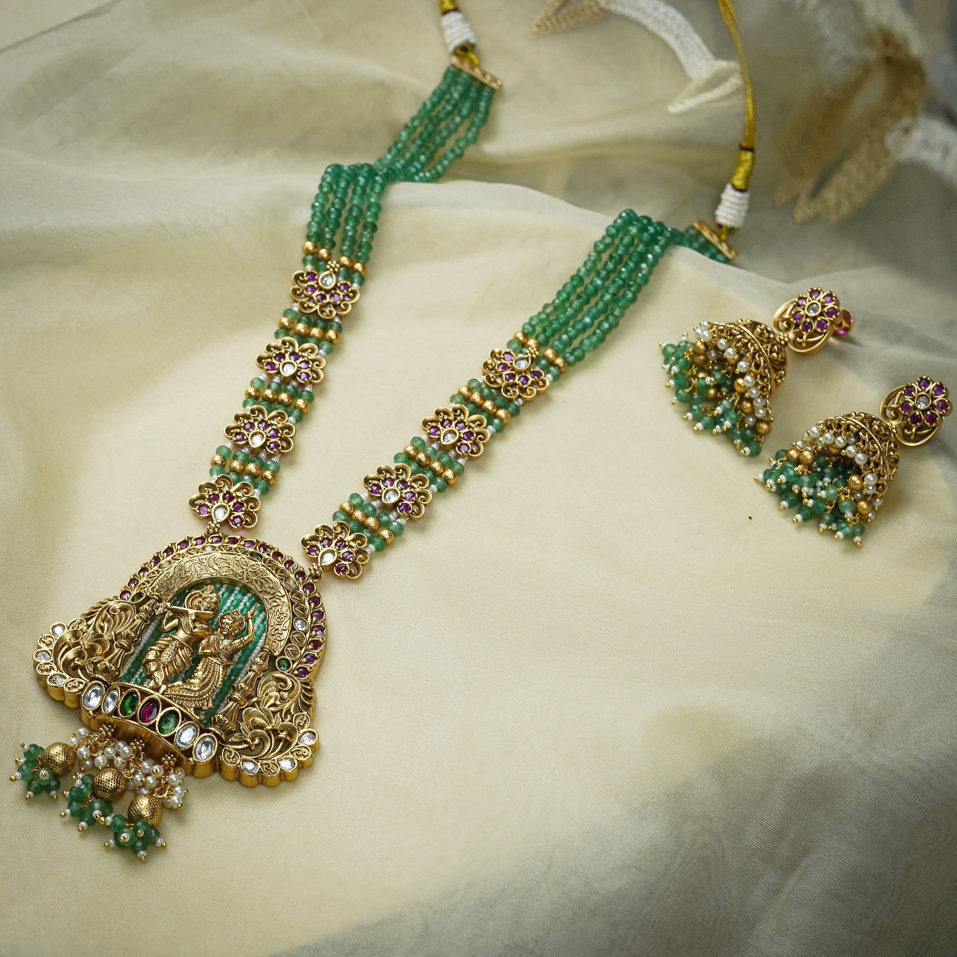 This luxurious temple jewellery set features a divine Krishna Radha pendant, studded with ruby and white kundan, strung on layered green beads. A timeless bridal and festive masterpiece.