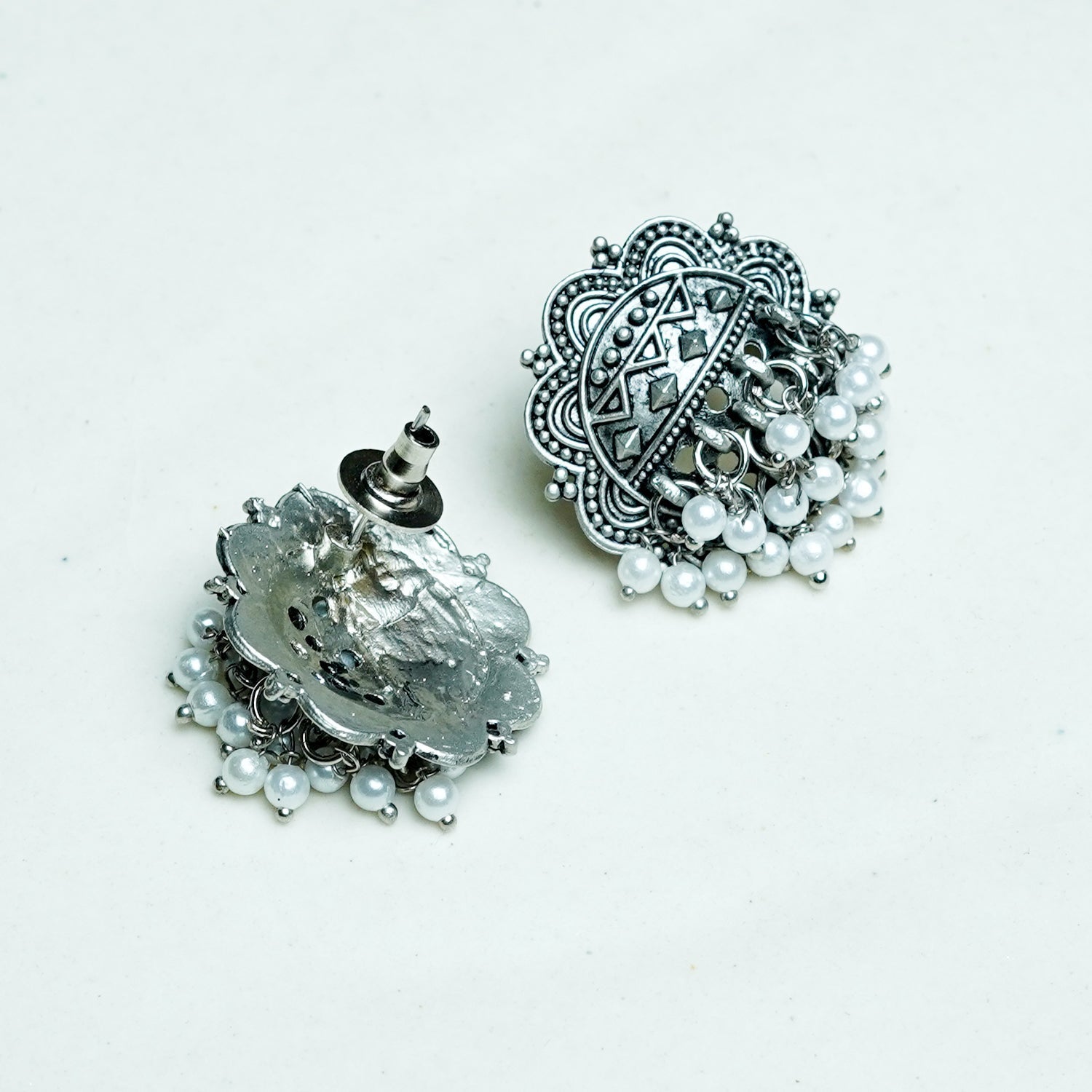 These antique gold-toned statement stud earrings feature a carved half-moon design with geometric detailing and white pearl clusters—perfect for festive styling, temple jewellery looks, and traditional elegance.