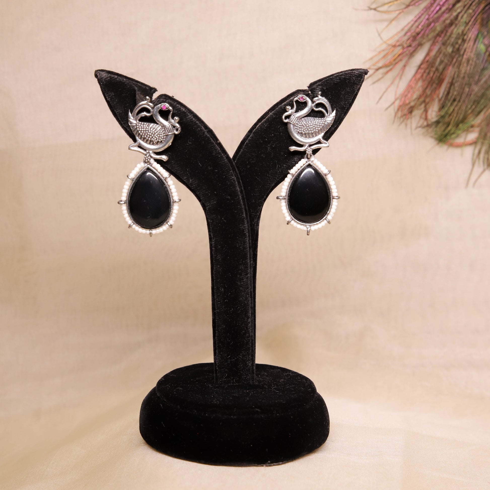 Zevar Club Black Silver Tribal Wear Based Peacock Motif Drop Earrings