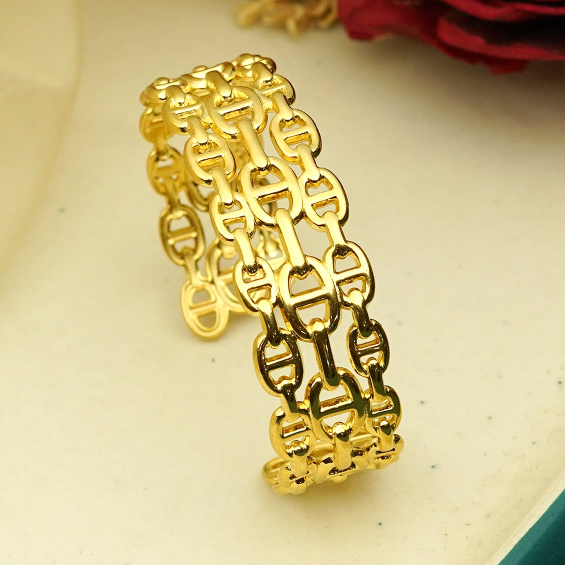 This gold tone cuff bracelet features a stylish open chain-link design crafted in stainless steel. A tarnish free waterproof statement accessory for women & girls for special occasions and party looks.