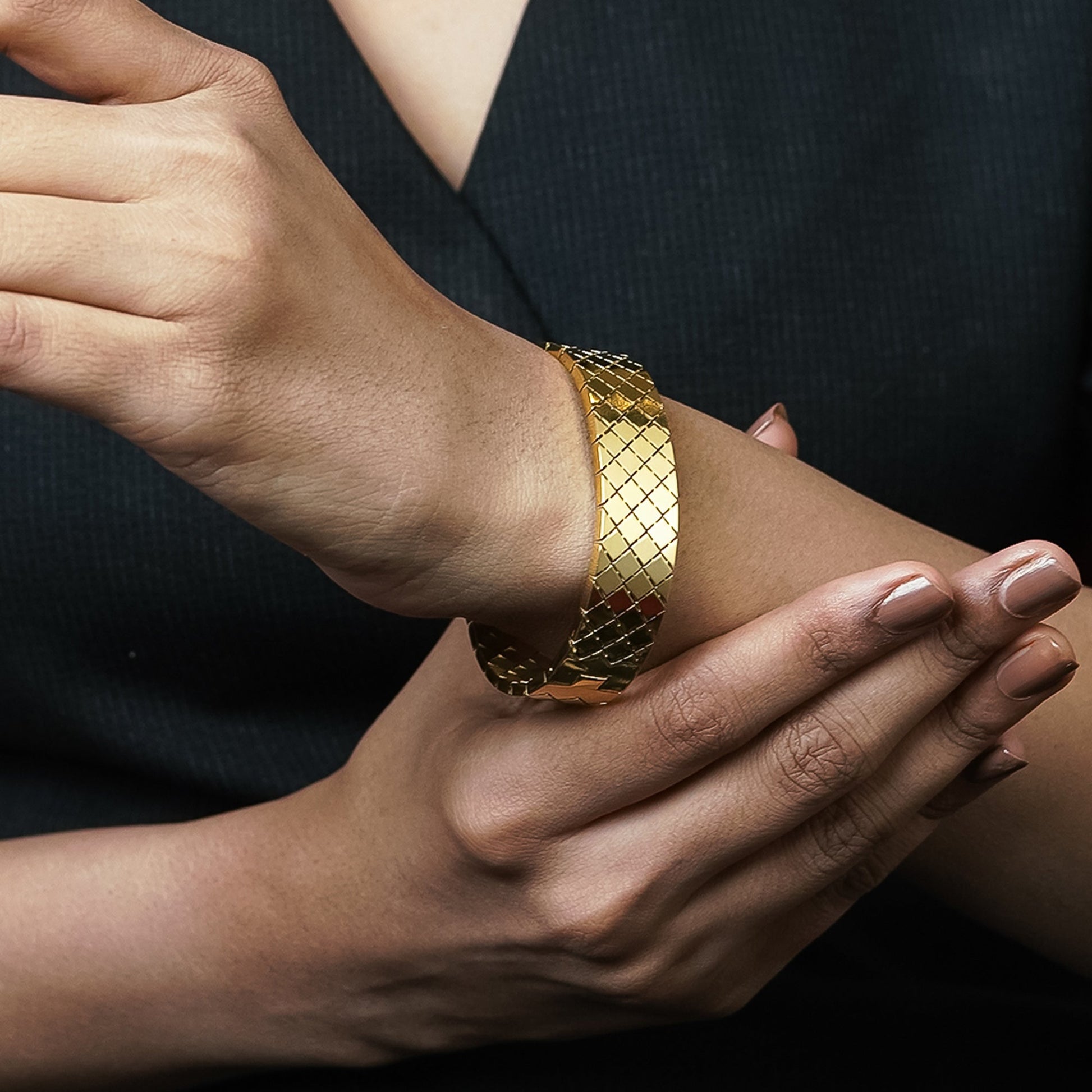 This gold tone openable bracelet features a criss-cross textured design crafted in stainless steel. A tarnish free waterproof and stylish statement piece for women & girls on special occasions.
