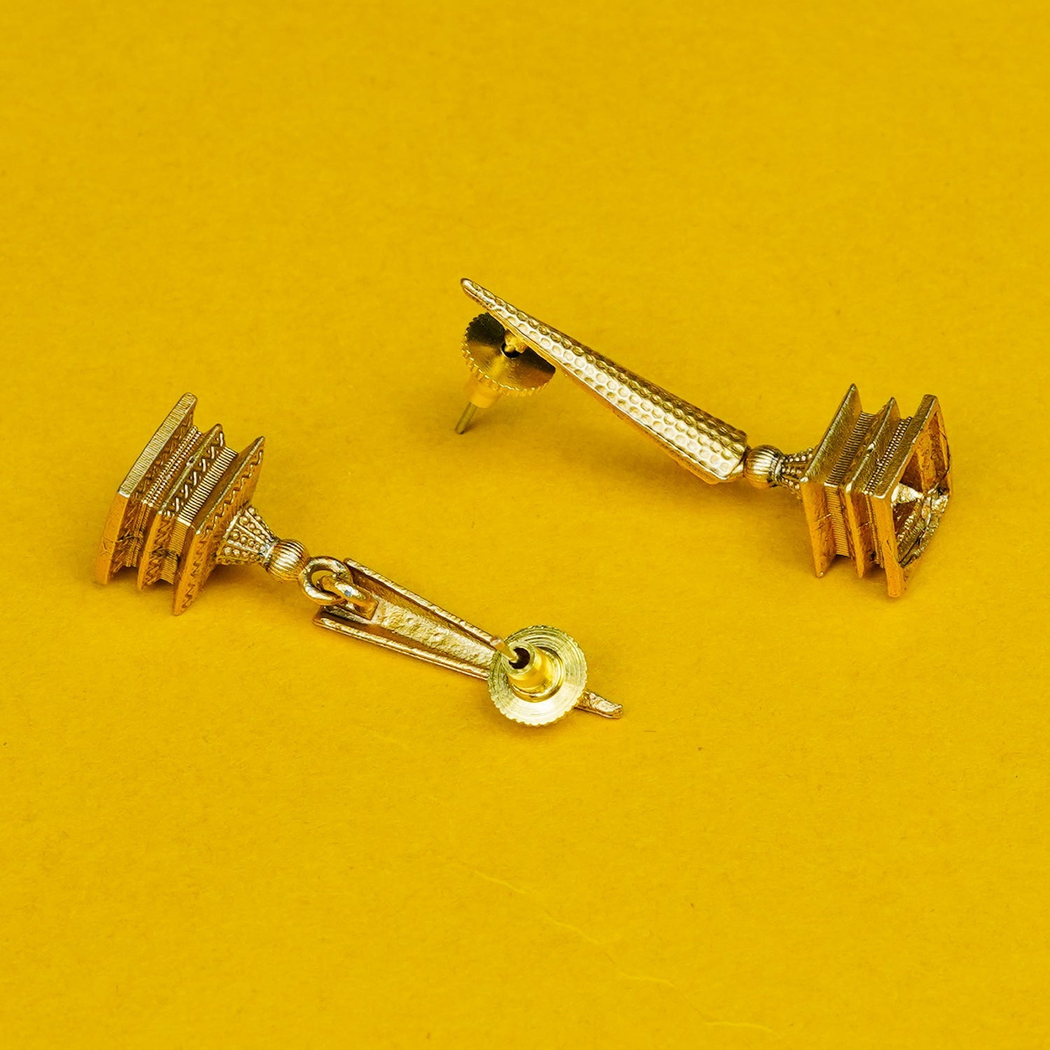 Bold and sculptural, these gold-toned brass statement earrings feature a textured cone top and a temple tower-inspired base—crafted to make an artistic impression for festive and cultural styling.
