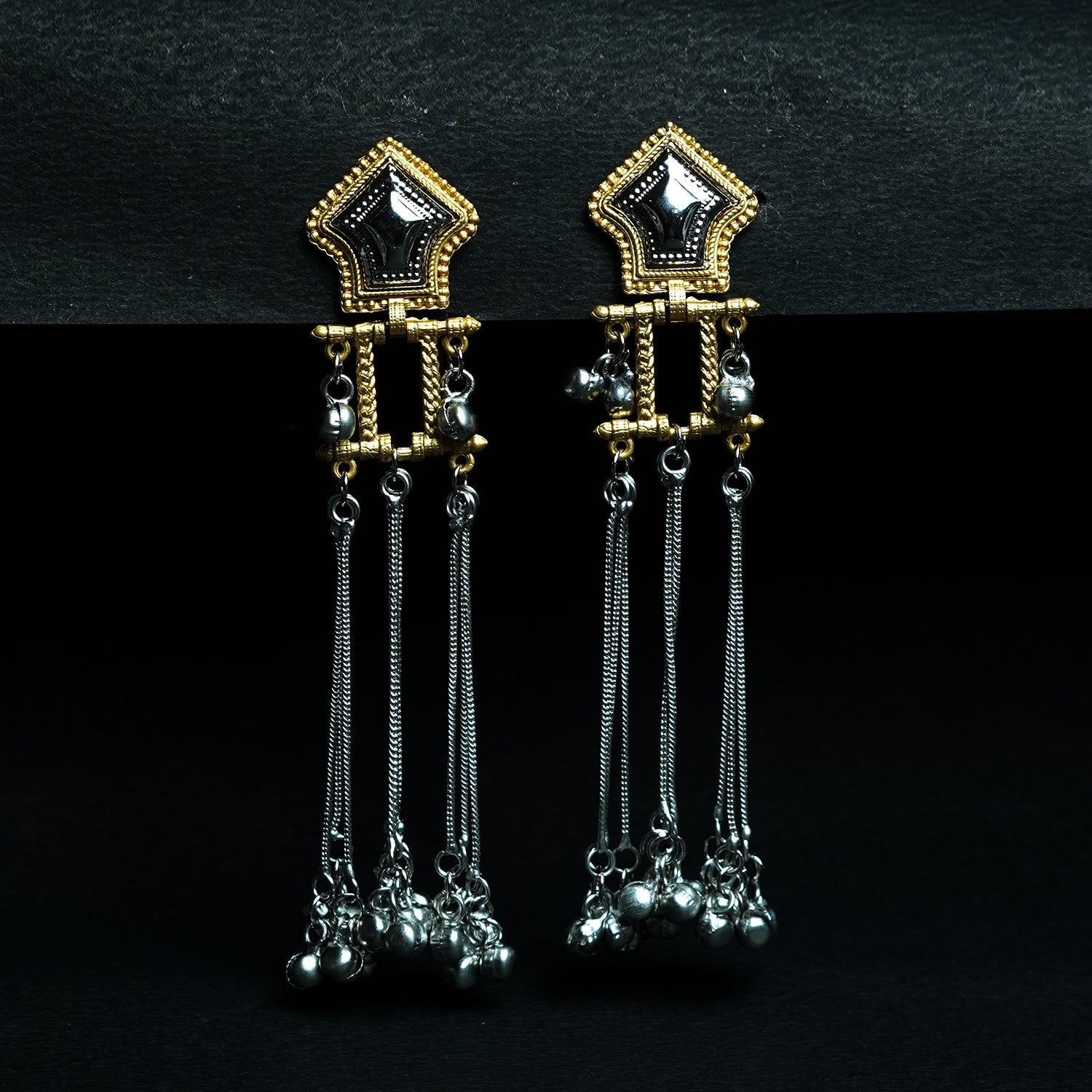 These oxidised shoulder duster earrings feature a black enamel top, antique gold detailing, and silver chain danglers for a bold festive statement look.