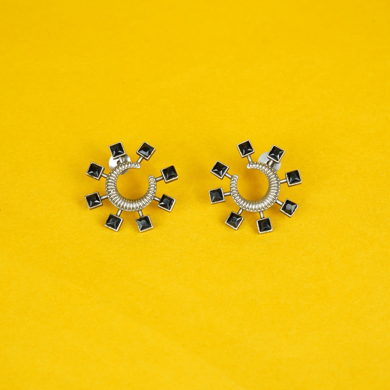 Zevar Club’s oxidised silver-plated half-hoop earrings feature a textured semi-circular base and bold black square-cut AD studs. A trendy and premium pick for women & girls, ideal for parties look and special occasions.