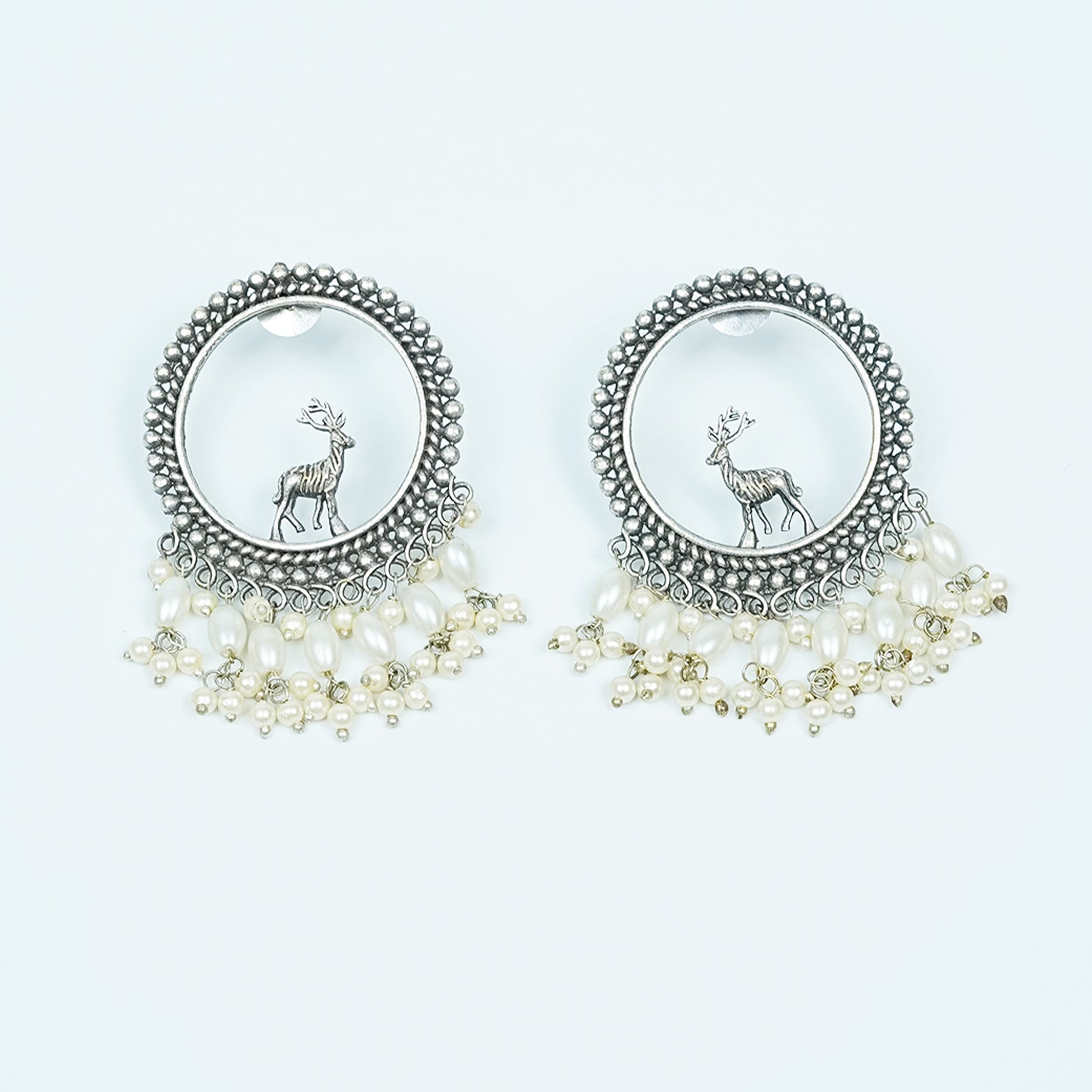 Zevar Club presents oxidised silver-plated round earrings featuring a central deer motif and white pearl bead hangings. A unique and traditional pick for women & girls, perfect for festive & wedding wear.