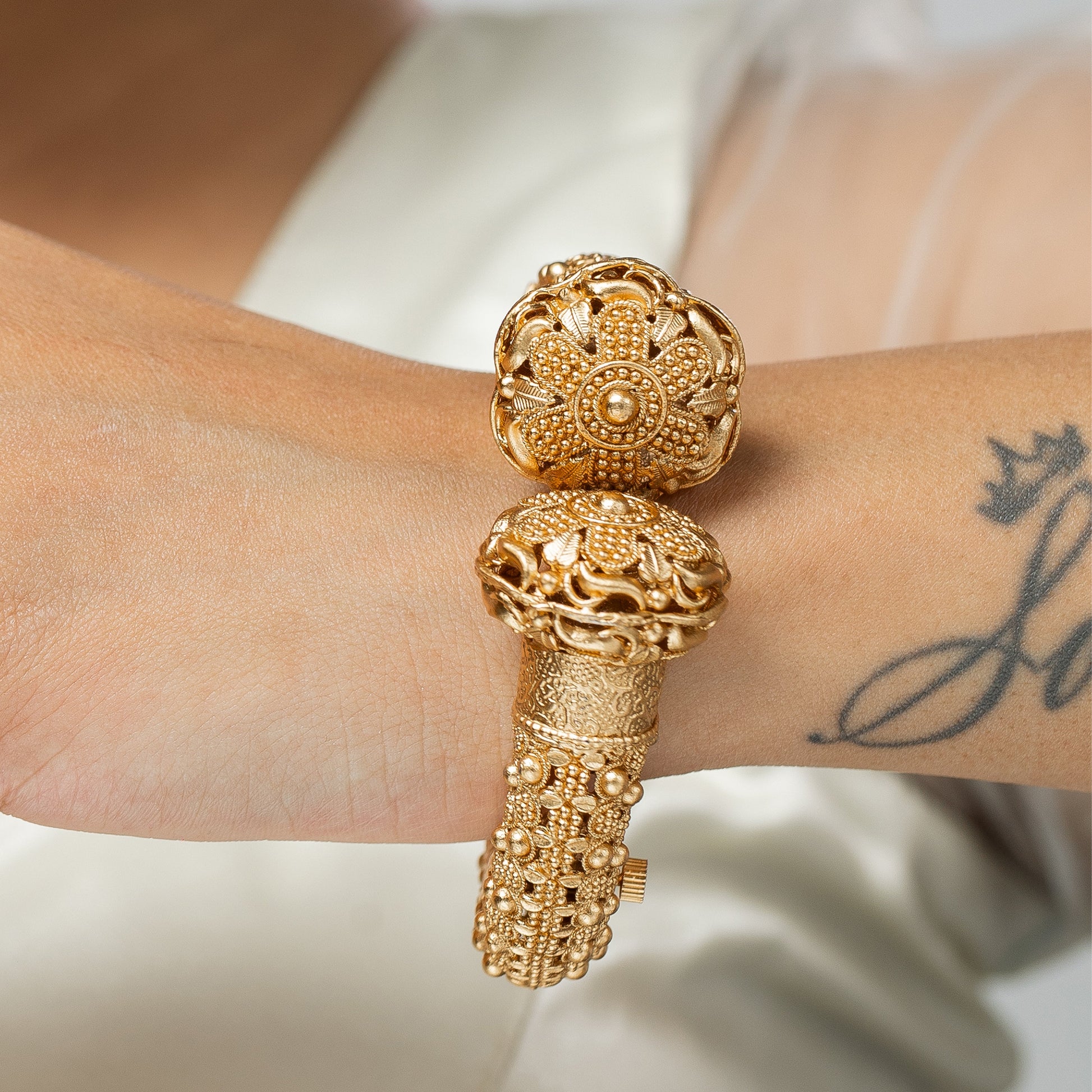 Indulge in luxury with our Zevar Club Rajwada Antique Openable Handcrafted Bracelet. This exquisite piece is meticulously crafted for an exclusive look. Showcasing a unique openable design, it combines the elegance of antique style with the intricacy of handcrafted details. Elevate your wardrobe with this sophisticated and timeless bracelet.