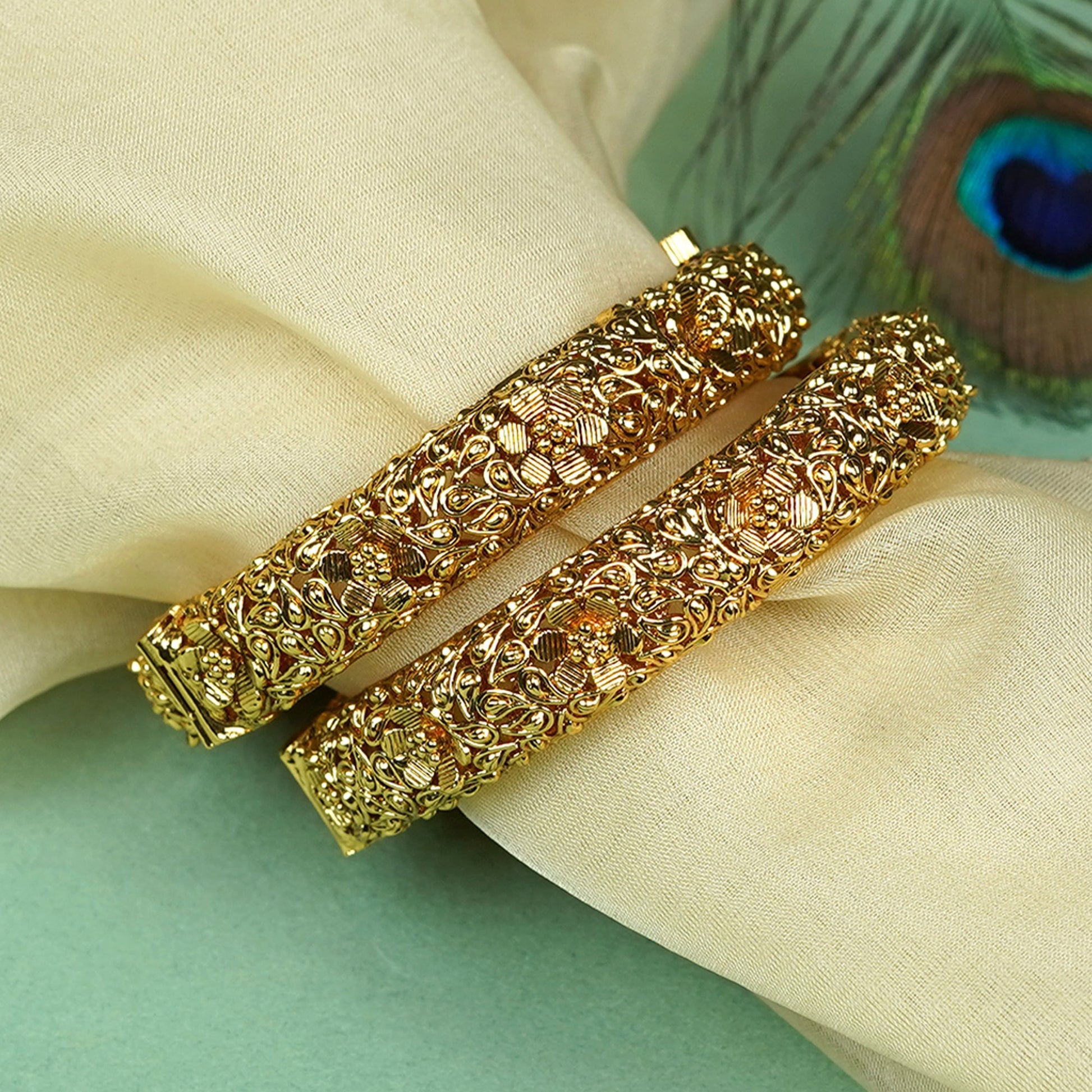 Zevar Club Set of 2 22K Gold-Plated Floral Textured Bangles with Light Golden Stone Studded Design for Women
