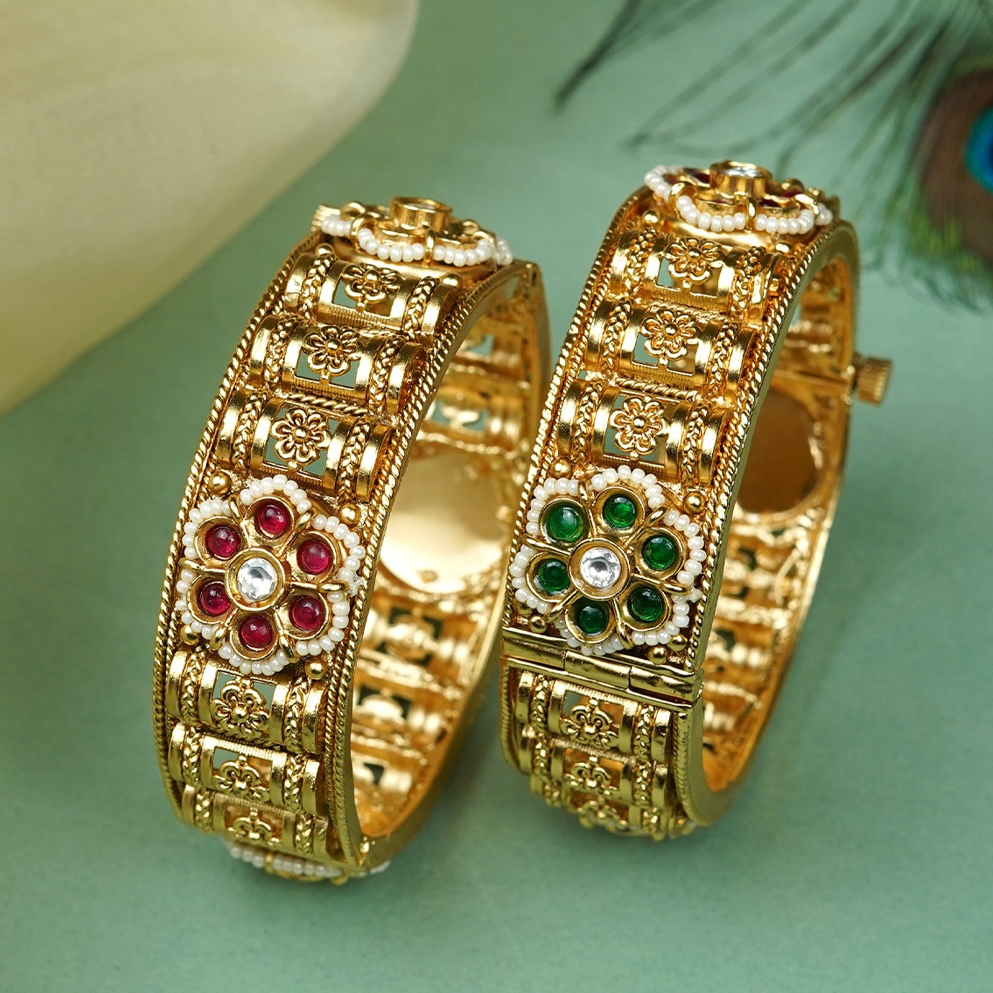 Zevar Club Set of 2 22K Gold-Plated Handcrafted Rajwadi Bangles with Ruby Red & Emerald Green Floral Kundan Motif