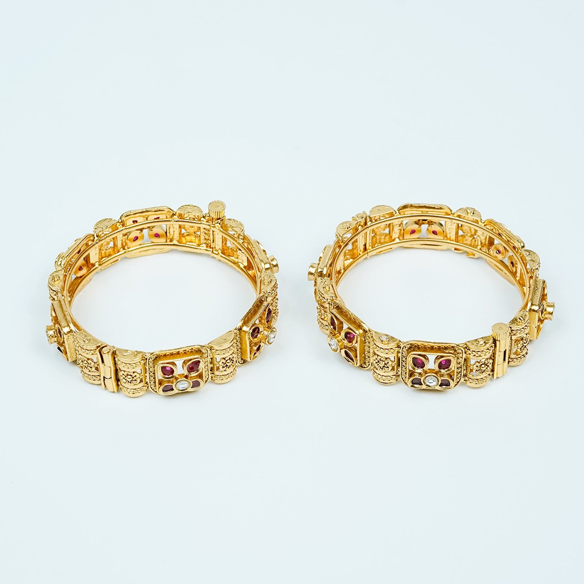 Zevar Club Set of 2 22K Gold-Plated Handcrafted Rajwadi Bangles with Ruby Red Stones & White Accents for Women